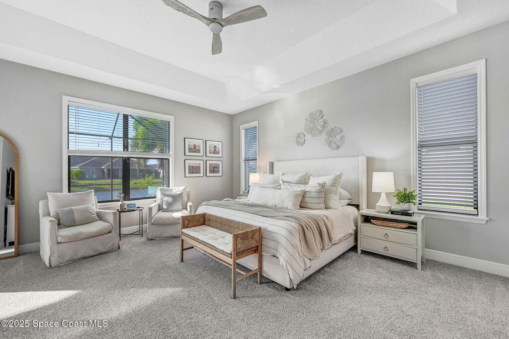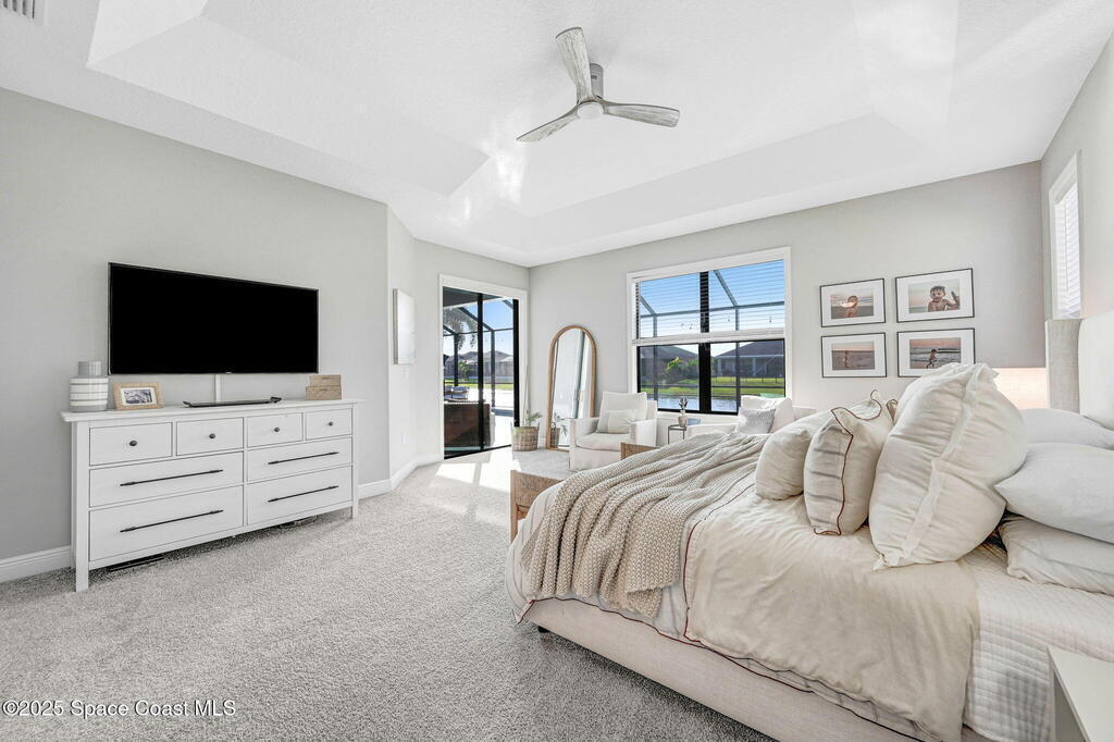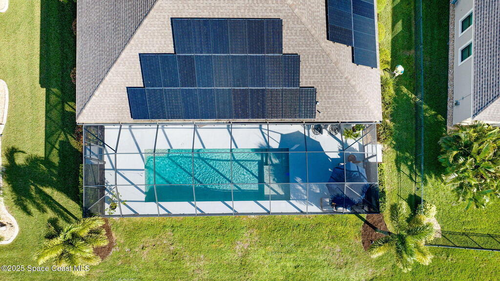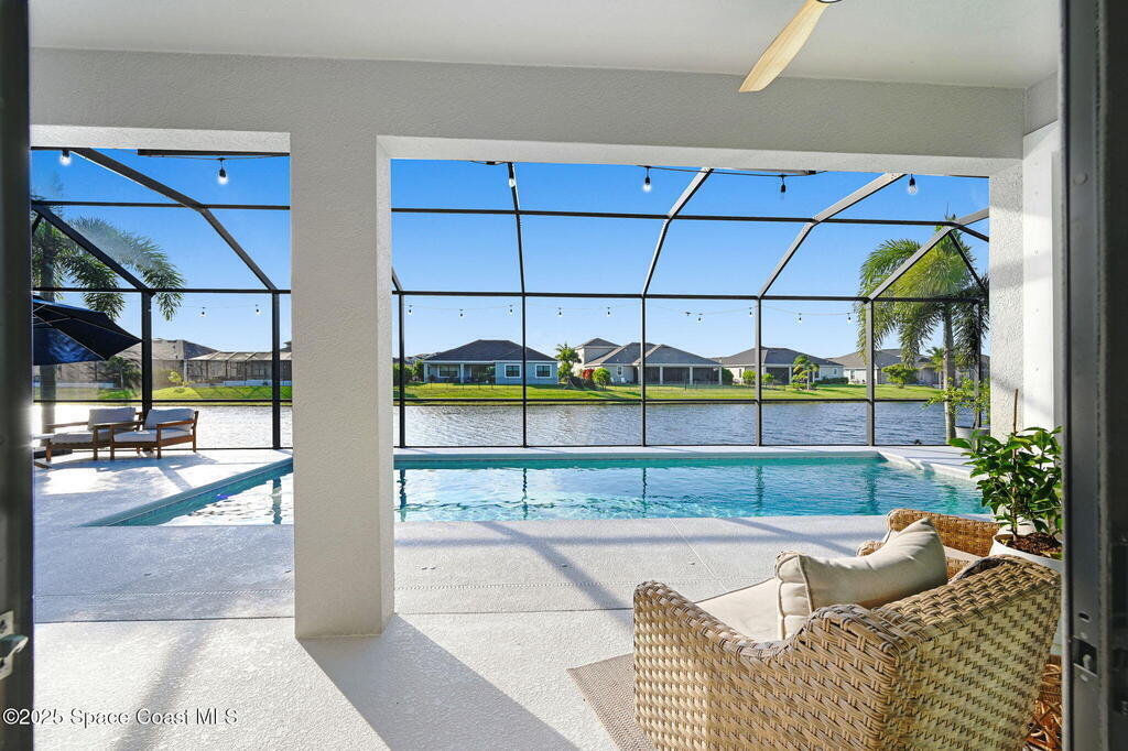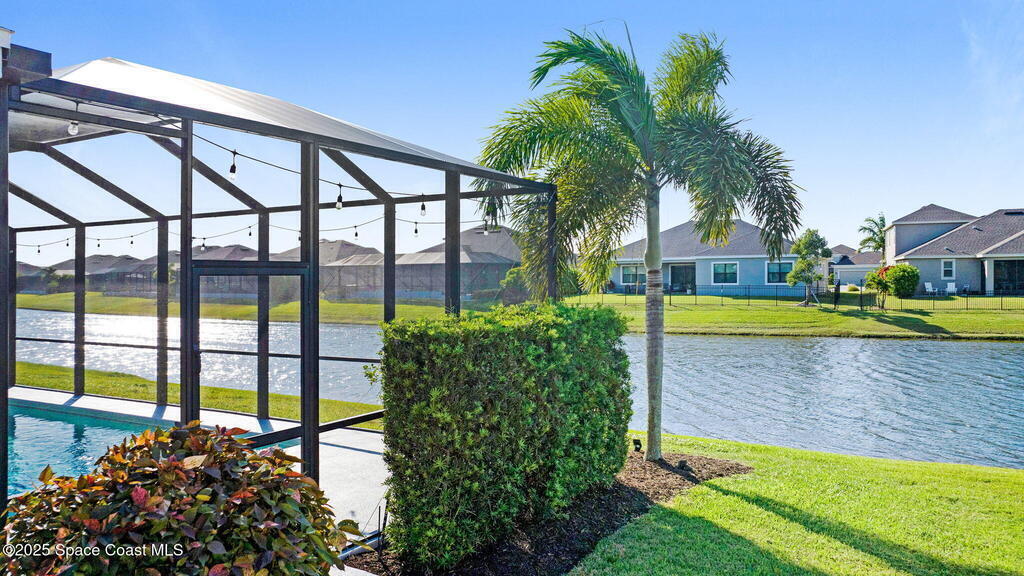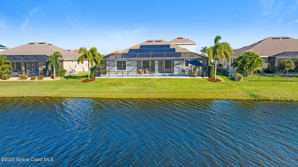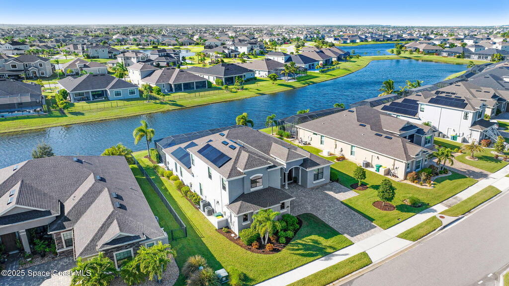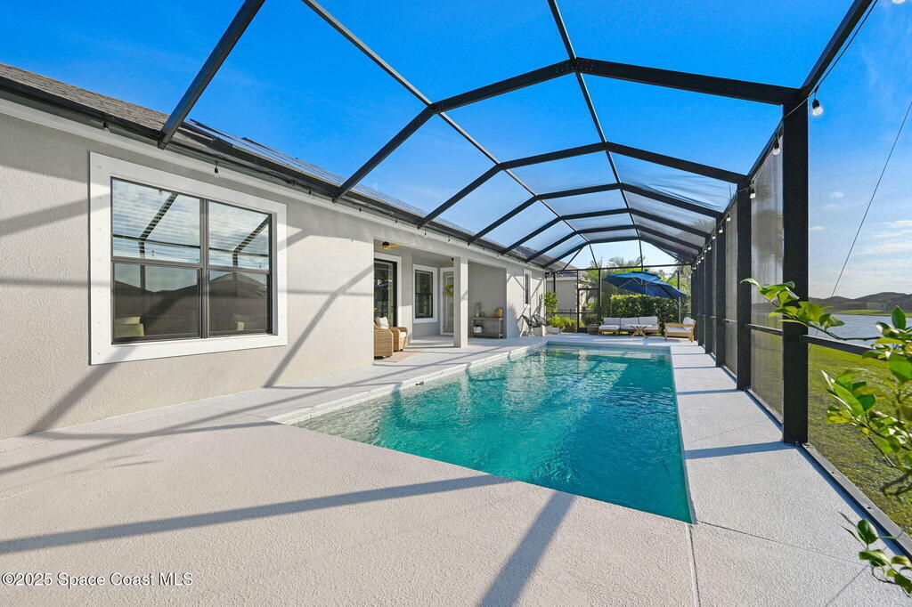 Stunning lakefront Montgomery II model featuring 5 bedrooms, 4 full baths, pool, and home office! This spacious smart home offers modern comfort and convenience with phone-controlled lighting, locks, appliances, and remote blinds. The primary suite is on the first floor for easy living, while an upstairs suite with a bonus room is perfect for guests or a media space. Enjoy an upgraded electrical system with a vehicle charging outlet and paid-off solar panels for very low electric bills. The open-concept layout flows seamlessly to the screened pool and patio overlooking the lake. The oversized 2-car garage provides extra space for a golf cart or storage, and the paver driveway adds great curb appeal. Located in one of the area's most popular communities, residents enjoy resort-style amenities including multiple pools, playground, pickleball, tennis, and basketball courts. Luxury, efficiency, and lifestyle--all in one exceptional home!