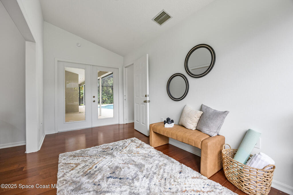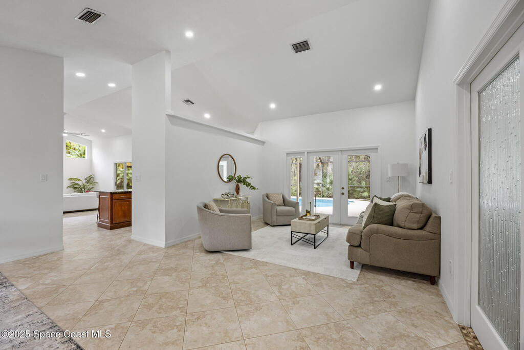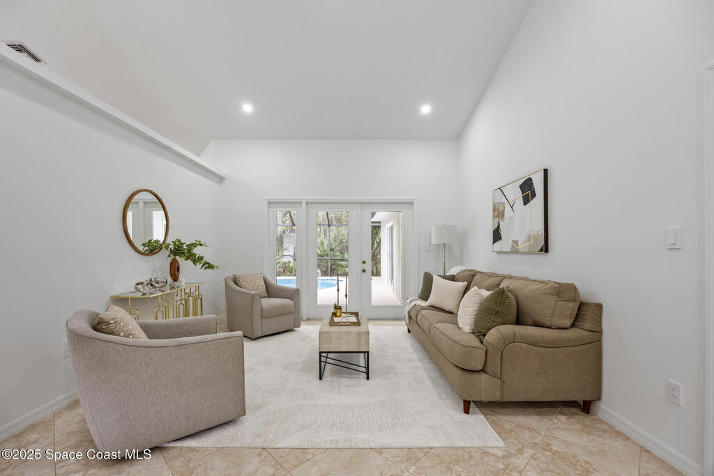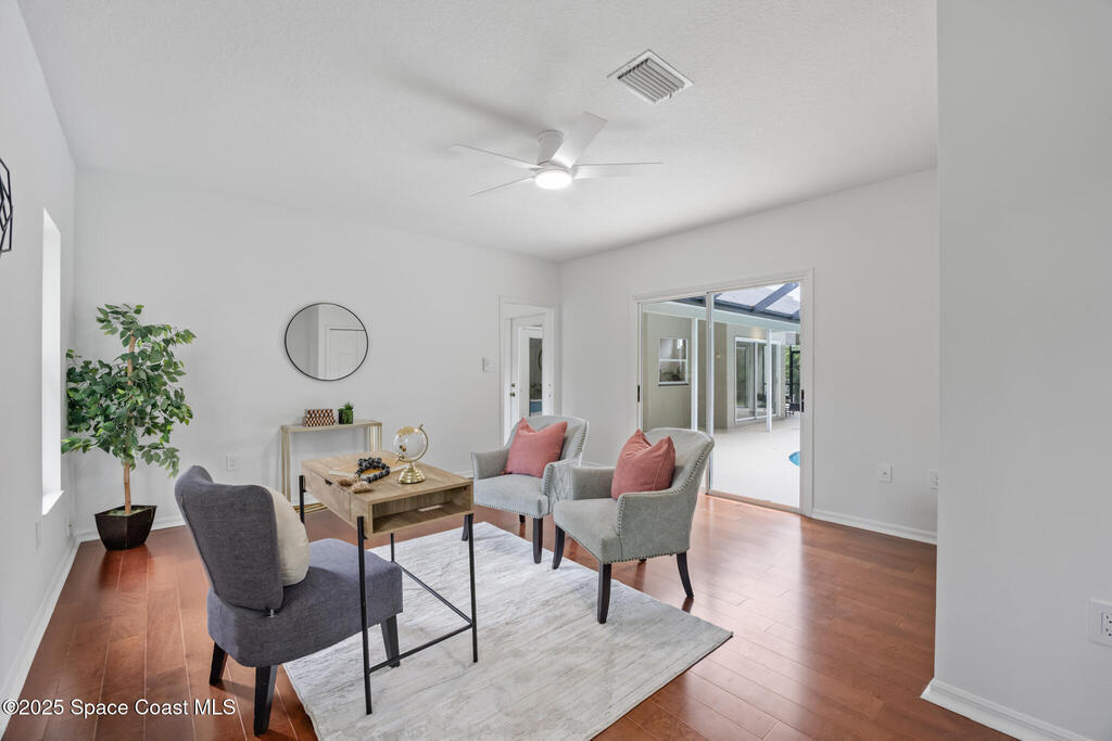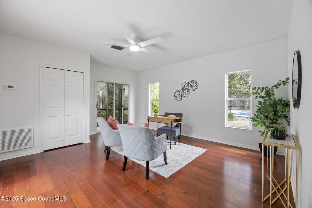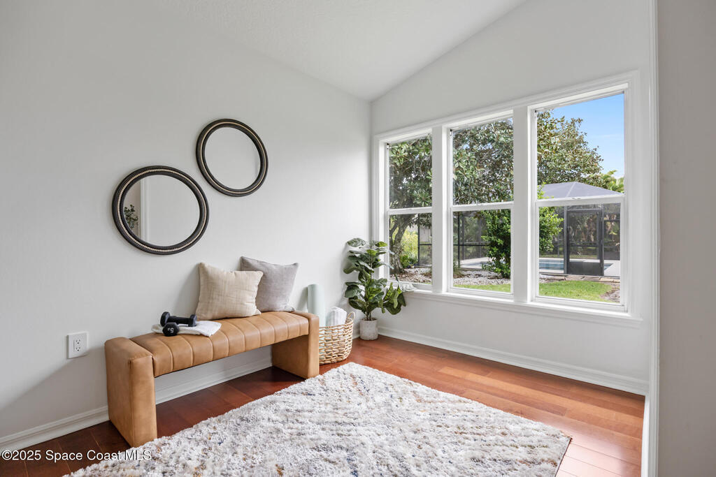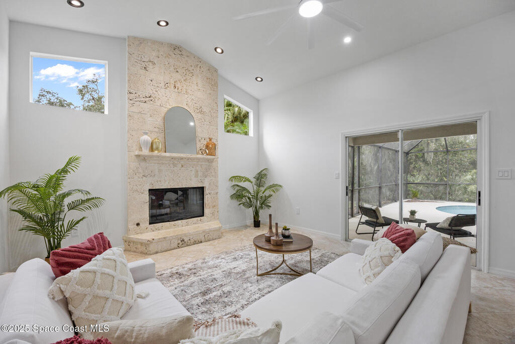 Beautiful home in the gated Baytree community on a peaceful preserve lot offering privacy and natural views. Features a spacious updated kitchen with gas range, cherry cabinetry, granite countertops, and stainless-steel appliances. The family room includes a natural stone fireplace and opens directly to the screened pool and patio for seamless indoor-outdoor living.Enjoy a private backyard oasis with covered dining and lounge areas, accessible from the family room, living room, and master suite. The master bedroom features hardwood floors, cathedral ceilings, French doors, and a sitting area. The bright master bath includes a walk-in shower and ample counter space.The fourth bedroom has its own exterior entrance and separate HVAC, ideal for use as a private guest suite or professional office with designated access.