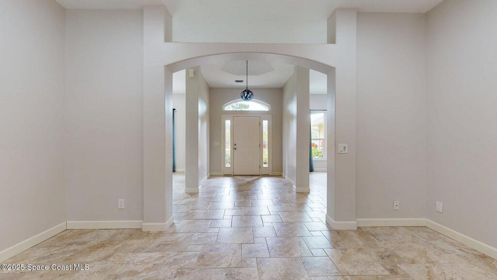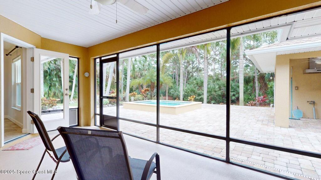 This gorgeous home is better than new!! Boasting10 ft ceilings and was renovated inside and out in 2017! Walls were removed, all new lighting and custom porcelain tile was installed along w/ new double-pane windows and doors. In 2024, new roof, insulation, gutters, water heater and brick pavers. Kitchen was redesigned featuring custom maple cabinets w/ pull out features, top of the line appliances and quartz counter tops. Both baths boast the maple cabinets & quartz counters. Primary has a huge customized shower! Custom porcelain tile throughout! Large screened lanai overlooks a breath taking, private and peaceful oasis w/ beautiful palms, brick pavers surrounding an in ground heated spool & a poured concrete work shop building w/ a 5X8 hurricane proof door. Covered space for a BBQ. Yard is fully fenced w/ a 14ft gate, perfect to park a boat or RV. This small, one circle, private community is located near the boat ramps and nature preserves. Don't miss out on this masterpiece!!!!.