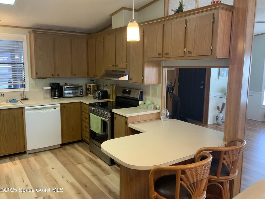 Are you ready to explore a stunning, move-in-ready manufactured you home? This fully furnished home is adorned with beautiful accessories & offers a super floor plan. As you enter through the front door, you'll be greeted by a spacious living room with gorgeous flooring and plenty of windows, all equipped with storm shutters. The dining room features a large, china cabinet with ample storage. The kitchen boasts an eat-in area, a new stainless steel refrigerator and stove, & an abundance of cabinets for all your needs. You'll also find an indoor laundry room with a washer, dryer, and cabinets on both sides. The master bedroom includes two walk-in closets, one of which is very large. The master bath offers a walk-in shower, a spacio vanity, & a large wall mirror. Both bathrooms are updated with new high-efficiency toilets. The guest bedroom is generously sized and includes a walk-in closet. Enjoy the large elevated lanai furnished lanai & inside storage shed. NEW A/C
