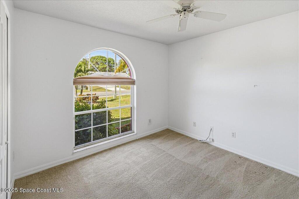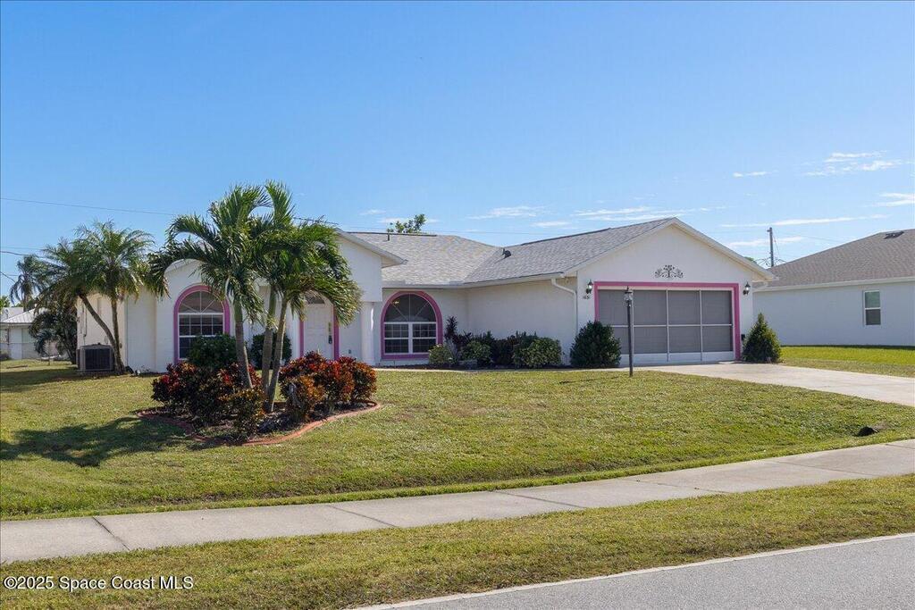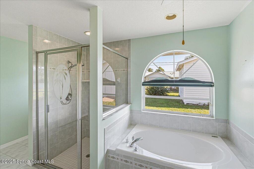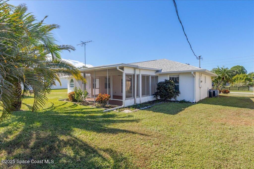 Welcome to this inviting Palm Bay home, featuring an open-concept living space with beautiful real granite in the kitchen and an effortless flow throughout. The bright breakfast nook provides a warm spot to start your day, while the primary bedroom offers generous space and soft, natural light. The primary bath includes both a walk-in shower and a relaxing soaking tub framed by an elegant arched window. A well-kept secondary bathroom continues the home's bright, fresh feel. Enjoy a spacious backyard with room to roam, complete with an electrically equipped shed. The screened porch offers a breezy place to unwind while overlooking the tropical greenery, and the in-unit laundry leads directly into the garage with removable sliding screen doors for added convenience. This well-maintained home blends comfort, functionality, and Florida living at its best.