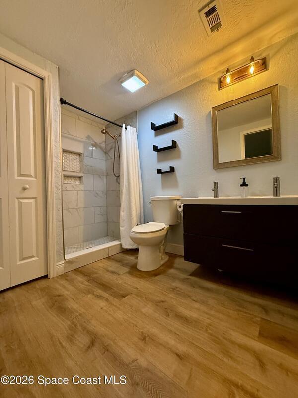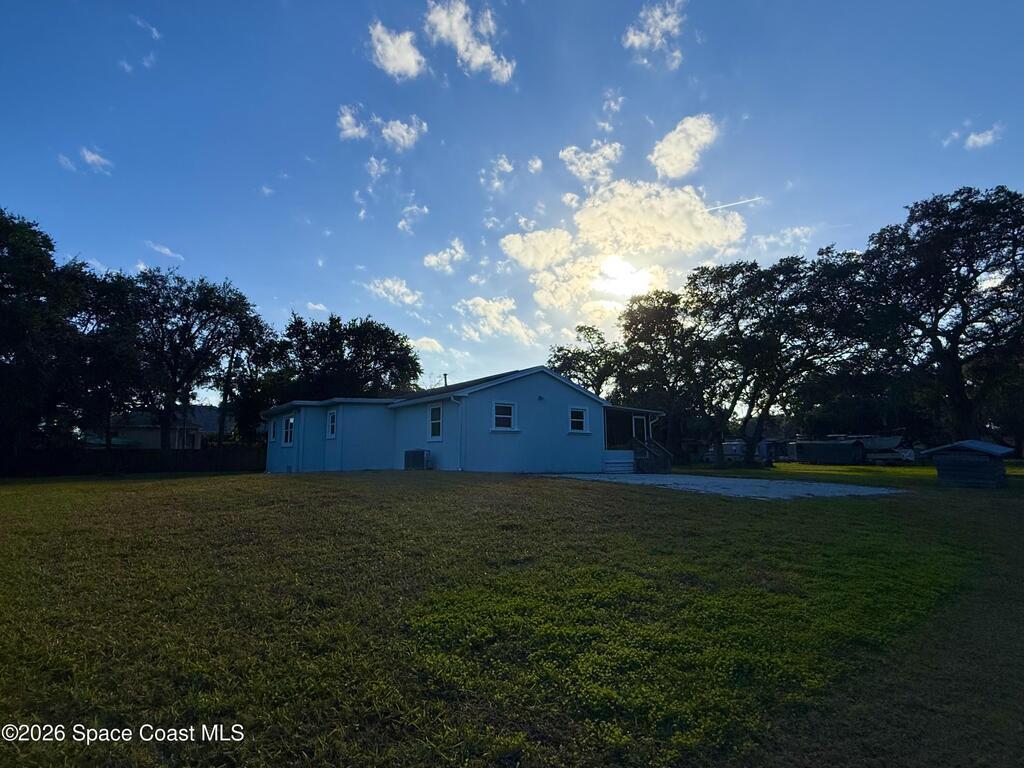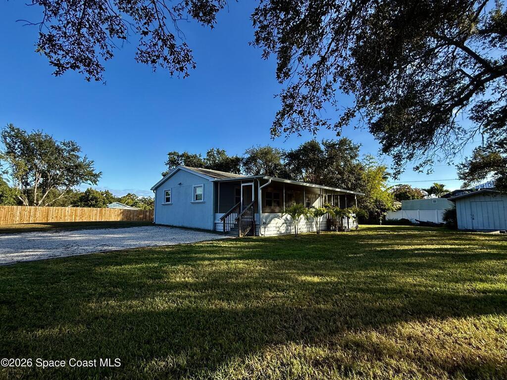 In the heart of Merritt Island! This beautiful 4-bedroom, 2-bath home combines modern updates with classic charm. This home is built on elevated land and is a few feet above ground with a raised base. Every detail has been refreshed -- from the stunning kitchen and bathrooms to the trim, baseboards, and flooring throughout. The spacious layout offers comfortable living with natural light in every room. Step outside to your inviting screened-in porch, perfect for relaxing or entertaining while overlooking the oversized lot. With plenty of room for outdoor activities, a garden, or even a future pool, this property offers endless possibilities. Conveniently located near top-rated schools, shopping, dining, and just minutes from the beaches -- this hidden gem won't last long!