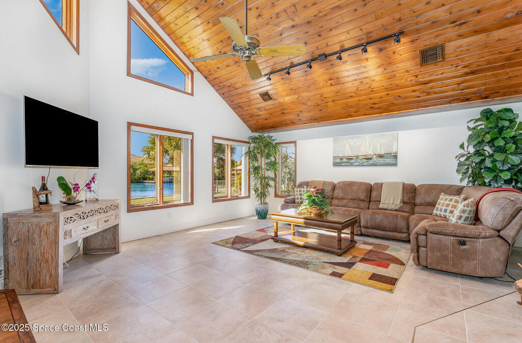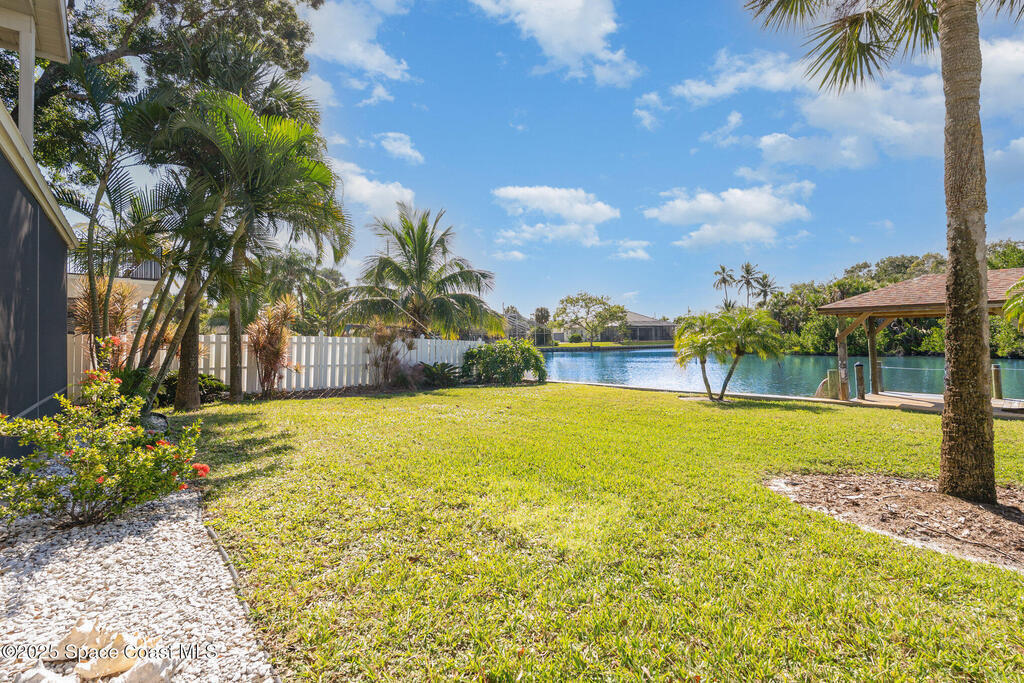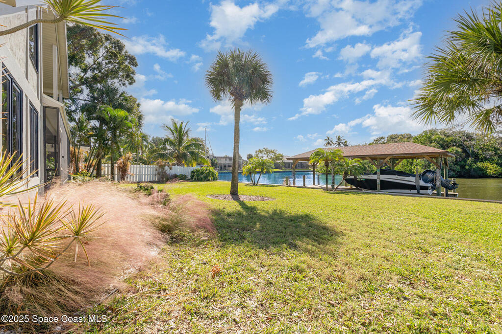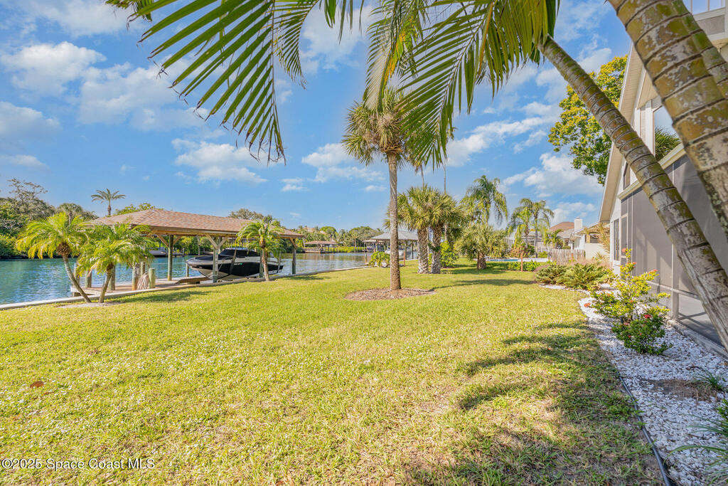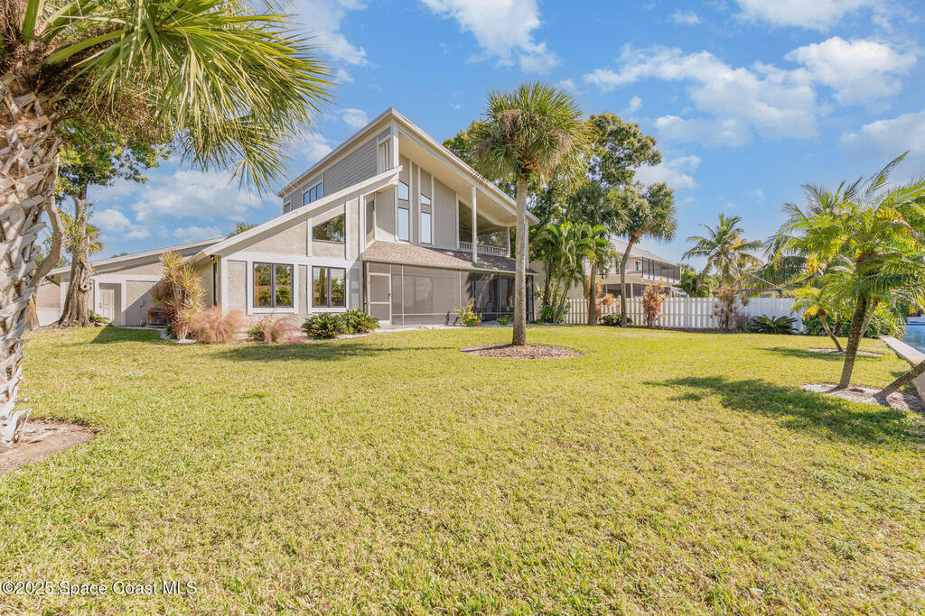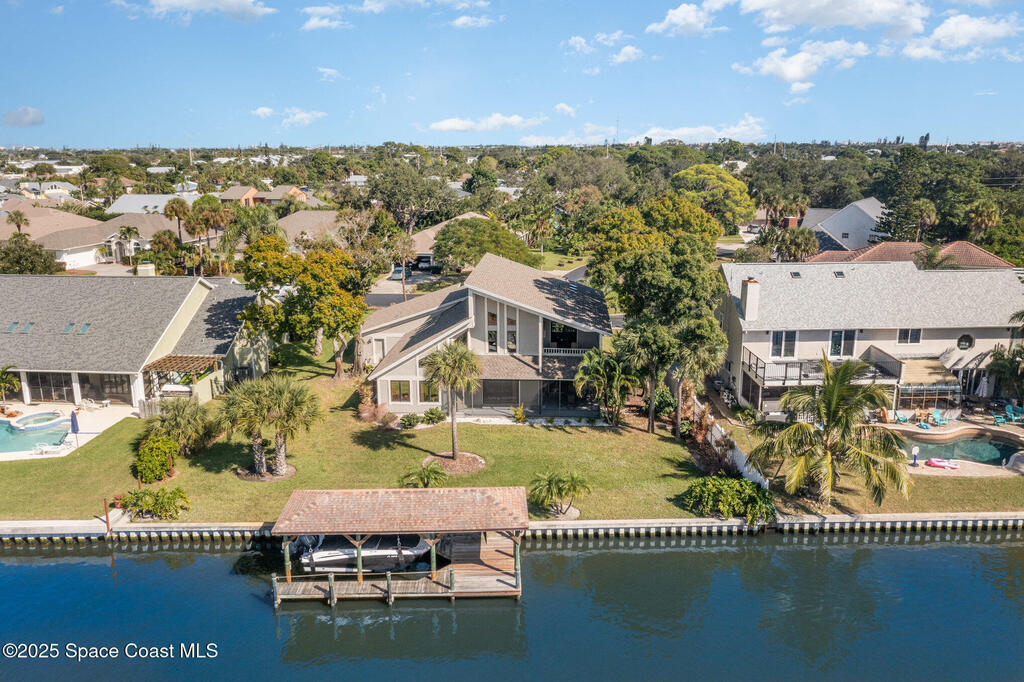 This distinctively unique private waterfront home in Spinnaker Point lies on the Grand Canal's southernmost corner situated on a deep water canal with over 100 feet of waterfront. The home's open concept floor-plan with high cathedral ceilings, large windows and sky lights provide beautiful water views and unique character with just the right amount of natural light. The home features four bedrooms and two baths. Recent updates include a new roof, seawall, covered dock, boat lift and a freshly painted exterior. The attached two car garage has a flex area in the rear for an extra workspace and plenty of storage. The covered boat dock and lift is great for protecting your boat and ease of use. Entry into the Banana river takes only 5 minutes!Athletic family members will love the quick access to walking, jogging and cycling the popular island trail. The beach is also just five minutes away!