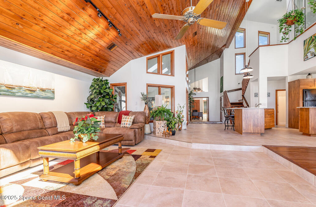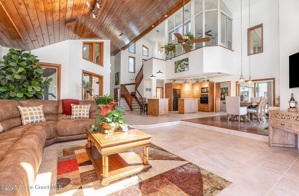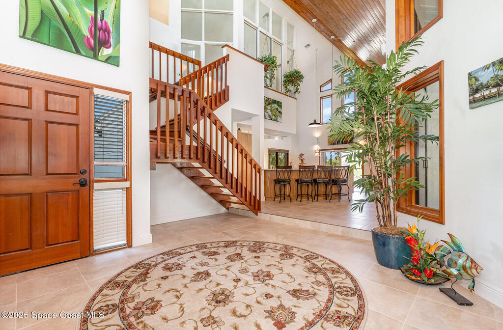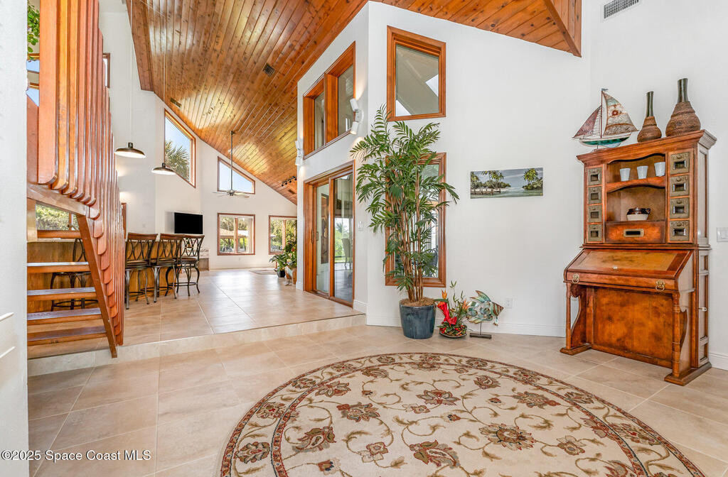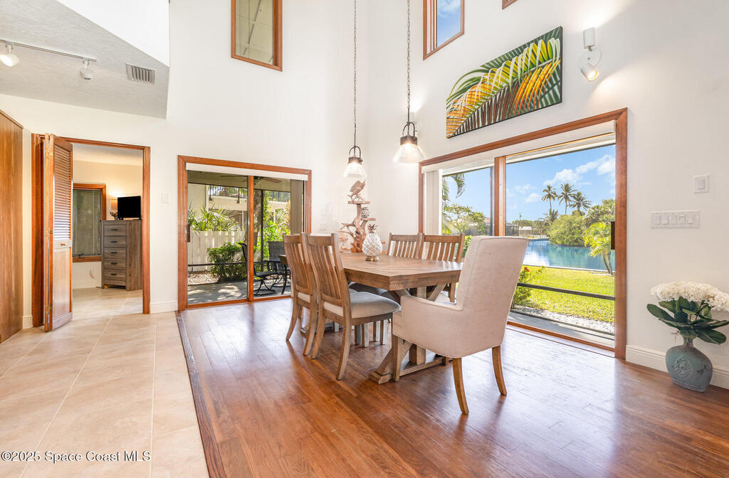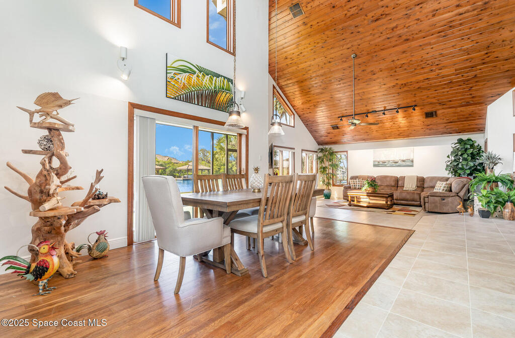 This distinctively unique private waterfront home in Spinnaker Point lies on the Grand Canal's southernmost corner situated on a deep water canal with over 100 feet of waterfront. The home's open concept floor-plan with high cathedral ceilings, large windows and sky lights provide beautiful water views and unique character with just the right amount of natural light. The home features four bedrooms and two baths. Recent updates include a new roof, seawall, covered dock, boat lift and a freshly painted exterior. The attached two car garage has a flex area in the rear for an extra workspace and plenty of storage. The covered boat dock and lift is great for protecting your boat and ease of use. Entry into the Banana river takes only 5 minutes!Athletic family members will love the quick access to walking, jogging and cycling the popular island trail. The beach is also just five minutes away!