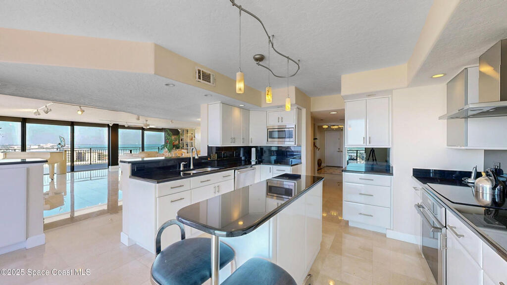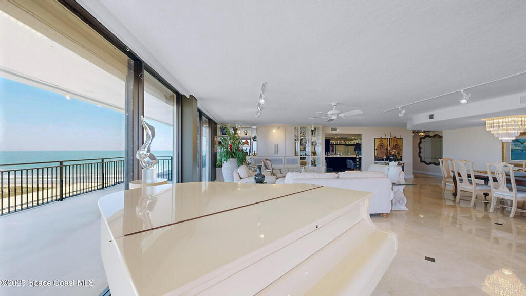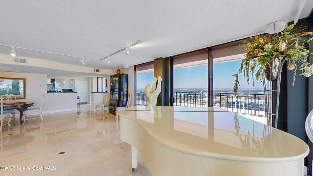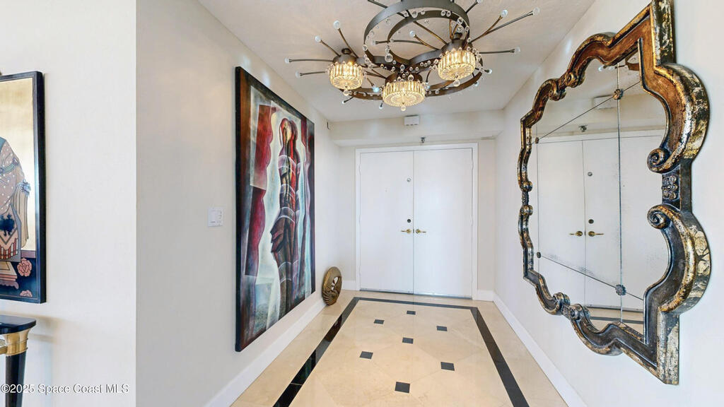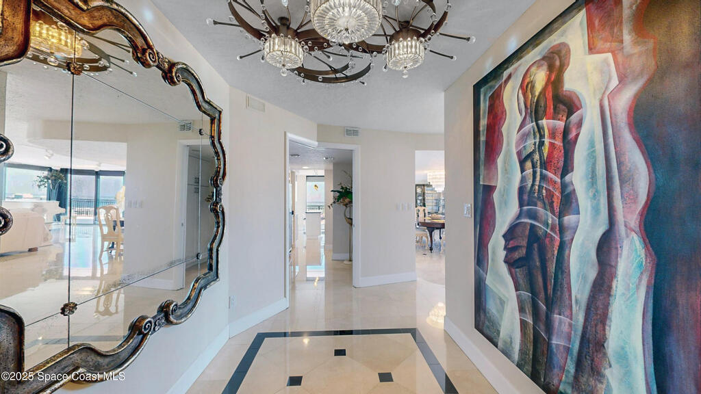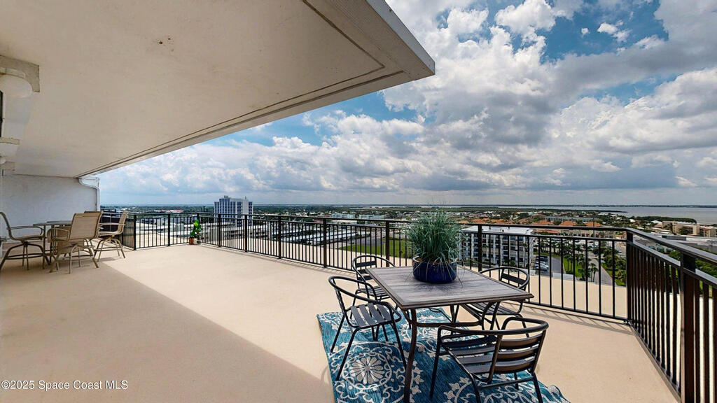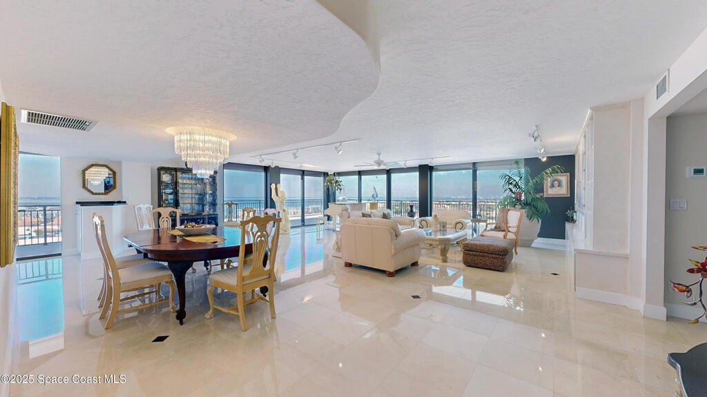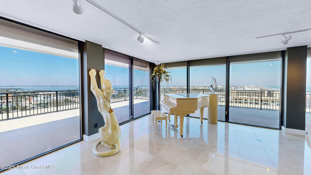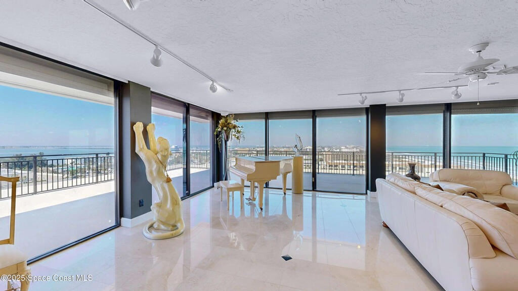 Welcome to luxury living at the exclusive 2100 Towers in the heart of Cocoa Beach. This breathtaking 13th-floor corner penthouse offers unparalleled, unobstructed panoramic views of the Atlantic Ocean, Thousand Islands, Banana River, Port Canaveral, and even a front-row seat to rocket launches from the Kennedy Space Center. Private expansive wraparound balcony -- perfect for relaxing, entertaining, and soaking in the coastal beauty. Inside, the unit exudes sophistication with gleaming marble floors, elegant custom lighting, designer chandeliers, and sleek finishes throughout. The open-concept living & dining areas flow seamlessly, featuring floor to ceiling windows and sliders with spectacular views, a custom book case with TV cabinet and ample storage. The gourmet kitchen, designed by award-winning interior designer Antoinette Prisco, boasts high-end appliances including a Subzero refrigerator, Thermador oven and large Avanti wine cooler. Features a 2 car garage plus storage unit!
