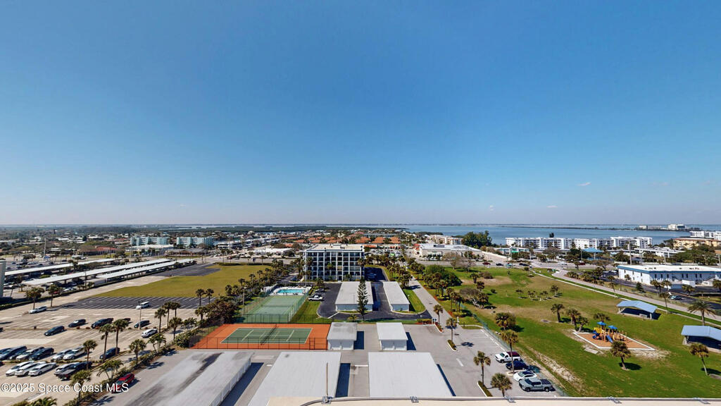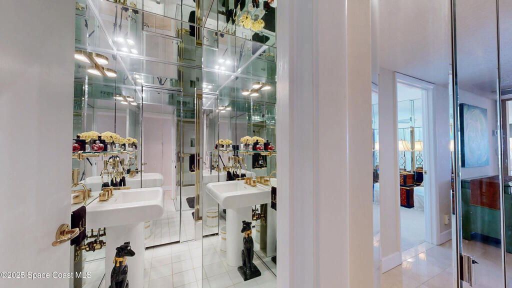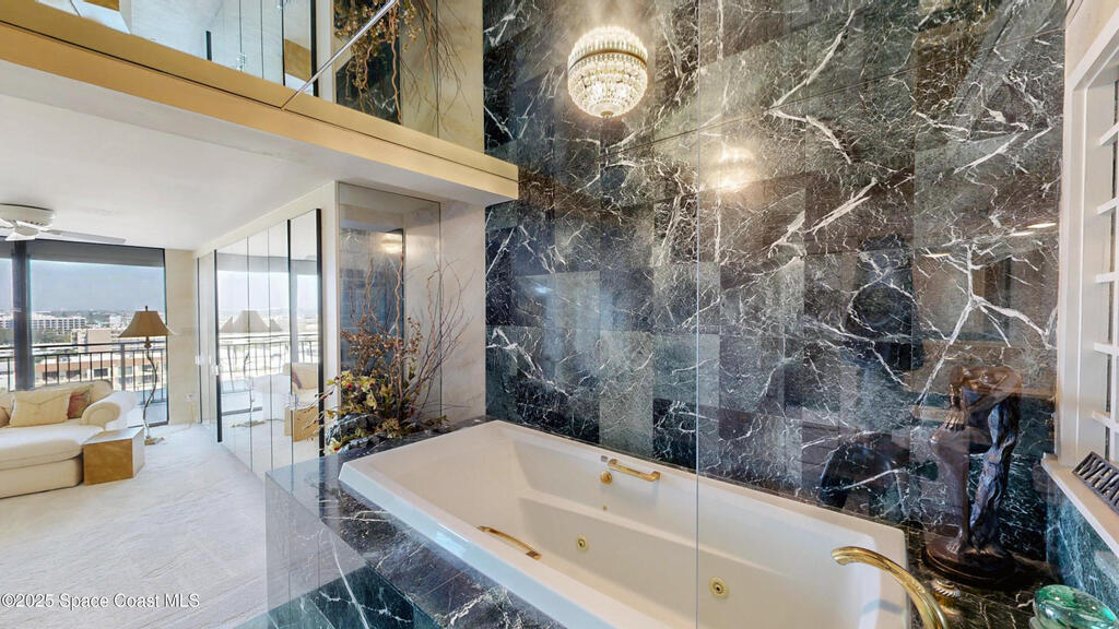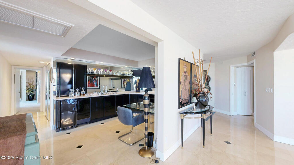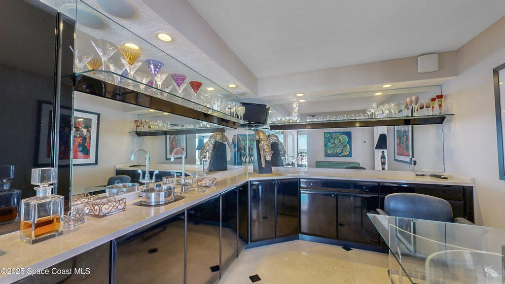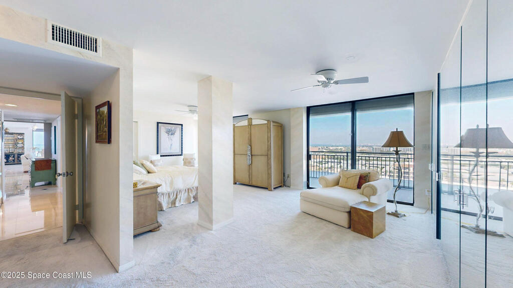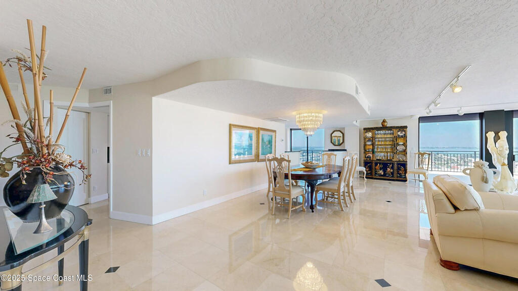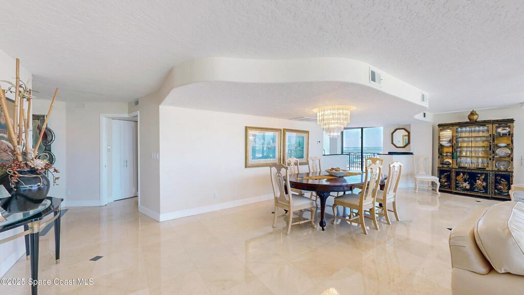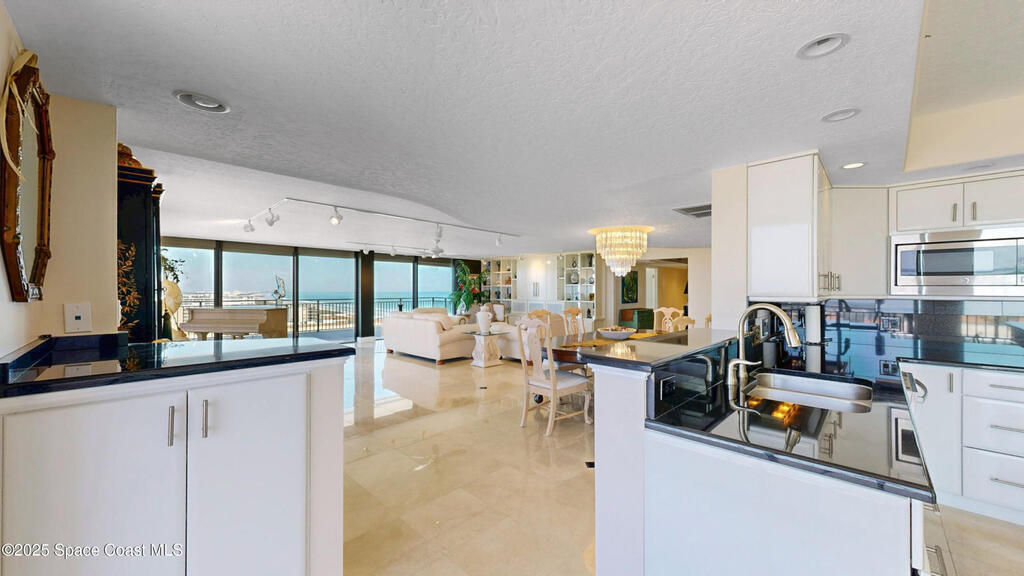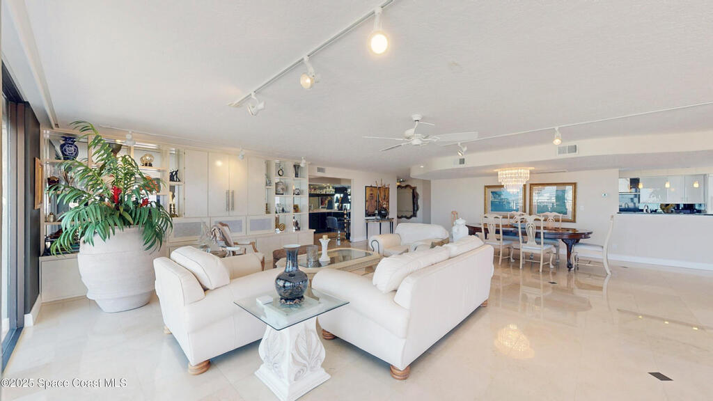 Welcome to luxury living at the exclusive 2100 Towers in the heart of Cocoa Beach. This breathtaking 13th-floor corner penthouse offers unparalleled, unobstructed panoramic views of the Atlantic Ocean, Thousand Islands, Banana River, Port Canaveral, and even a front-row seat to rocket launches from the Kennedy Space Center. Private expansive wraparound balcony -- perfect for relaxing, entertaining, and soaking in the coastal beauty. Inside, the unit exudes sophistication with gleaming marble floors, elegant custom lighting, designer chandeliers, and sleek finishes throughout. The open-concept living & dining areas flow seamlessly, featuring floor to ceiling windows and sliders with spectacular views, a custom book case with TV cabinet and ample storage. The gourmet kitchen, designed by award-winning interior designer Antoinette Prisco, boasts high-end appliances including a Subzero refrigerator, Thermador oven and large Avanti wine cooler. Features a 2 car garage plus storage unit!