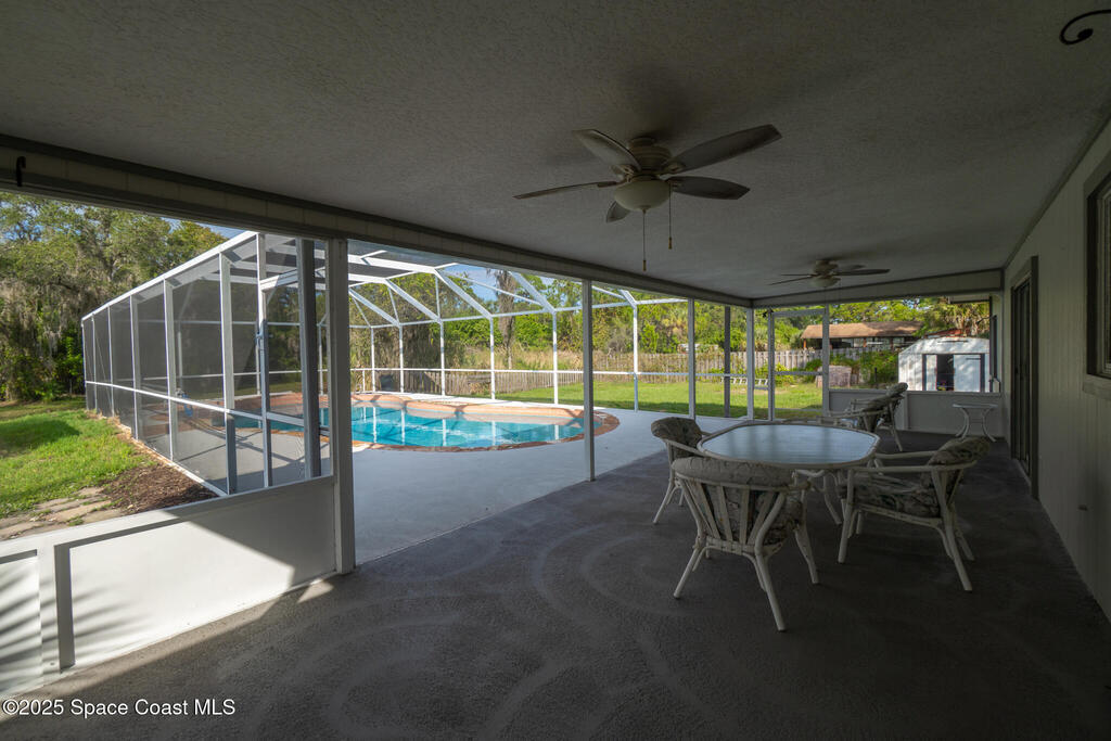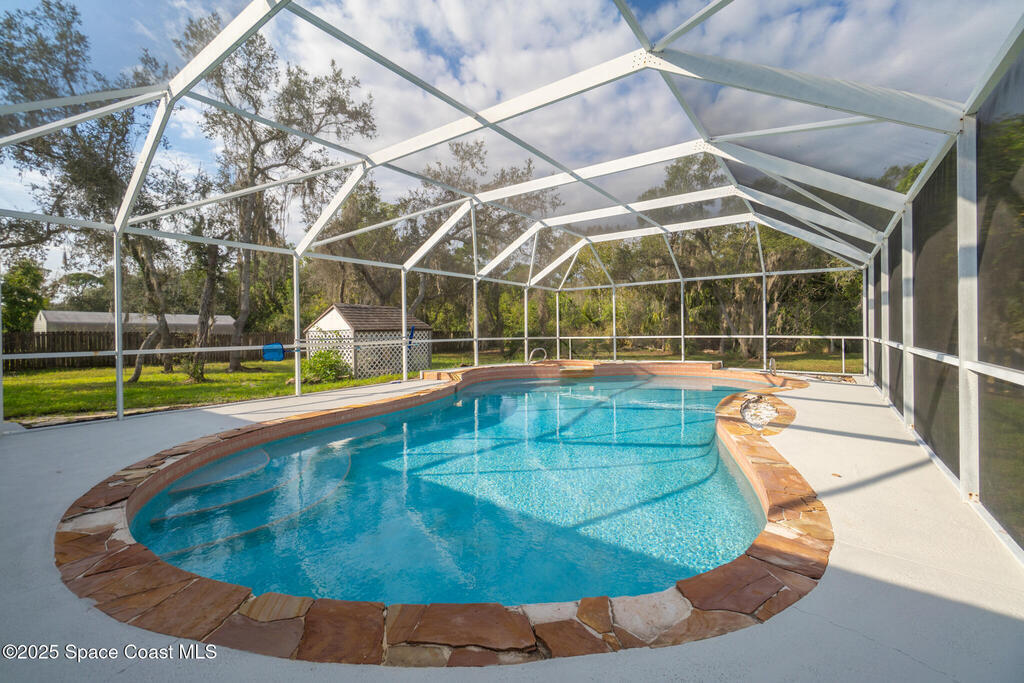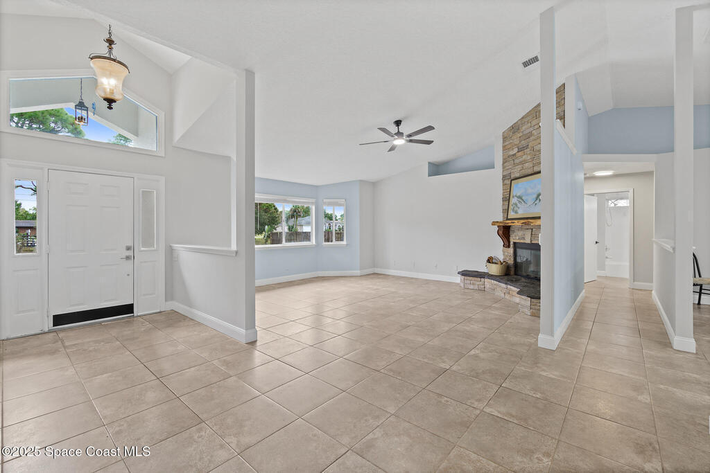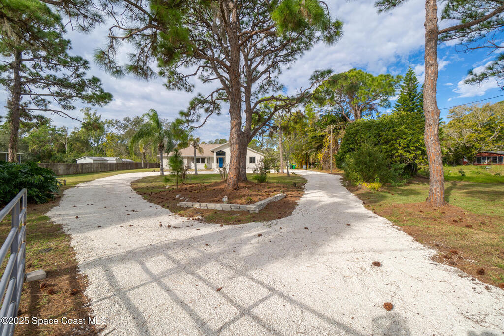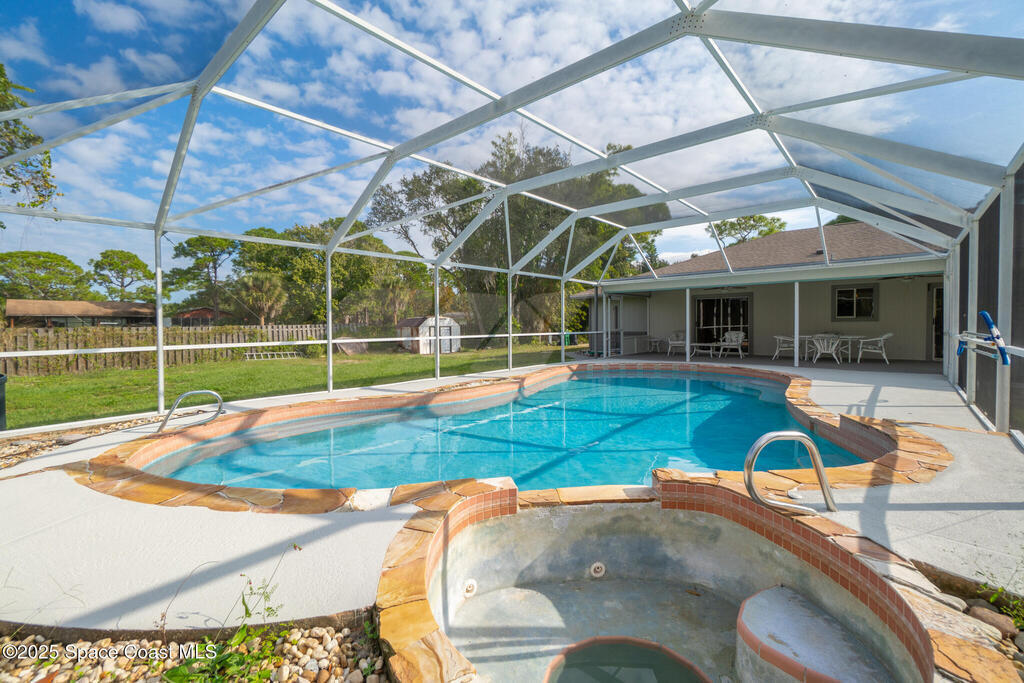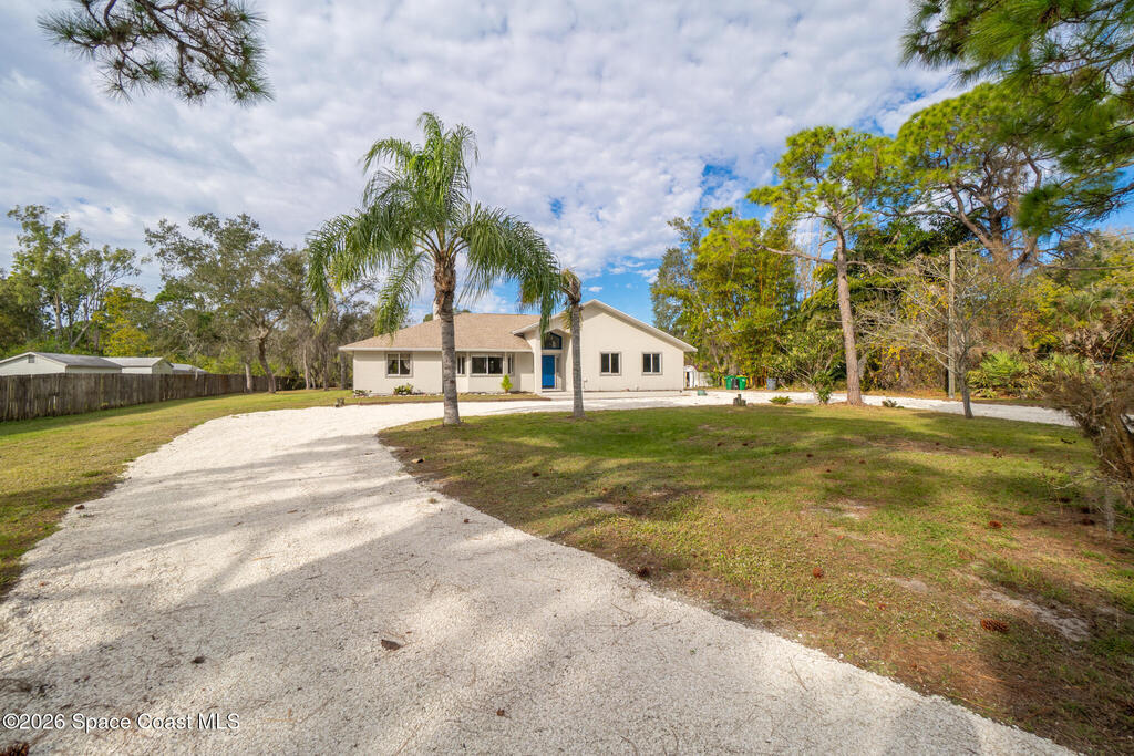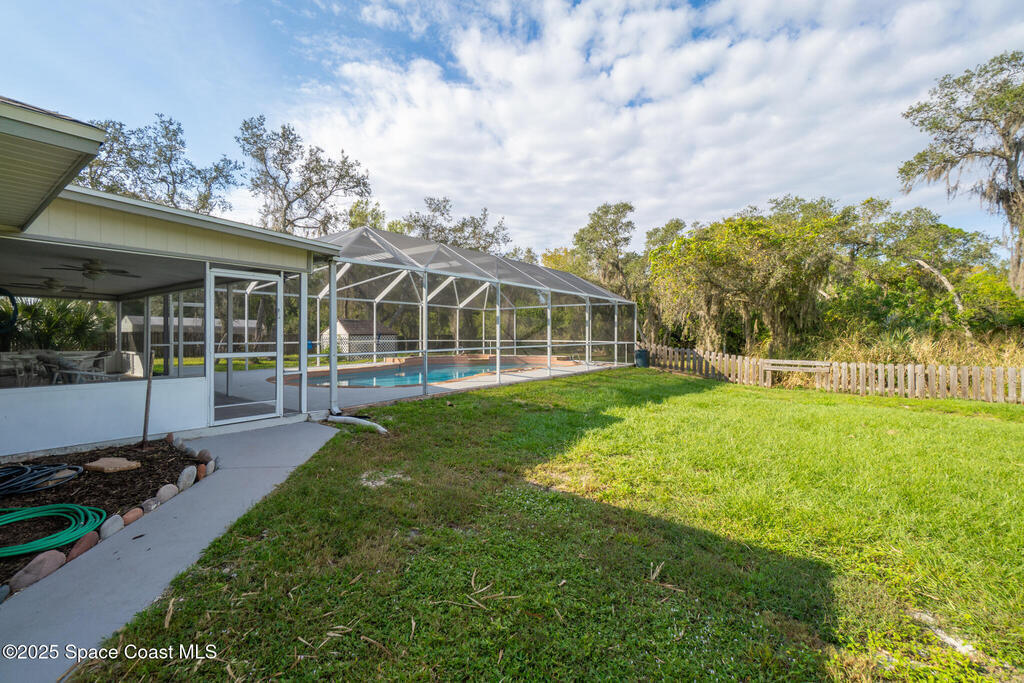 3/2 single family home on nearly 1 acre in Merritt Island. Screened pool, split floor plan, 2024 roof, no HOA, 2-car garage.This single story home offers privacy, space, and updated systems on a nearly one acre lot. With 2,038 square feet, the split floor plan includes vaulted ceilings, a spacious living room with fireplace, and sliding doors that open to the screened pool and patio. The kitchen features granite countertops, solid wood cabinetry, closet pantry, island workspace, built ins, and an adjacent dining area with outdoor access. Tile flooring runs through main living areas, with wood look tile and laminate in the secondary bedrooms for a carpet free interior.The primary suite offers direct pool access, a walk in closet, and a renovated en suite bath with dual sinks and tiled walk in shower. Recent updates include a 2024 roof, 2014 HVAC, 2025 water heater, fresh interior and exterior paint, exterior lighting, and a two car garage with epoxy flake flooring. Located on a q