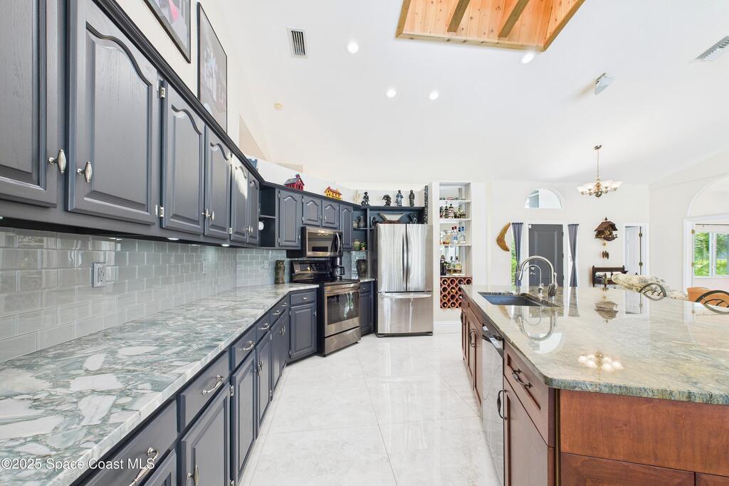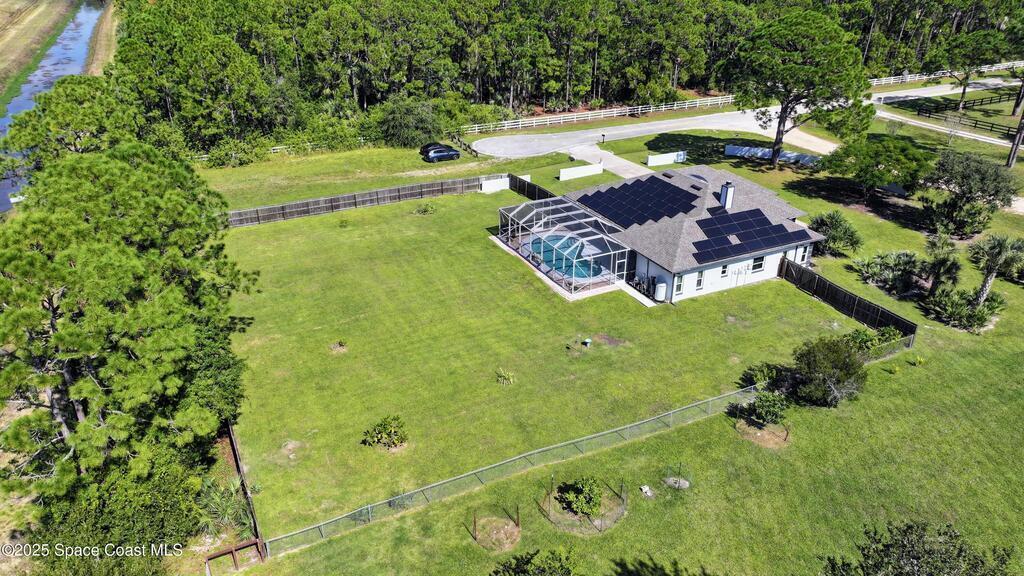 With all the extensive upgrades already completed - this home is ready to simply move in and enjoy! Peaceful country living just minutes from shopping, movie theaters, & restaurants. Situated on a corner lot, this home welcomes you with soaring vaulted ceilings & bright, open living spaces designed for comfort & entertaining. Updated kitchen is the heart of the home, featuring natural quartz countertops and a large custom island, perfect for gatherings. Expansive sliding glass doors fully open to seamlessly extend your living space outdoors, leading to a sparkling screened pool & spacious backyard (1 acre). The split-bedroom floor plan offers generously sized bedrooms & updated bathrooms, providing both comfort and privacy. NEW in 2025: impact windows & entry doors, hot water heater, Culligan water softener, fresh exterior paint, painted pool deck & garage floors. Other Upgrades: New Roof 2022, solar panels (no utility bills), private well (no water bills), and 5-ton Trane AC (3 zones)