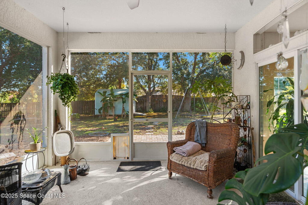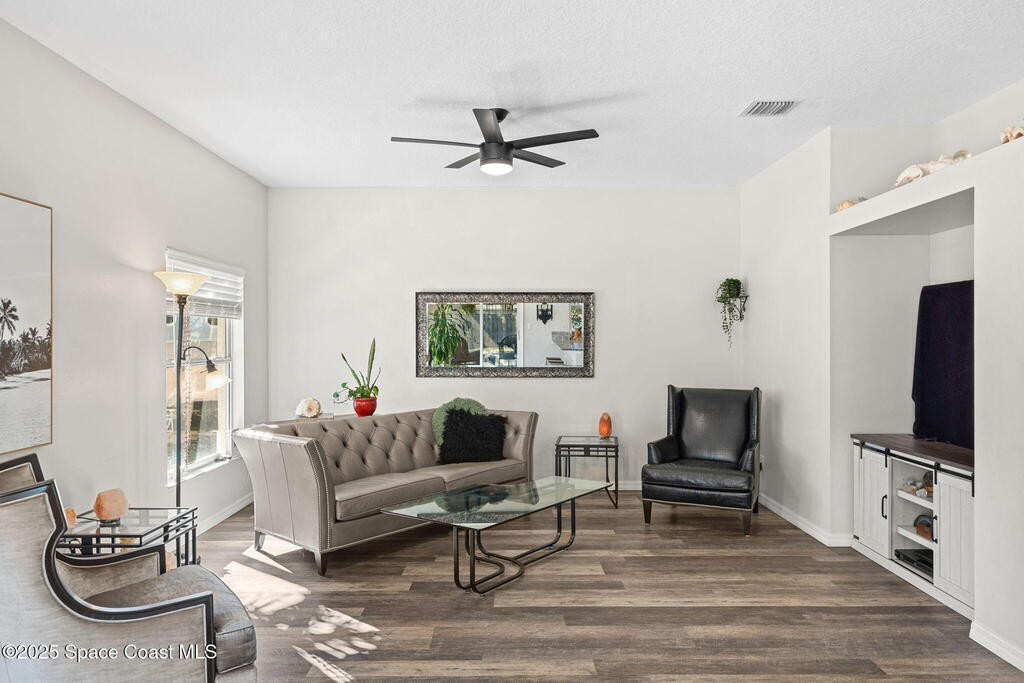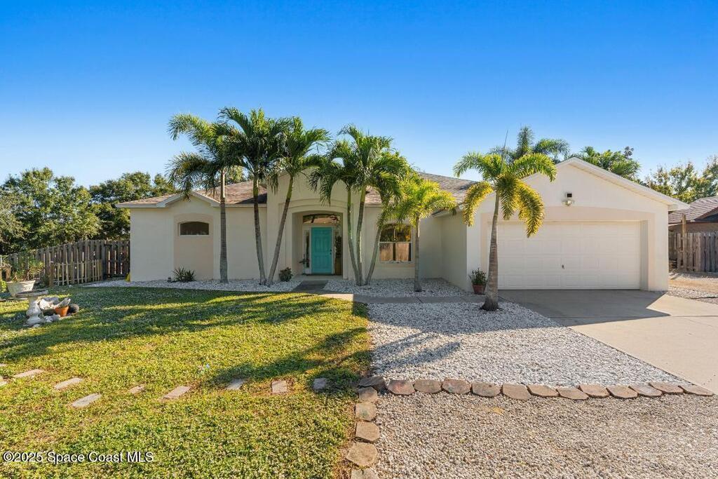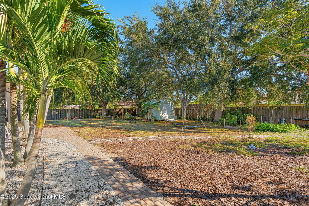 We begin with a rare and refreshing feature: a native Florida yard, thoughtfully maintained without chemicals to nurture butterflies, wildlife, and a truly natural, serene landscape. Tucked away on a private flag lot accessed by easement this .37-acre retreat offers both seclusion and beauty from the moment you arrive. Outdoors the yard is a true sanctuary. A garden shed remains for your tools & hobbies, while banana, papaya, orange, & avocado trees are your fruits to bear.This home will not disappoint, showcasing 2,322 sq. ft. of living space, wide-plank oak flooring and trendy tile throughout, soaring high/vaulted ceilings, with abundant natural light. The stunning kitchen is the heart of the home, appointed with crisp white shaker cabinetry, a light gray contrasting center island, granite countertops, & stainless steel appliances to convey. Located near top-rated schools and just a 15-minute drive to the shores of Cocoa Beach, this home blends natural beauty & modern upgrades.