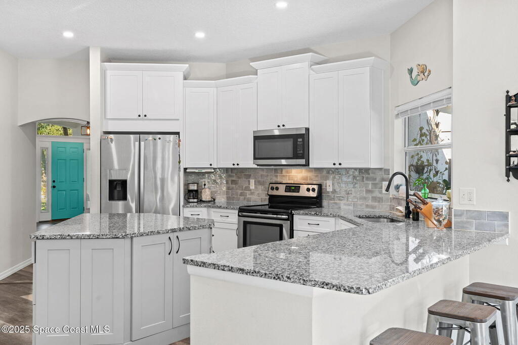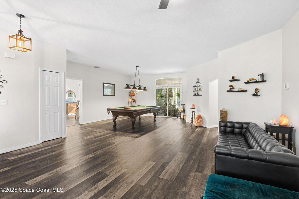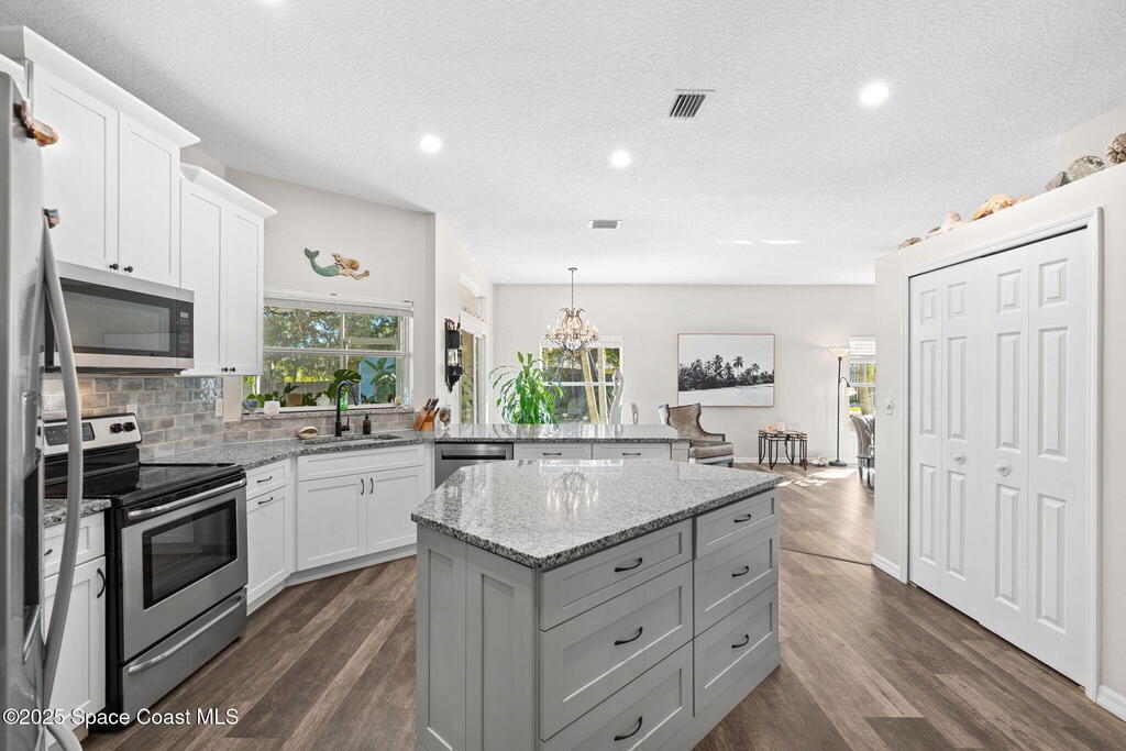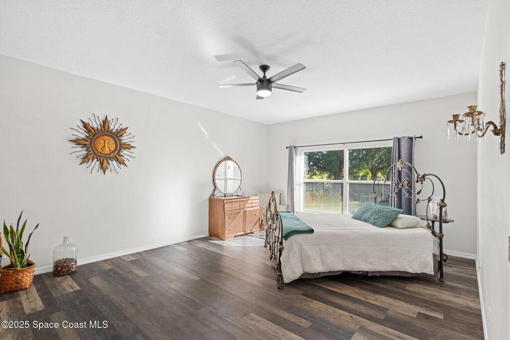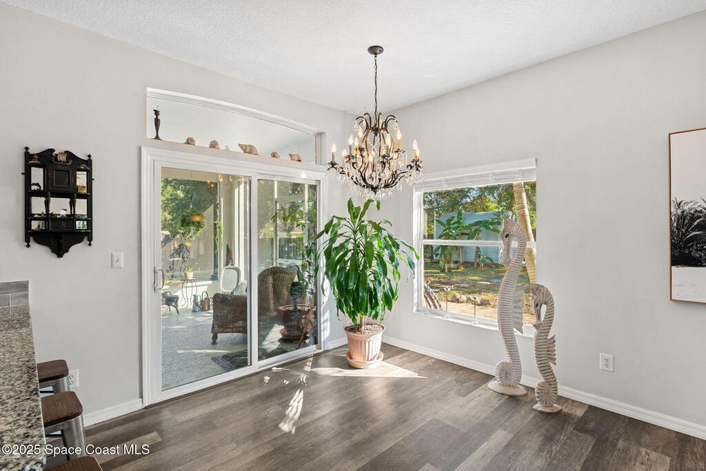 We begin with a rare and refreshing feature: a native Florida yard, thoughtfully maintained without chemicals to nurture butterflies, wildlife, and a truly natural, serene landscape. Tucked away on a private flag lot accessed by easement this .37-acre retreat offers both seclusion and beauty from the moment you arrive. Outdoors the yard is a true sanctuary. A garden shed remains for your tools & hobbies, while banana, papaya, orange, & avocado trees are your fruits to bear.This home will not disappoint, showcasing 2,322 sq. ft. of living space, wide-plank oak flooring and trendy tile throughout, soaring high/vaulted ceilings, with abundant natural light. The stunning kitchen is the heart of the home, appointed with crisp white shaker cabinetry, a light gray contrasting center island, granite countertops, & stainless steel appliances to convey. Located near top-rated schools and just a 15-minute drive to the shores of Cocoa Beach, this home blends natural beauty & modern upgrades.