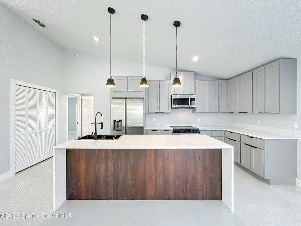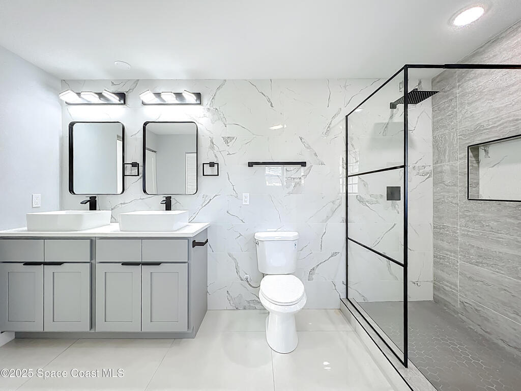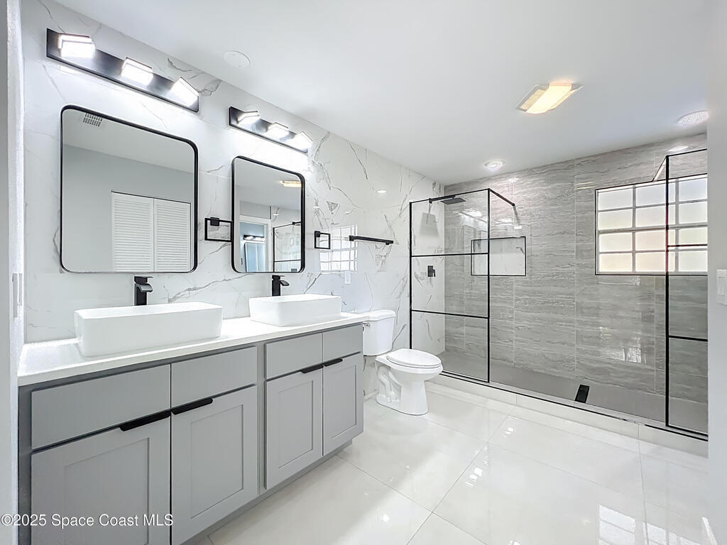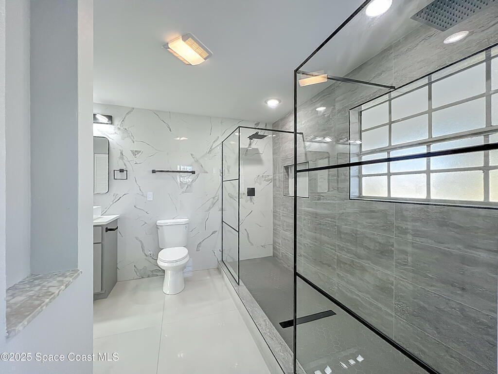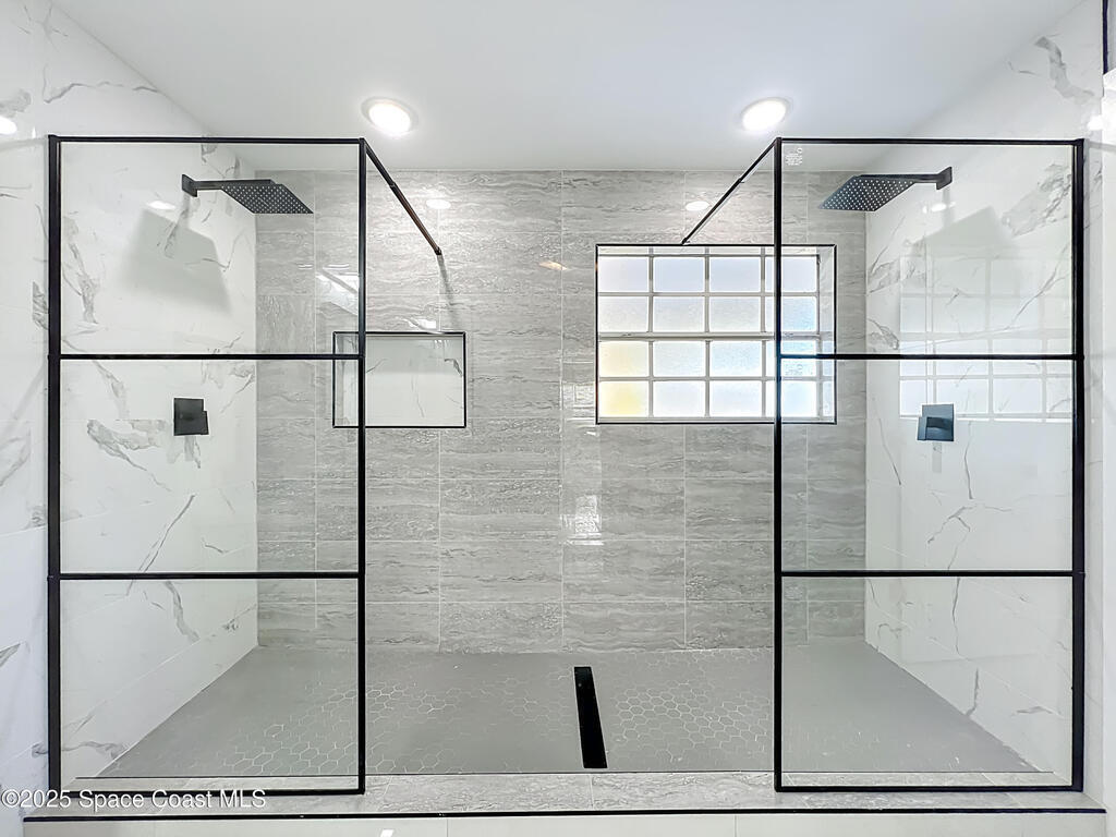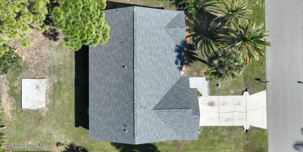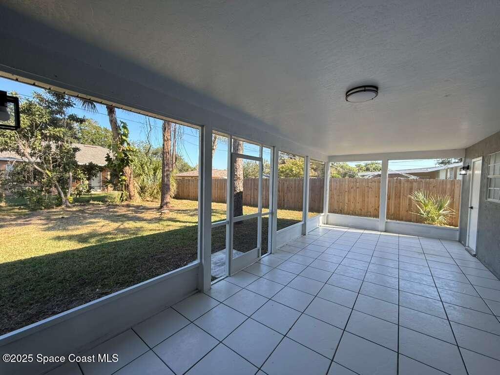 Completely renovated 3 bedroom, 2 bath home with a modern design and brand-new finishes throughout, including a brand-new roof. This home feels like new construction inside, offering an open floor plan, high ceilings, and a stunning kitchen with new stainless steel appliances, new cabinets, new countertops, and sleek black fixtures. The split layout provides privacy with the primary suite on one side and the additional bedrooms on the other. The master bathroom is a showstopper, featuring a spacious walk-in shower with dual shower heads and contemporary tile work. The second bathroom has been tastefully updated. Enjoy a screened-in lanai overlooking a large fenced backyard, plus a convenient half bath with direct access from the lanai. Located near Space Coast beaches, parks, shopping, and major attractions like NASA's Kennedy Space Center.