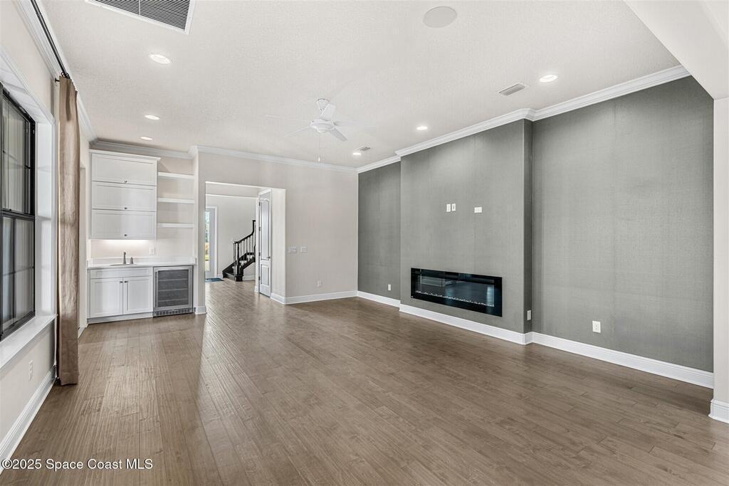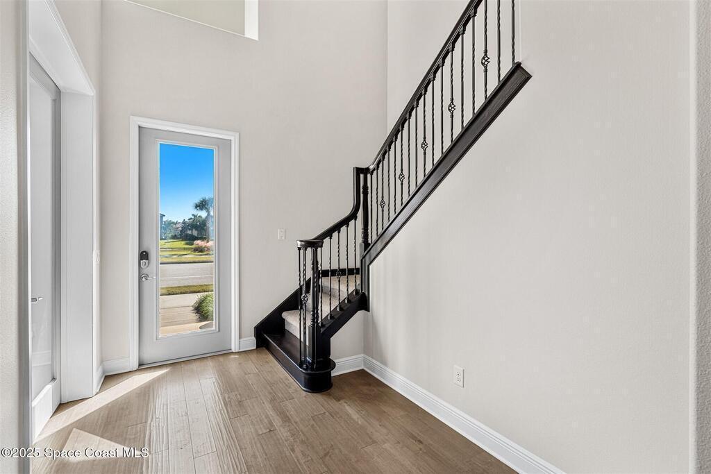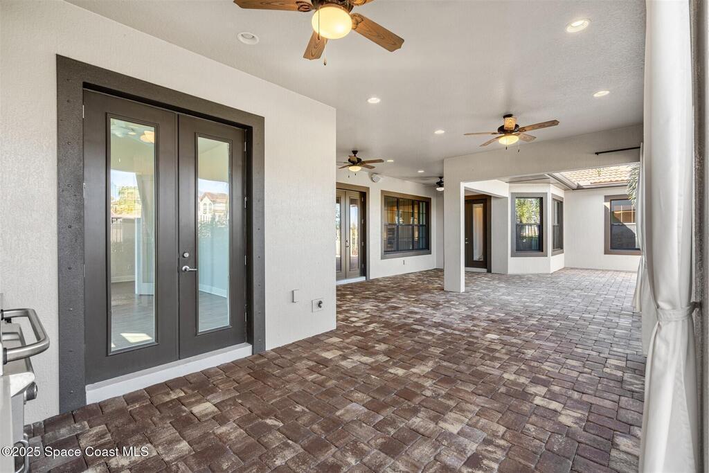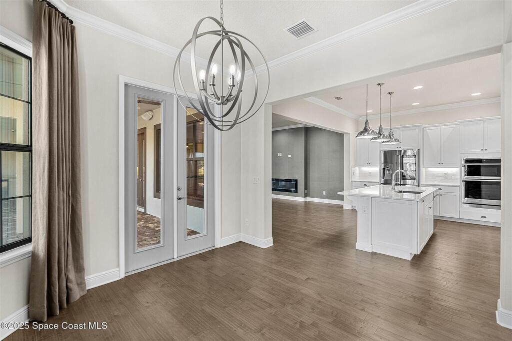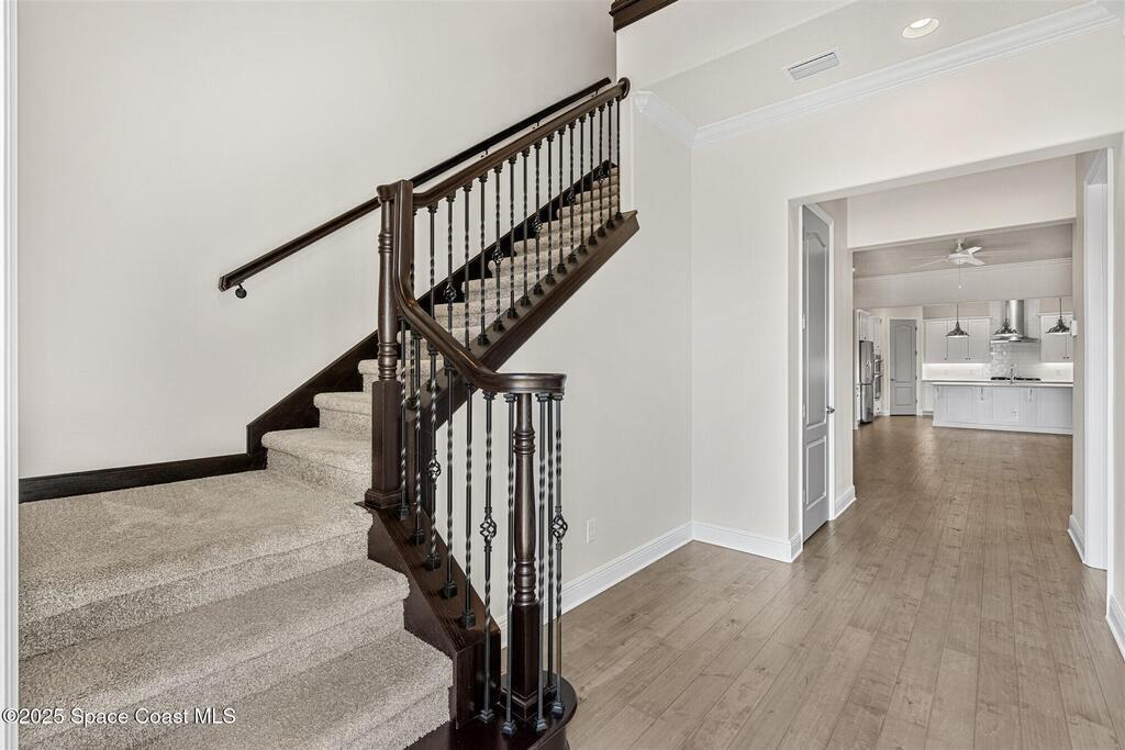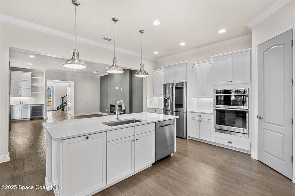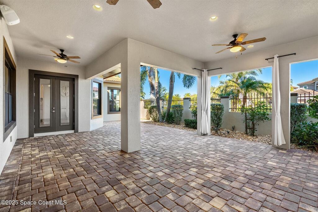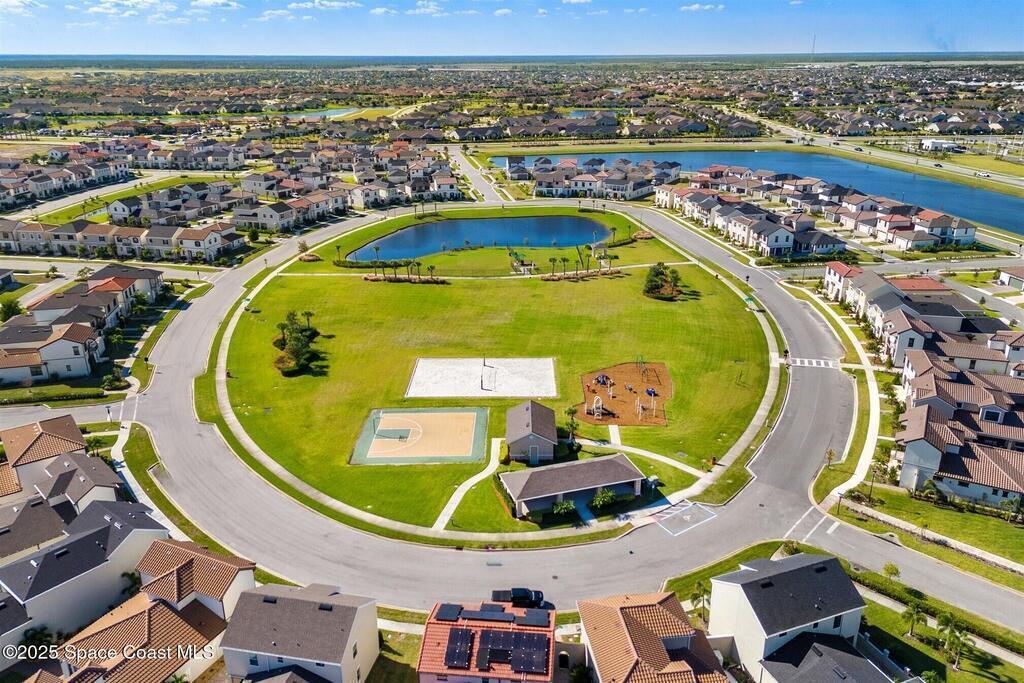 A standout in Viera's sought-after Reeling Park neighborhood, this spectacular 4/5 former model offers over $200K in contemporary upgrades and luxurious living spaces. As you enter through the foyer and pass the office, you're greeted by bright open spaces that draw in soft natural light through the glass front door and windows in the main living spaces. Family gatherings and quiet relaxation are a breeze in the main living space, featuring an electric fireplace and views to the courtyard. The modern kitchen features stainless steel appliances, gas cooktop, vented hood, white cabinetry, quartz counters, and a walk-in pantry. Step outside through the French doors to find a breezy, covered retreat equipped with paver flooring and a summer kitchen, perfect for summertime entertaining. The first-floor primary suite includes an incredible walk-in closet and a spa-like ensuite bathroom with glass and tile shower and soaking tub. . Upstairs, enjoy function and flexibility SEE ''MORE''