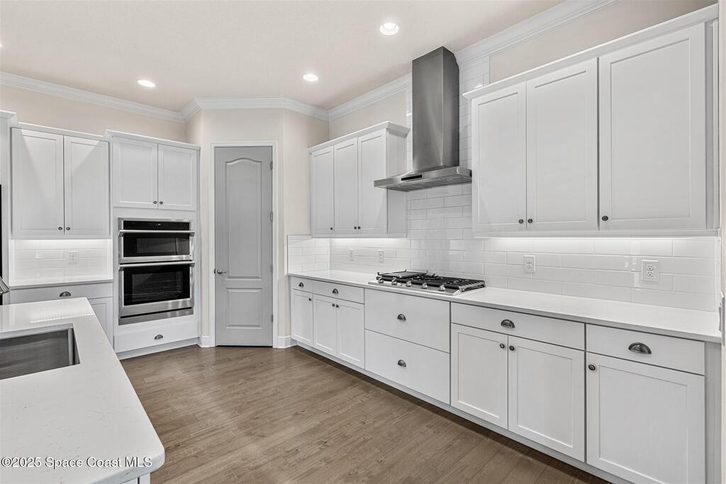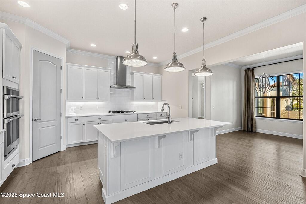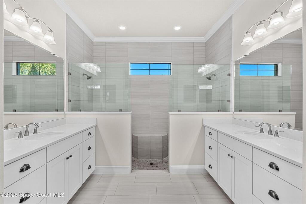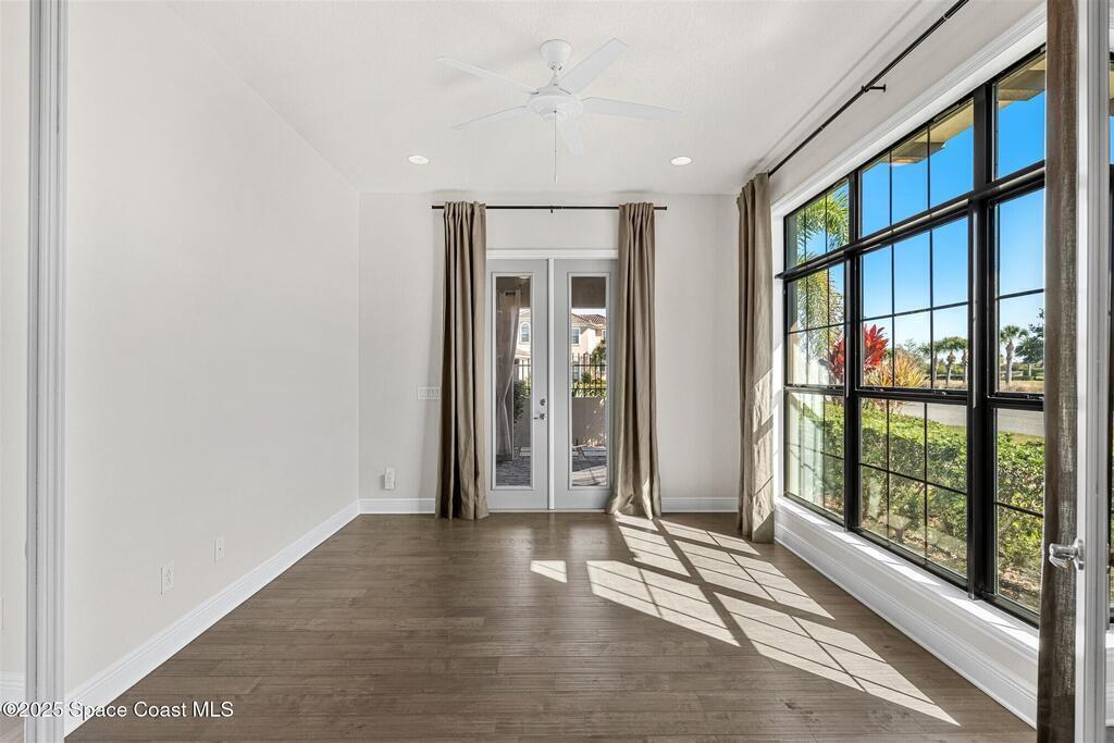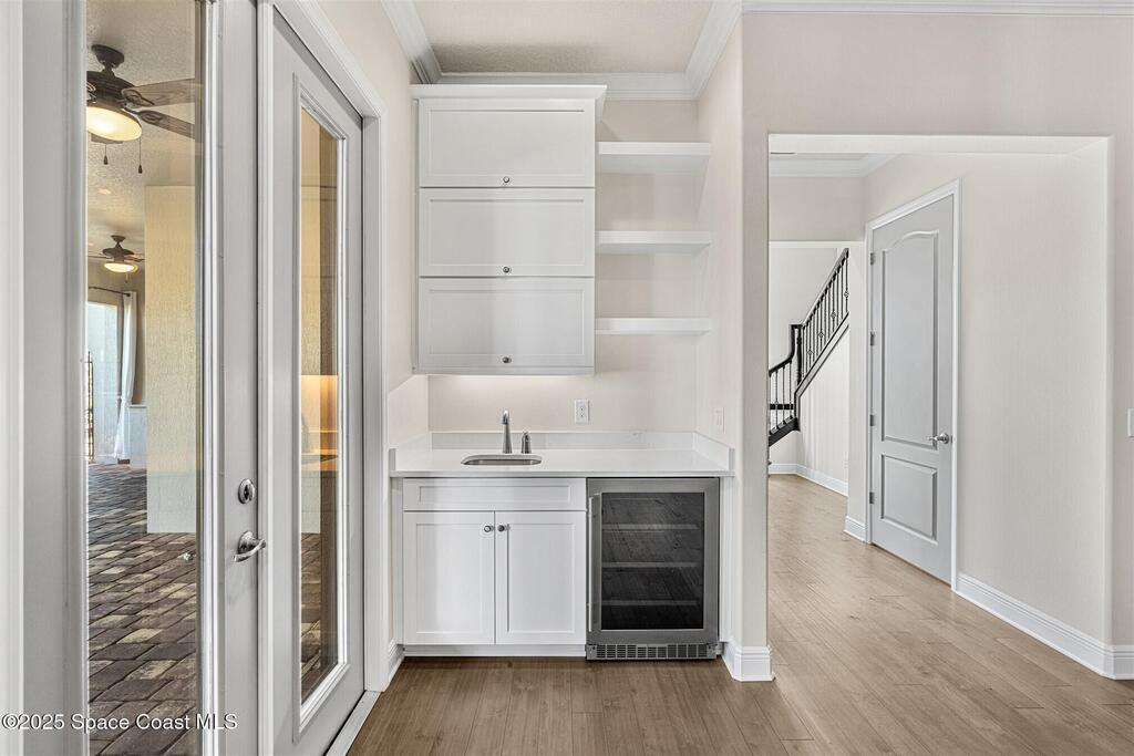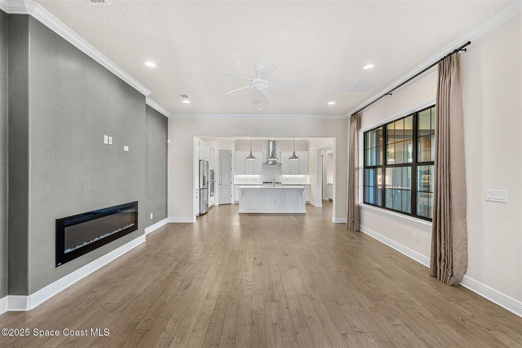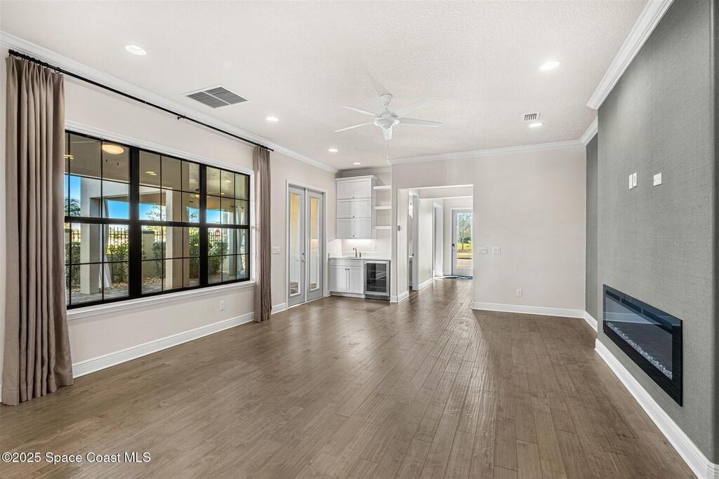 A standout in Viera's sought-after Reeling Park neighborhood, this spectacular 4/5 former model offers over $200K in contemporary upgrades and luxurious living spaces. As you enter through the foyer and pass the office, you're greeted by bright open spaces that draw in soft natural light through the glass front door and windows in the main living spaces. Family gatherings and quiet relaxation are a breeze in the main living space, featuring an electric fireplace and views to the courtyard. The modern kitchen features stainless steel appliances, gas cooktop, vented hood, white cabinetry, quartz counters, and a walk-in pantry. Step outside through the French doors to find a breezy, covered retreat equipped with paver flooring and a summer kitchen, perfect for summertime entertaining. The first-floor primary suite includes an incredible walk-in closet and a spa-like ensuite bathroom with glass and tile shower and soaking tub. . Upstairs, enjoy function and flexibility SEE ''MORE''