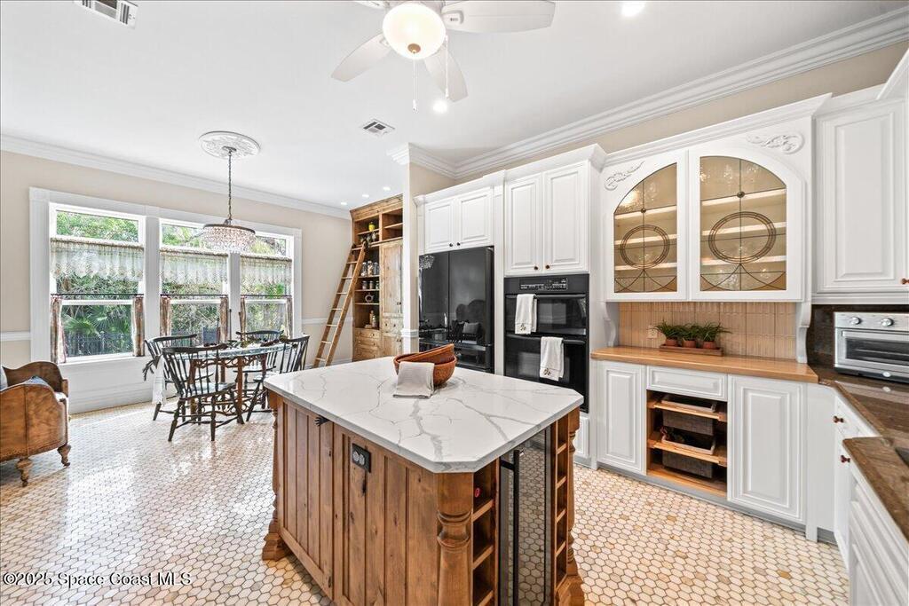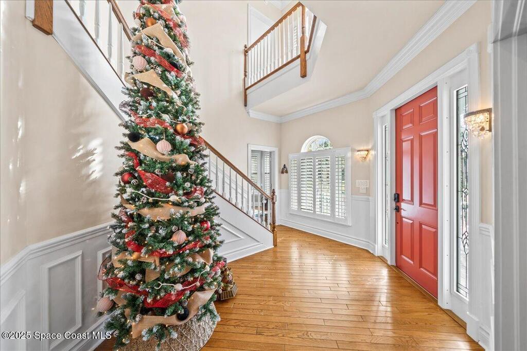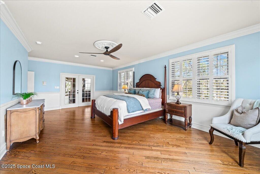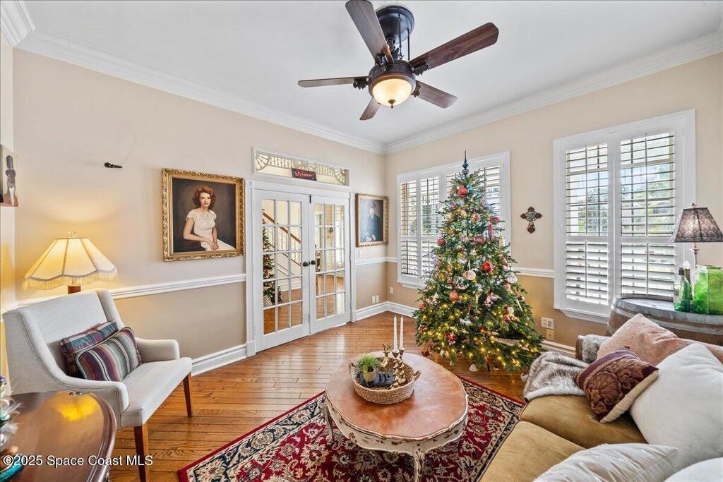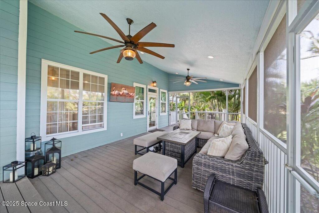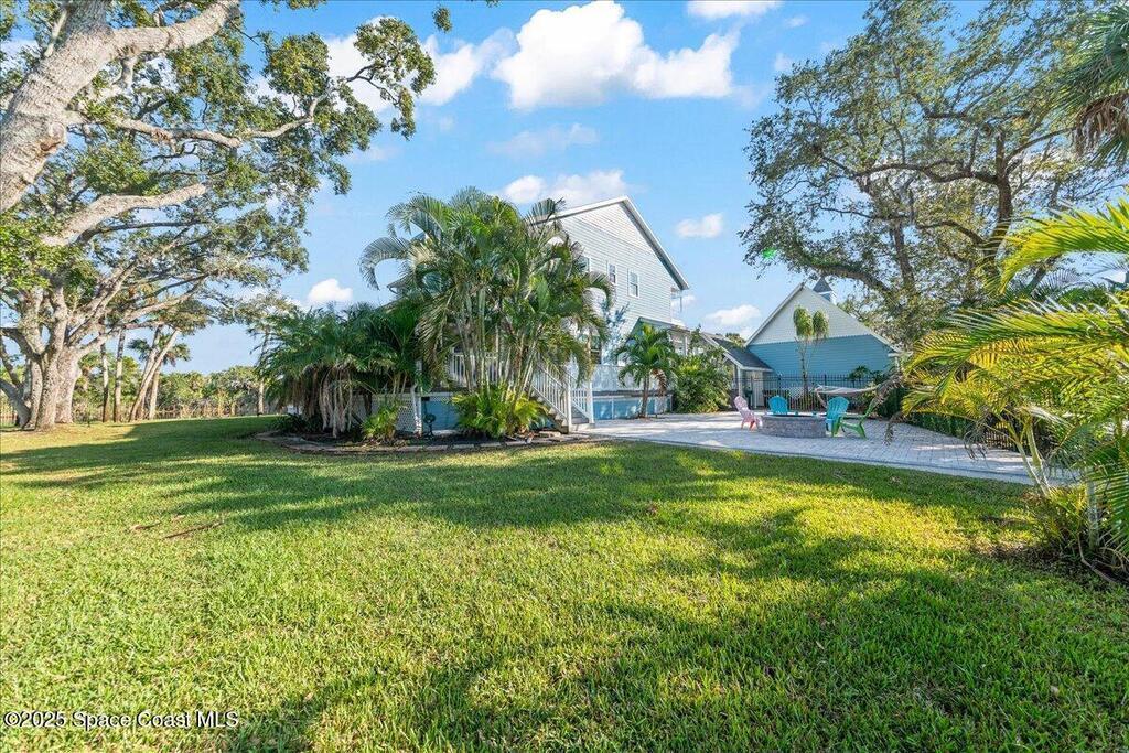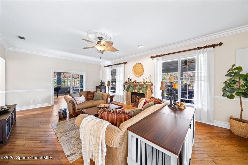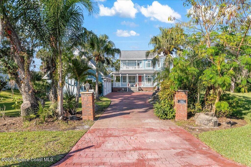 Victorian charm meets modern comfort in this stunning 4,990 sq ft estate on 1.24 waterfront acres. Built in 1993, this 4BD/5BA home offers elegance at every turn--arched trimwork, a grand curved staircase, and ensuite baths in every bedroom. The gourmet kitchen features creamy cabinetry and reverse osmosis. The spacious primary suite includes a private balcony and a 16'x13' walk-in closet with windows, built-ins, and chandeliers. Enjoy sunsets and rocket launches from the 1,000+ sq ft screened porch, or gather in the pavered courtyard with wood-burning fire pit. A detached 3-car garage includes one A/C'd bay and a full 1BD/1BA guest suite above. Miami-Dade- Impact windows (partial), fenced yard, smart locks, lush oaks, landscape lighting, and wraparound porches (6,227 sq ft under roof). Roof 2017, A/Cs 2024 & 2014. Low HOA of $150/year. A rare blend of privacy, beauty, and lifestyle in Merritt Island.