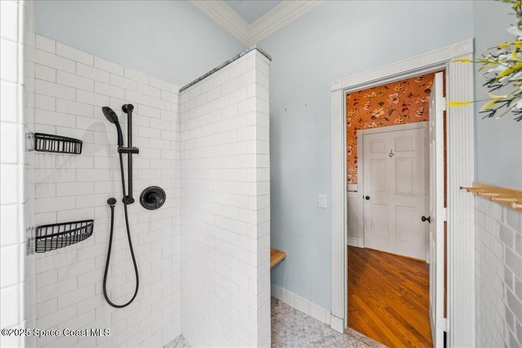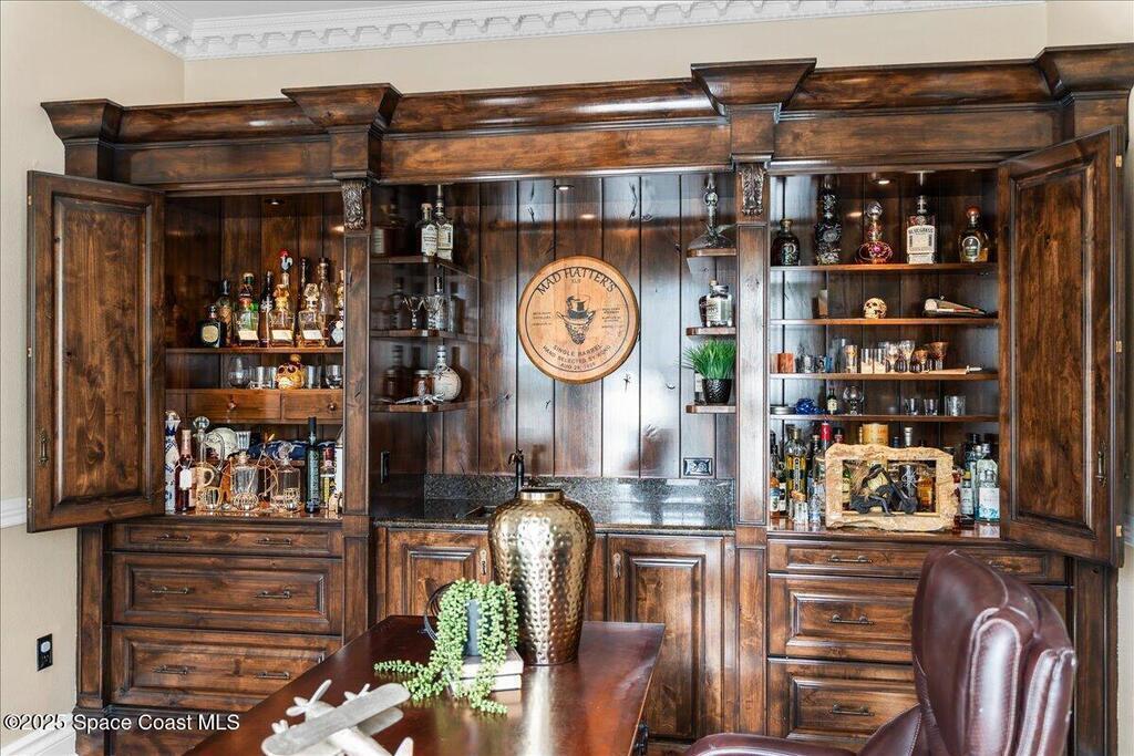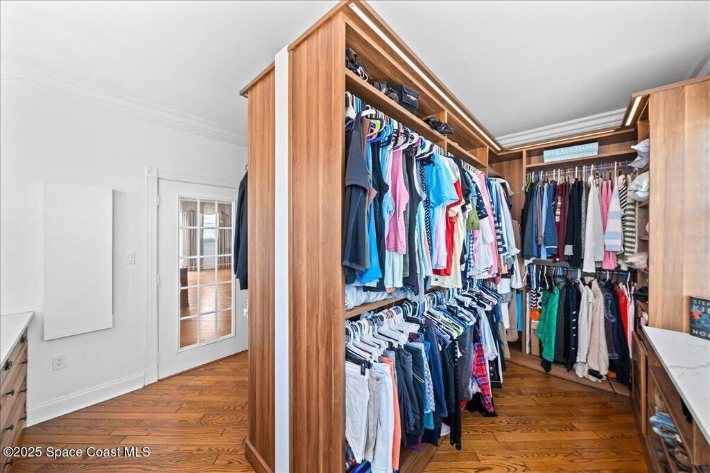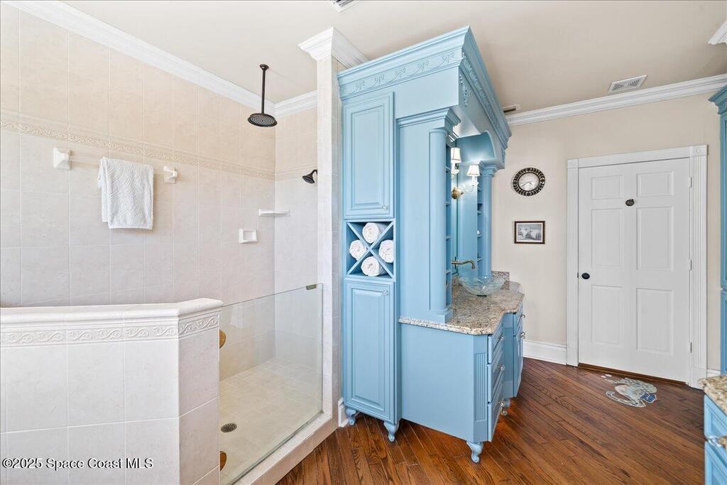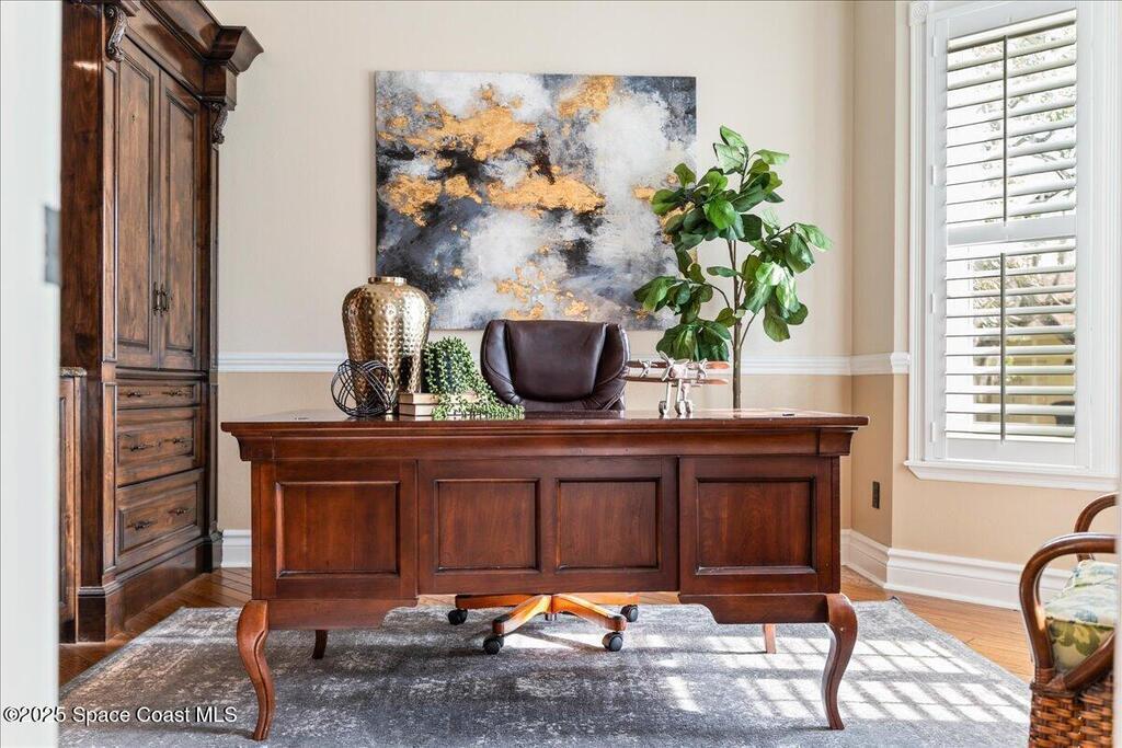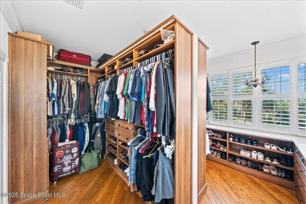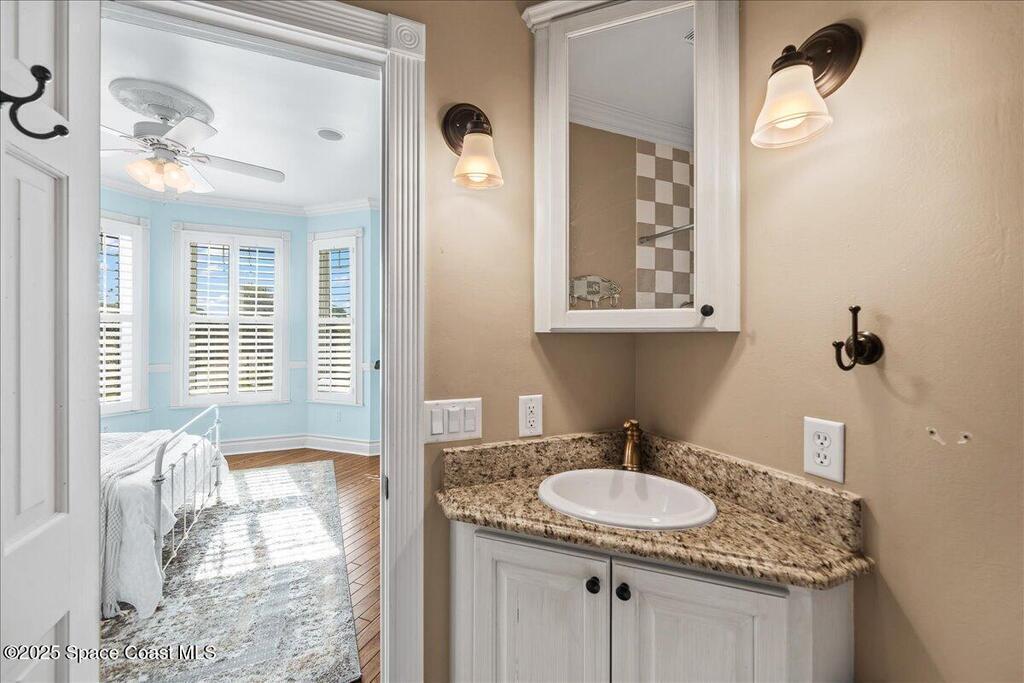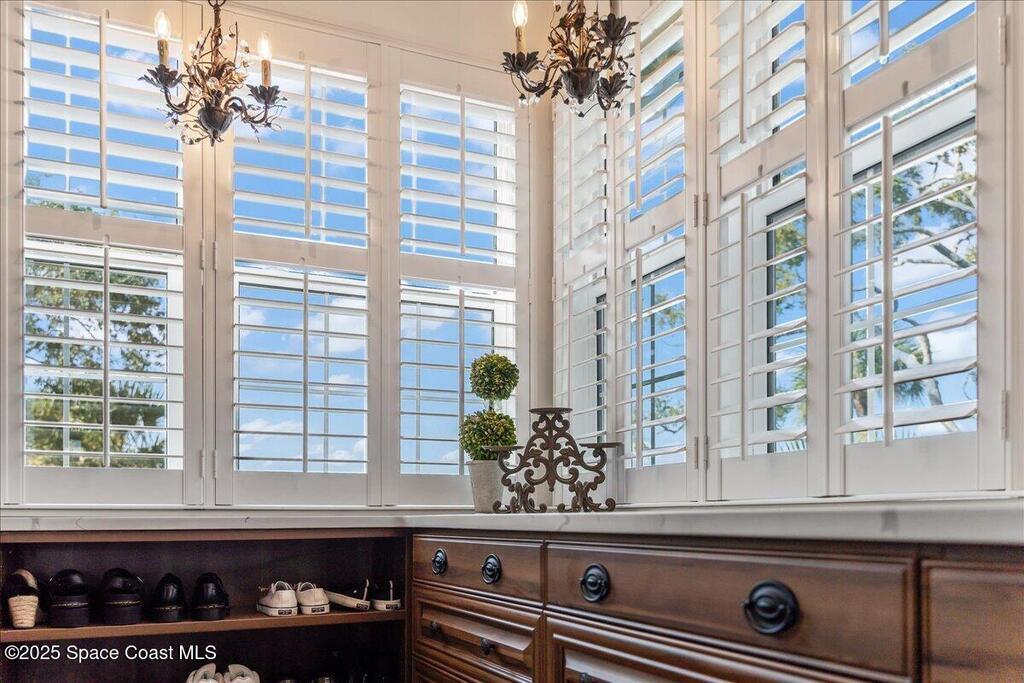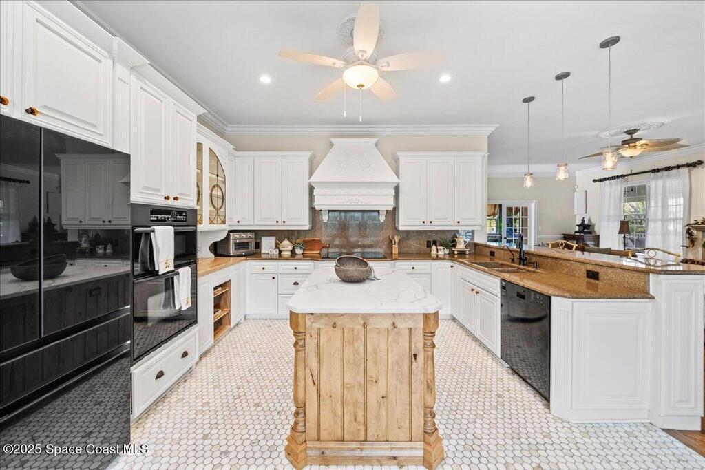 Victorian charm meets modern comfort in this stunning 4,990 sq ft estate on 1.24 waterfront acres. Built in 1993, this 4BD/5BA home offers elegance at every turn--arched trimwork, a grand curved staircase, and ensuite baths in every bedroom. The gourmet kitchen features creamy cabinetry and reverse osmosis. The spacious primary suite includes a private balcony and a 16'x13' walk-in closet with windows, built-ins, and chandeliers. Enjoy sunsets and rocket launches from the 1,000+ sq ft screened porch, or gather in the pavered courtyard with wood-burning fire pit. A detached 3-car garage includes one A/C'd bay and a full 1BD/1BA guest suite above. Miami-Dade- Impact windows (partial), fenced yard, smart locks, lush oaks, landscape lighting, and wraparound porches (6,227 sq ft under roof). Roof 2017, A/Cs 2024 & 2014. Low HOA of $150/year. A rare blend of privacy, beauty, and lifestyle in Merritt Island.
