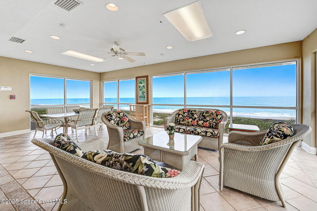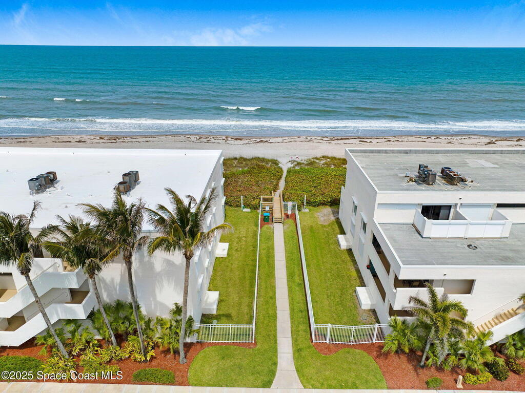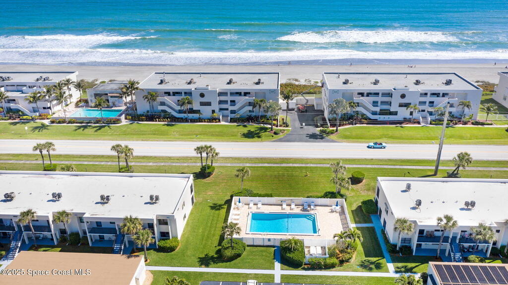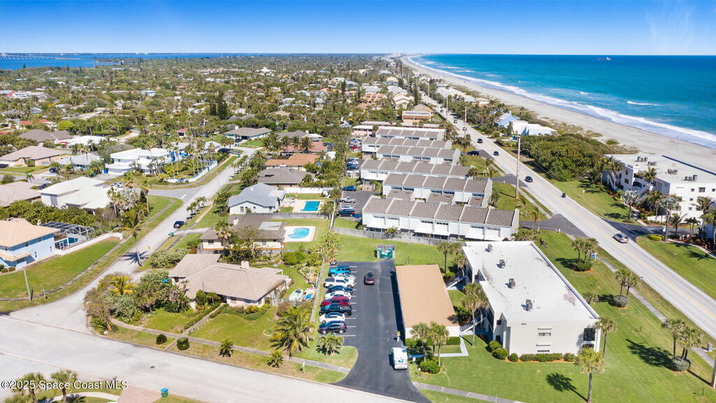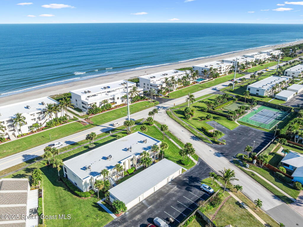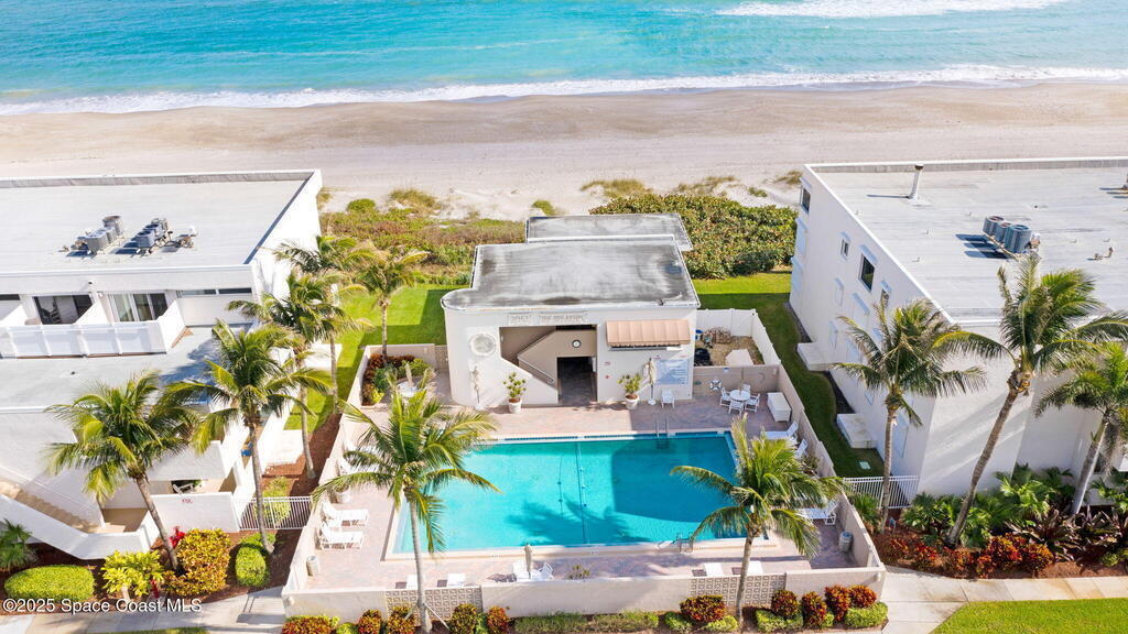 This ground floor, end condo boasts stunning views and is a short walk to the beach. Enjoy ocean breezes from your private screened porch. A new roof was installed by the association in 2025. The community features a pool, fitness center, garages, and extra storage. The HOA covers landscaping, water, high-speed internet, and cable for low-maintenance living. Located on Florida's Space Coast, you'll have front-row seats to rocket launches and easy access to golf, tennis, a library, fishing pier, bike paths, A-rated schools, and dining, just one mile south of Ocean Avenue. Nestled in a secure community, this condo is in the largest sea turtle nesting area, offering the best of coastal Florida living!
