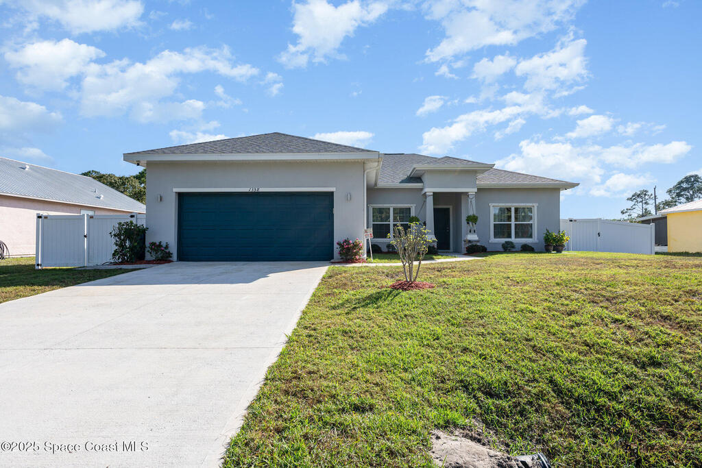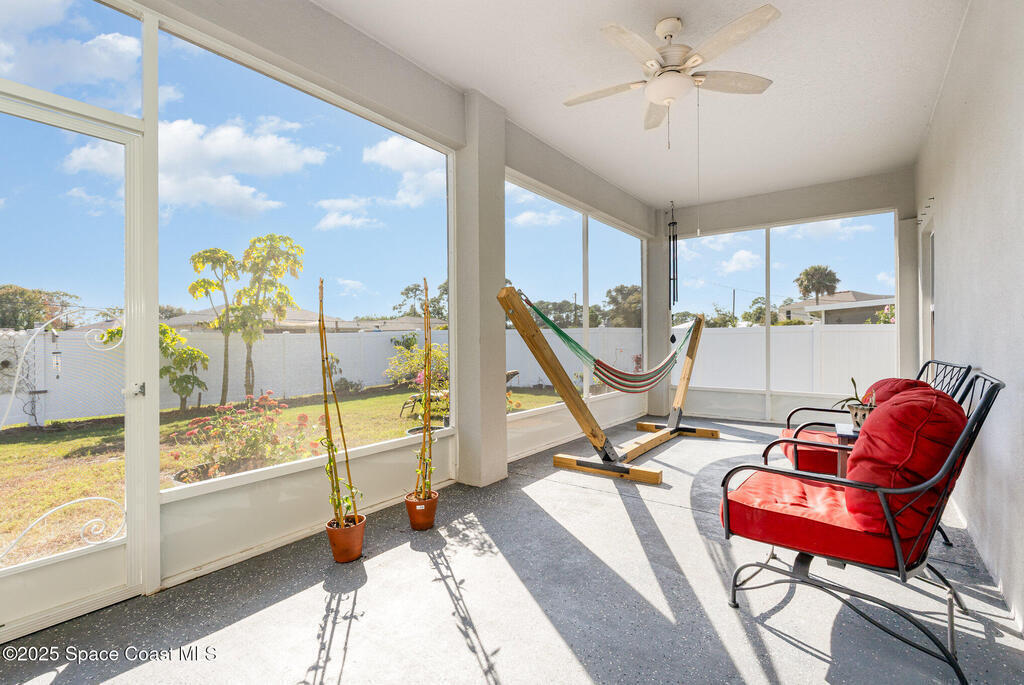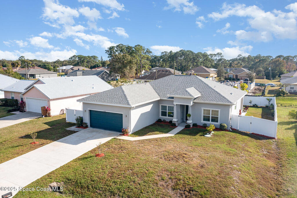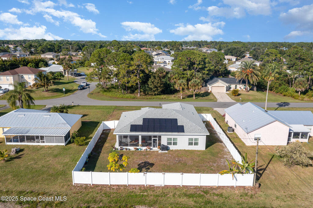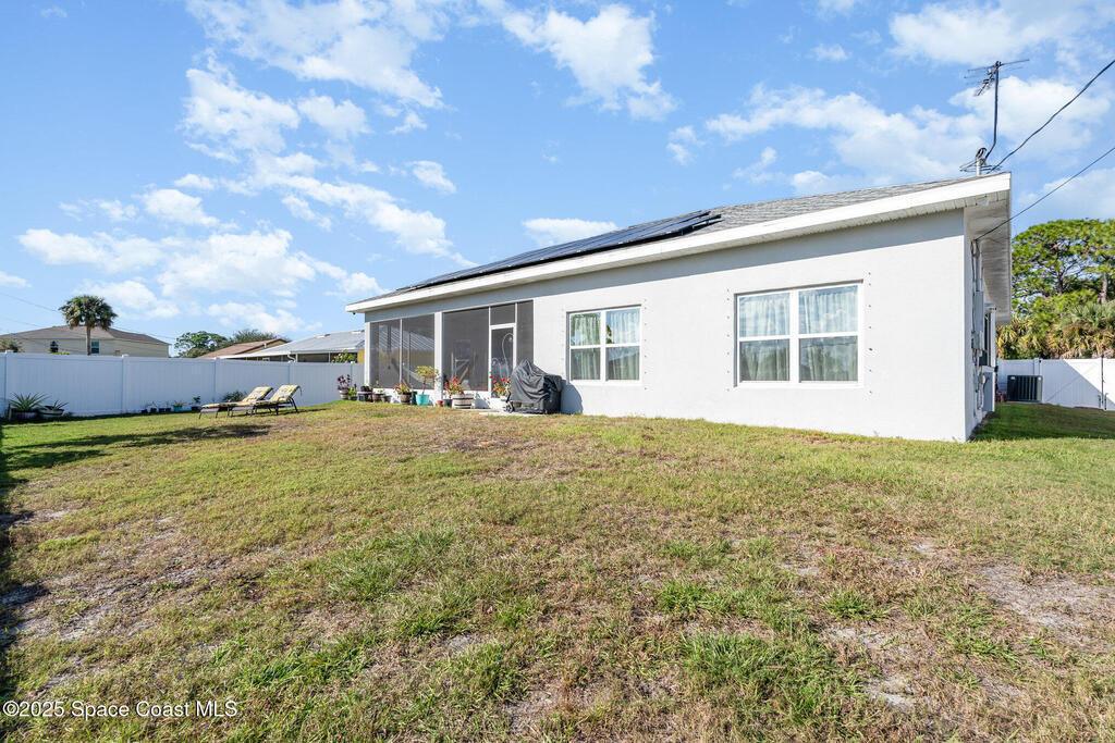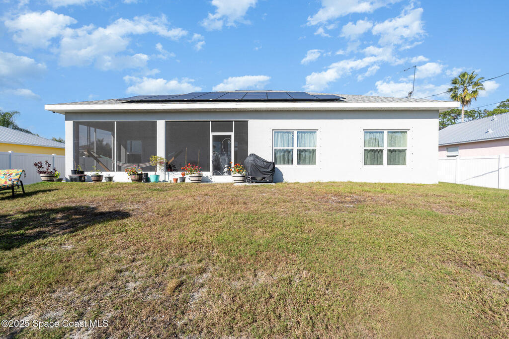 Beautifully maintained 4 bed, 3 bath CBS home in desirable SE Palm Bay featuring paid-off 2022 solar panels with a transferable 25-year warranty, keeping electric bills around $30/month. Fully fenced yard and screened, trussed back porch.Enjoy a true smart home with a Bolt Technologies security system, 6 cameras, window/door sensors, motion sensors, smart thermostat, electronic keypad entry, Ring doorbell, and Wi-Fi-enabled appliances including washer, dryer, and garage door opener. Home also includes 4 TV-mount-ready locations, HDMI in-wall wiring, and COAX ports.The kitchen offers granite countertops, solid wood 42'' cabinets with crown, and smart stainless steel appliances. The primary suite features a tray ceiling, dual closets, a soaker tub, and a tiled walk-in shower. Guest bedrooms include a shared bath with a granite countertop and a tiled tub/shower combo. Move-in ready with modern finishes throughout!