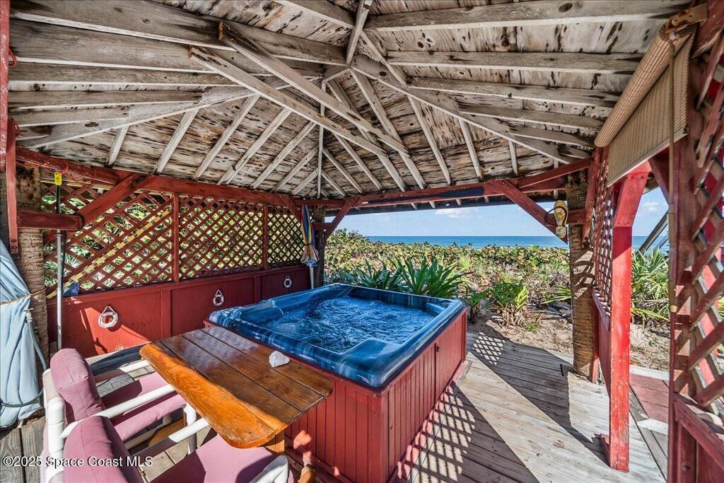 Exceptional oceanfront property offering a private coastal lifestyle on nearly .78 acres. Set well back from A1A the deep front yard creates a quiet retreat with space for a future pool, expanded outdoor living or guest amenities. A wide approach and ample parking area provide smooth access for family and guests. Along the oceanfront enjoy 48' of shoreline framed by mature landscaping for natural privacy far from public beach access and perfect for peaceful mornings beach walks and relaxed seaside living. A grandfathered oceanside gazebo with hot tub sits just steps from the dunes offering a unique spot for gatherings unwinding under the stars or watching spectacular space shuttle launches. The second-story oceanside deck provides elevated views and refreshing breezes ideal for sunrise coffee or evening cocktails. A 273 sq ft workshop with a separate entrance adds flexibility for hobbies or storage. A rare chance to enjoy space serenity and the true oceanfront lifestyle.