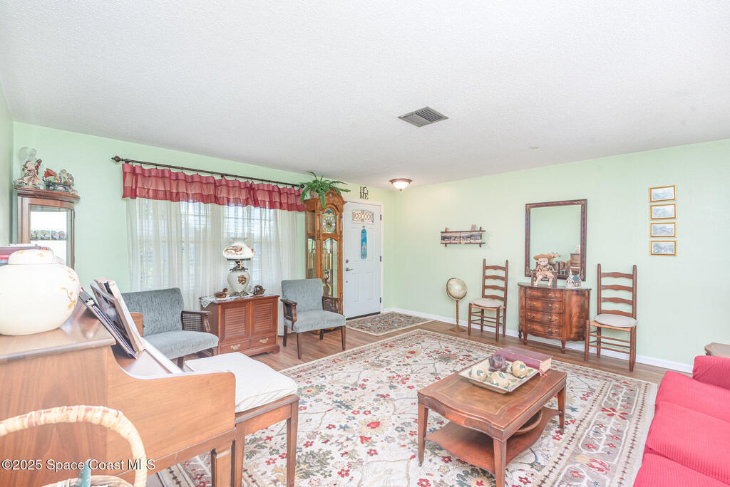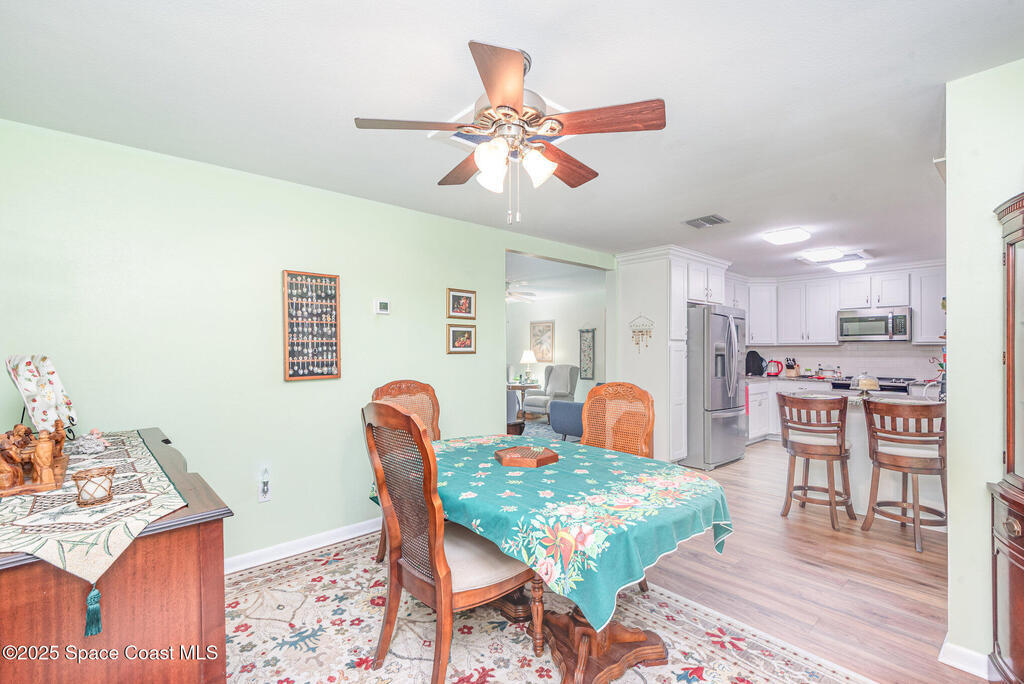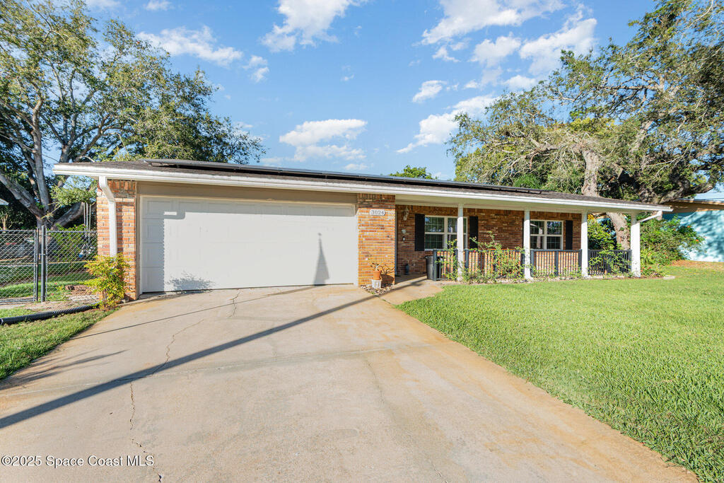 This beautifully updated 4-bedroom, 2-bath home with a 2-car garage offers a warm and inviting layout featuring a living room, family room, and dedicated dining area. A charming country-style front porch welcomes you inside, where wood-plank tile flows through the main living areas and polished terrazzo with carpet accents enhances the bedrooms. The recently remodeled kitchen shines with white shaker style cabinets, granite countertops, SS appliances, and a convenient breakfast bar. Enjoy modern efficiency with solar panels and newer impact windows and a French door. Additional features include an inside laundry room, a fully fenced yard, gutters, an irrigation system, and a large screened back porch perfect for relaxing or entertaining. The master bath was renovated within the past decade, and the roof is approximately 10 years old, offering peace of mind and long-term value. This move-in-ready home blends comfort, upgrades, and Florida charm in a great Titusville location.