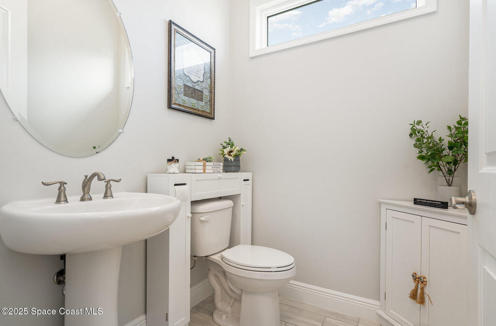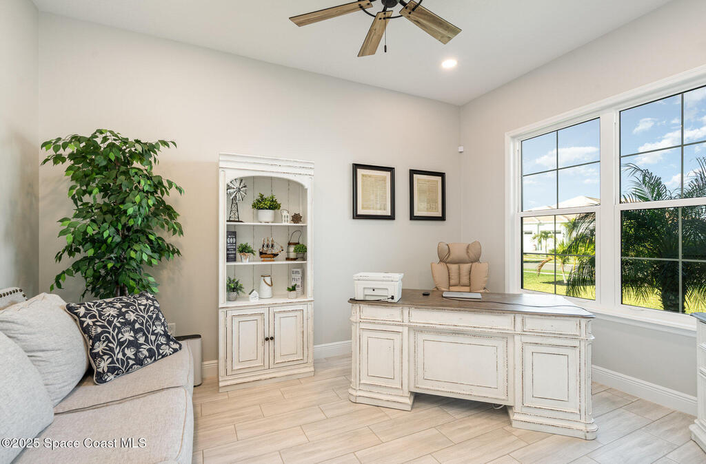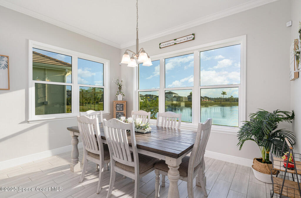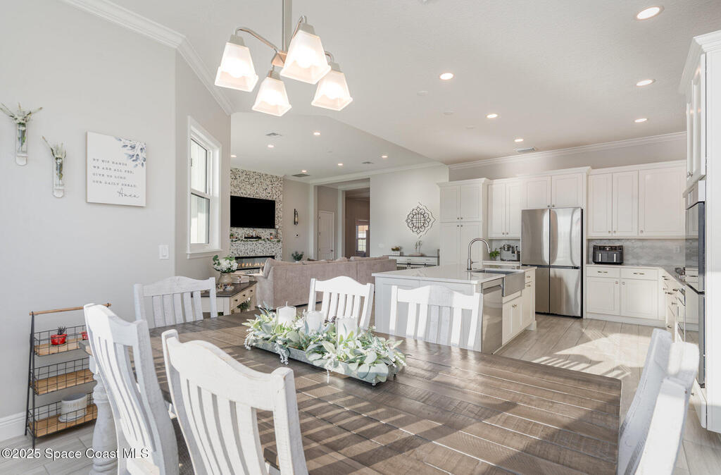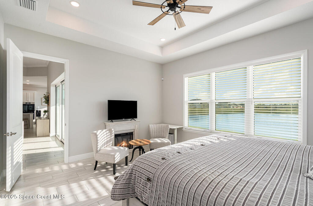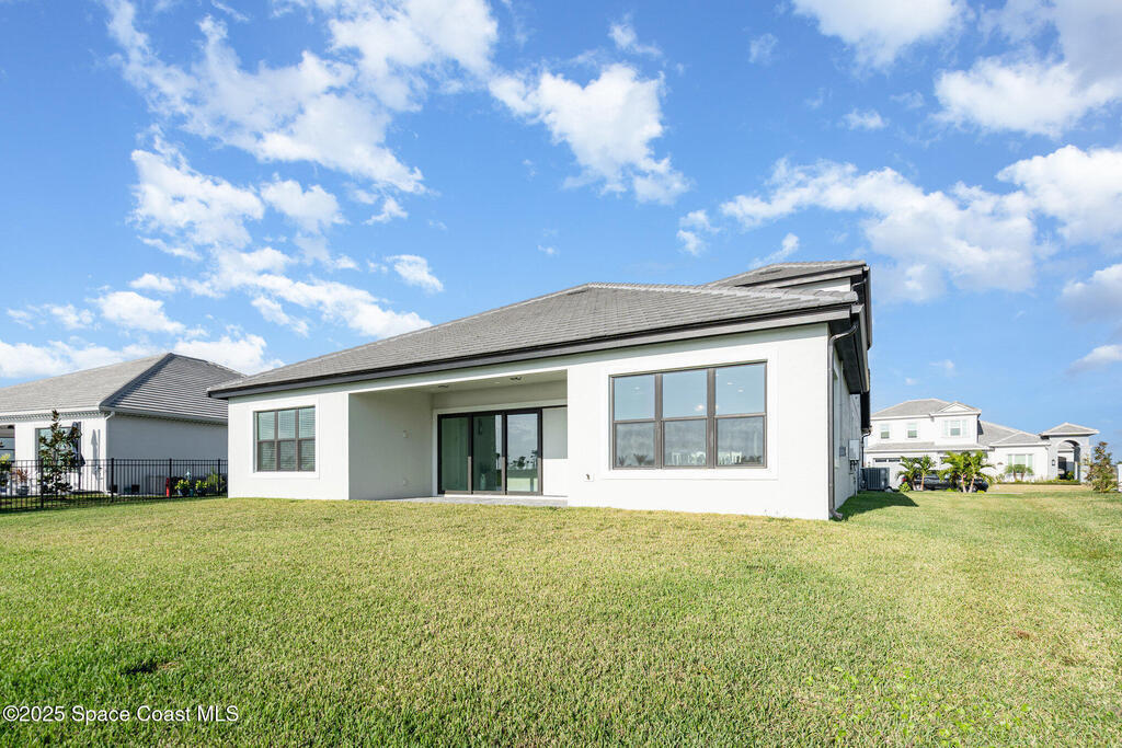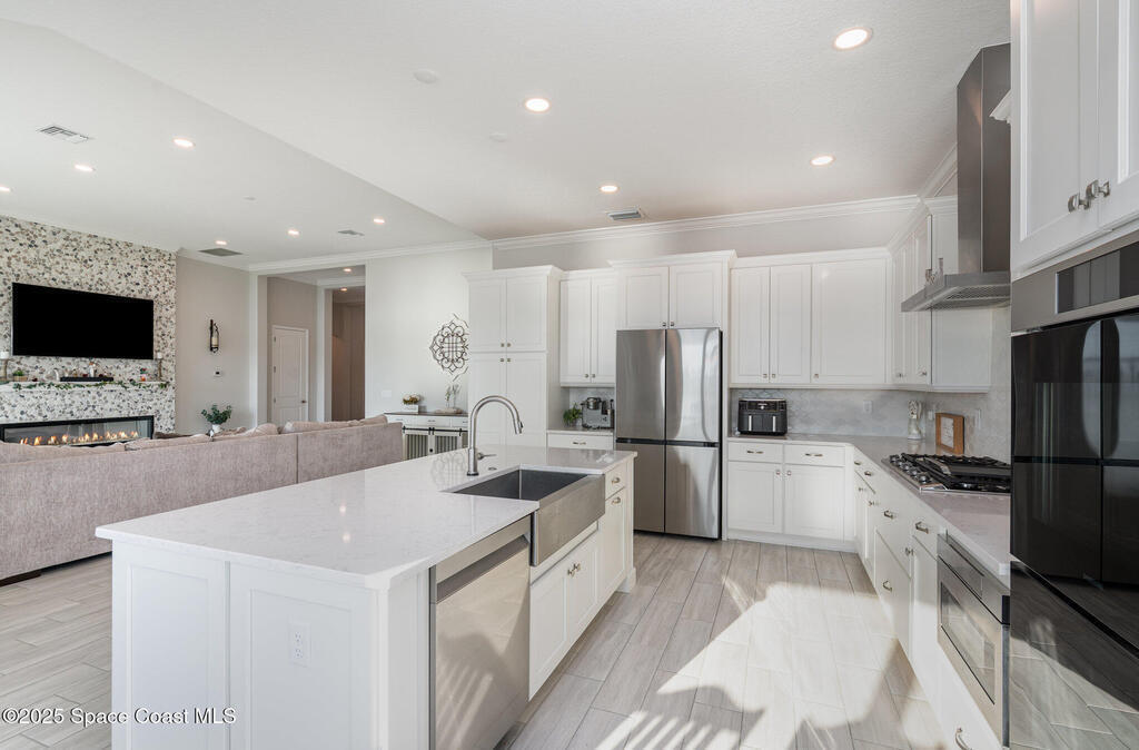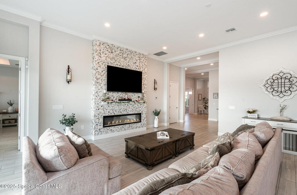 Nearly new 2024-built home in Viera's exclusive Laurasia! This spacious 4-bedroom, 4.5-bath residence offers 3,690 sq ft of bright, open-concept living with soaring ceilings and effortless flow for everyday comfort or entertaining. The Gourmet Kitchen package dazzles with Level 4 cabinets, upgraded countertops, and a microwave drawer. Premium Level 3 flooring runs throughout, with matching tile upstairs. Unwind by a 6-ft electric fireplace set on a custom stone wall. Impact windows, a cell-phone booster, and abundant LED high-hat lighting on both floors elevate daily living. The primary suite adds a relaxing soaking tub and premium shower. A private study, laundry cabinets, and extra garage direct-line outlets add function. Outside, enjoy a premium lot with extra lanai outlets plus water and gas stubs, pool-service prep, and space to build your dream backyard oasis. Minutes to schools, parks, The Avenue Viera, beaches, I-95, and Space Coast employers--move-in ready. A MUST SEE!