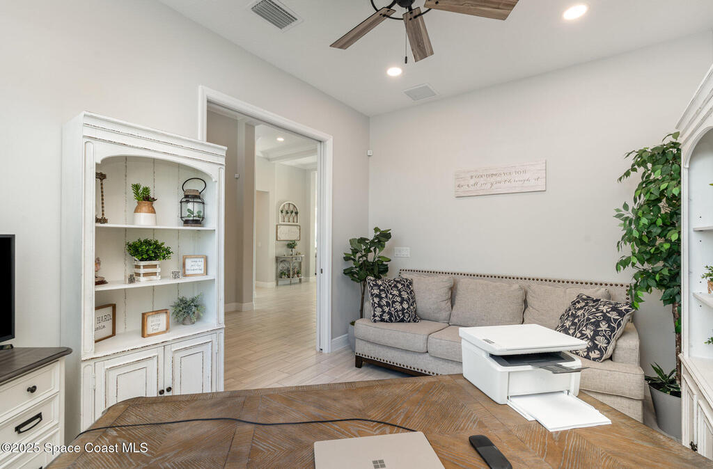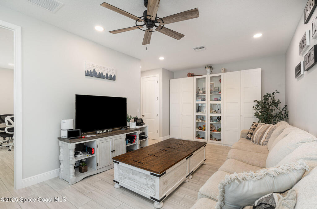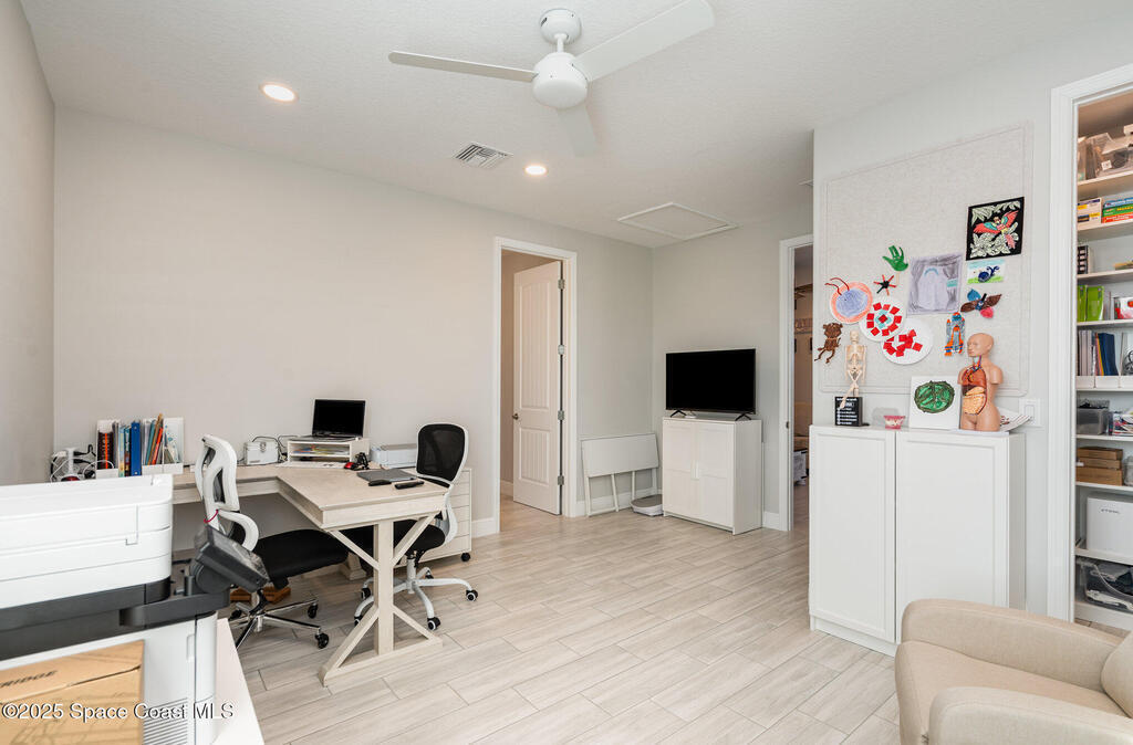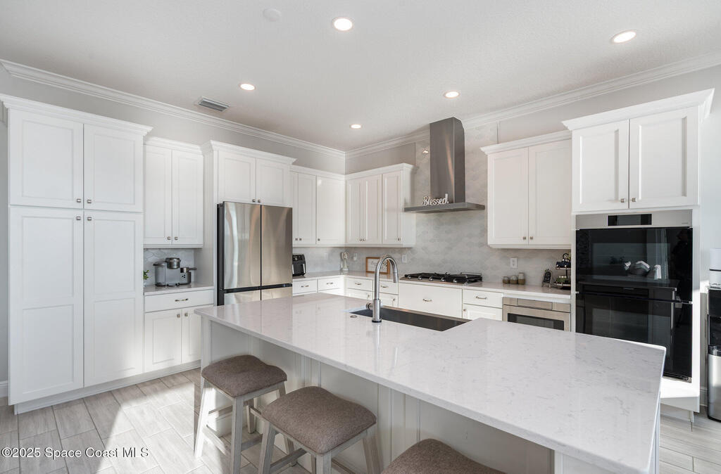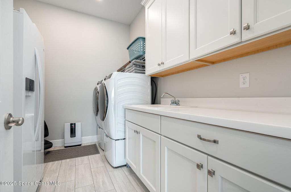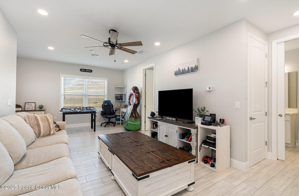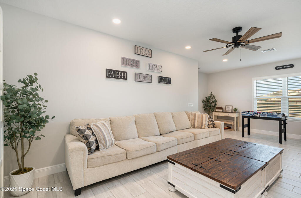 Nearly new 2024-built home in Viera's exclusive Laurasia! This spacious 4-bedroom, 4.5-bath residence offers 3,690 sq ft of bright, open-concept living with soaring ceilings and effortless flow for everyday comfort or entertaining. The Gourmet Kitchen package dazzles with Level 4 cabinets, upgraded countertops, and a microwave drawer. Premium Level 3 flooring runs throughout, with matching tile upstairs. Unwind by a 6-ft electric fireplace set on a custom stone wall. Impact windows, a cell-phone booster, and abundant LED high-hat lighting on both floors elevate daily living. The primary suite adds a relaxing soaking tub and premium shower. A private study, laundry cabinets, and extra garage direct-line outlets add function. Outside, enjoy a premium lot with extra lanai outlets plus water and gas stubs, pool-service prep, and space to build your dream backyard oasis. Minutes to schools, parks, The Avenue Viera, beaches, I-95, and Space Coast employers--move-in ready. A MUST SEE!