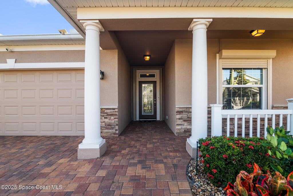 Charming curb appeal sets the tone in this gated community, where tropical landscaping, stone filled edged plantings beds & pavers lead from the driveway to the charming front porch & leaded-glass front door. Inside, gorgeous new vinyl plank flooring - no carpet - flows through a bright modern open floorplan designed for effortless living & entertaining. The kitchen shines with solid wood 42'' high cabinets, granite counters & newer stainless appliances. The spacious owner's suite offers a peaceful retreat with a huge walk-in closet & stunning ensuite featuring a zero-entry shower & granite-topped double sink vanity. Two generous guest bedrooms & a guest bath provide comfort for visitors. Step out of the great room to enjoy Florida living on the large under-truss porch & pavered patio overlooking the expansive, fully fenced backyard. Updates include a 2020 HVAC, 2023 tankless water heater, electric roll-down shutters at the front window & back porch, & accordions on remaining windows.