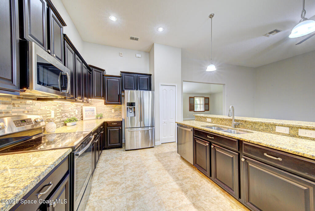 Conveniently located in the beautiful 55+ community of Heritage Isle/Viera. So close to Viera hospital, shopping, restaurants & I95 access. With 4 bedrooms & 3 full baths you'll have plenty of room for guests - plus the spacious 3 car garage affords room for your cars and golf cart! Freshly painted interior. New roof in Dec 2024, AC in 2021 , storm shutters on all windows, expanded screened back patio, covered entryway, interior plantation shutters, tile floors throughout the main living areas. Handicap accessible roll in shower in primary bath, plus large walk-in closet & double sink vanity. Open concept kitchen ideally set up for entertaining with breakfast bar, pantry, granite countertops, tile backsplash, under cabinet lighting and stainless steel appliances. This sought after, very active community boasts multiple walking/biking trails, a gorgeous clubhouse with restaurant/bar/library, function rooms, resort style pool, shuffle board, tennis courts, full time guard/gate and more!