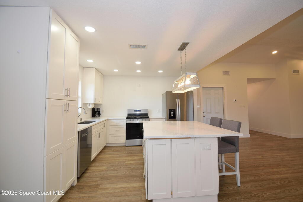 Discover this well cared for 3 bedroom, 2 bath concrete block home in Titusville featuring a standout updated kitchen and inviting outdoor living space. Inside, vinyl plank flooring runs throughout a bright, open layout designed for everyday comfort.The kitchen is truly the focal point of the home and showcases Australian quartz countertops, stainless steel appliances, a gas range, soft-close shaker style cabinets, and generous prep and storage space. The combination of quartz surfaces and gas cooking creates a functional and stylish workspace that will appeal to anyone who enjoys spending time in the kitchen.Both bathrooms have been updated with modern finishes, continuing the refreshed feel throughout the home.Step outside to a fully fenced backyard offering space to relax, garden, entertain, or create your own outdoor retreat. The large screened patio extends the living area and provides a comfortable setting for year-round enjoyment. The backyard also features a BBQ that is