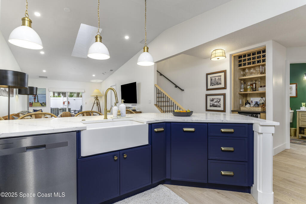 Blending uncommon privacy with cool island vibes, this remodeled end-unit townhouse sits on a quiet cul-de-sac just a short stroll from the beach. Vaulted ceilings & skylights enhance the grandeur of the redesigned open layout ideal for social gatherings. Imagine hosting with a stunning kitchen shining with quartz counters, stainless appliances and a farmhouse sink. Interior highlights include laminate flooring, a built-in bar, barn-door laundry entry and full baths with granite counters and dual vessel sinks. The first-floor primary ensuite offers lanai access, tailored wall paneling, his/hers closets and a pleasing bath with jet tub & tiled shower. The spare bedrooms & bath are upstairs. Create an outdoor oasis on the cozy lanai & composite deck surrounded by a vinyl privacy fence. Impact windows, accordion shutter, new A/C & security system add peace of mind. HOA covers lawn care, exterior & pool. Come experience chic coastal living filled with sand, sunshine and simple pleasures.
