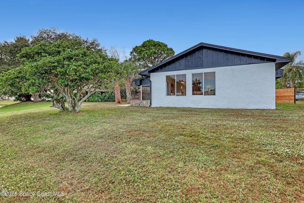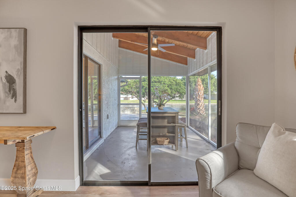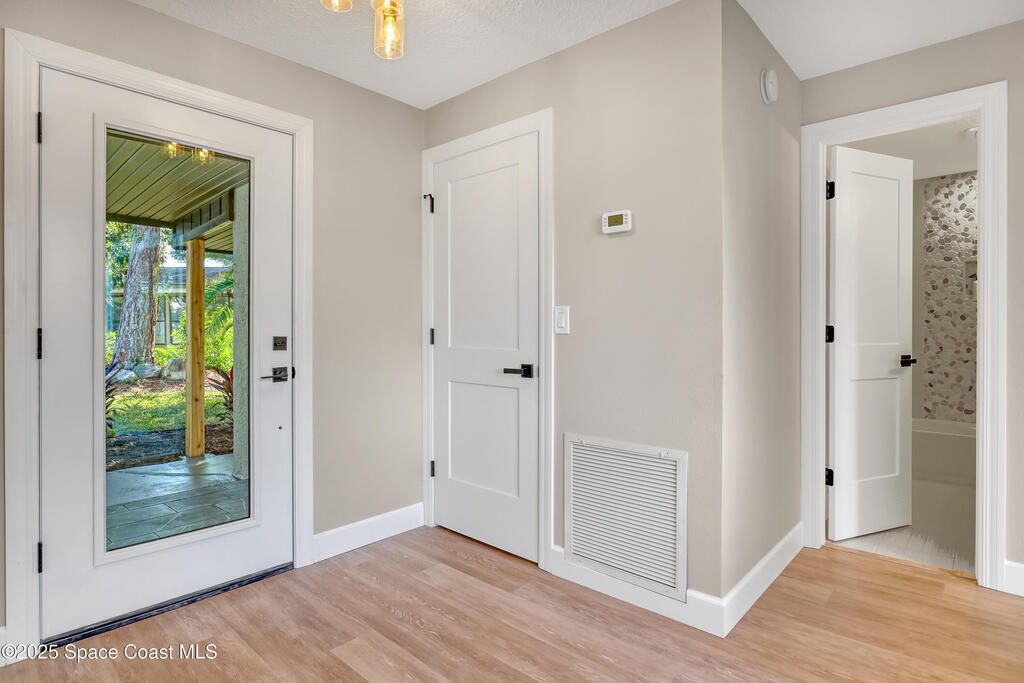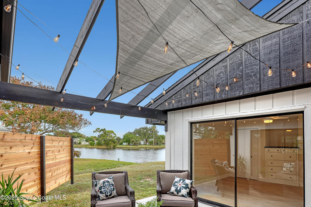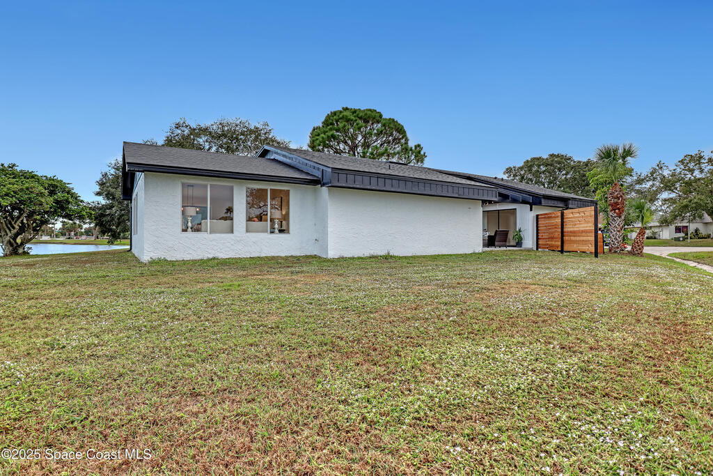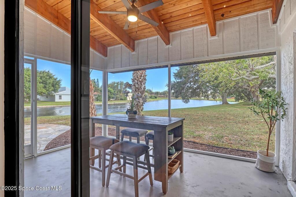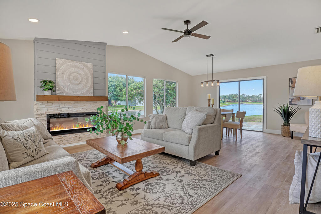 Tired of cookie-cutter Viera/Suntree homes?...then this house is for you! Filled with unique features. Everything is brand new, so it's like a brand-new house in the heart of Suntree. Large cul-de-sac lot with wrap-around waterfront. Features an office/flex room. New luxury vinyl flooring & lighting throughout. Brand new kitchen with soaring 14' tall ceiling with exposed wood beams and T&G planks. Large quartz island with overhang, 42'' soft-close shaker cabinets, under-cabinet lighting, SS appliances, range hood, coffee corner, and tons of storage. Great room with 180 degree water views & new stone fireplace. Each guest room has their own slider door access to the private atrium that features a new concrete patio, sunshade, & overhead lighting. Both baths are all brand new with pebble tile showers, tile floors, & quartz countertop vanities. Indoor laundry room. All new int/ext doors. New systems: roof (2025), HWH (2025), AC (2019), & select AC ducting (2025). A-rated school district