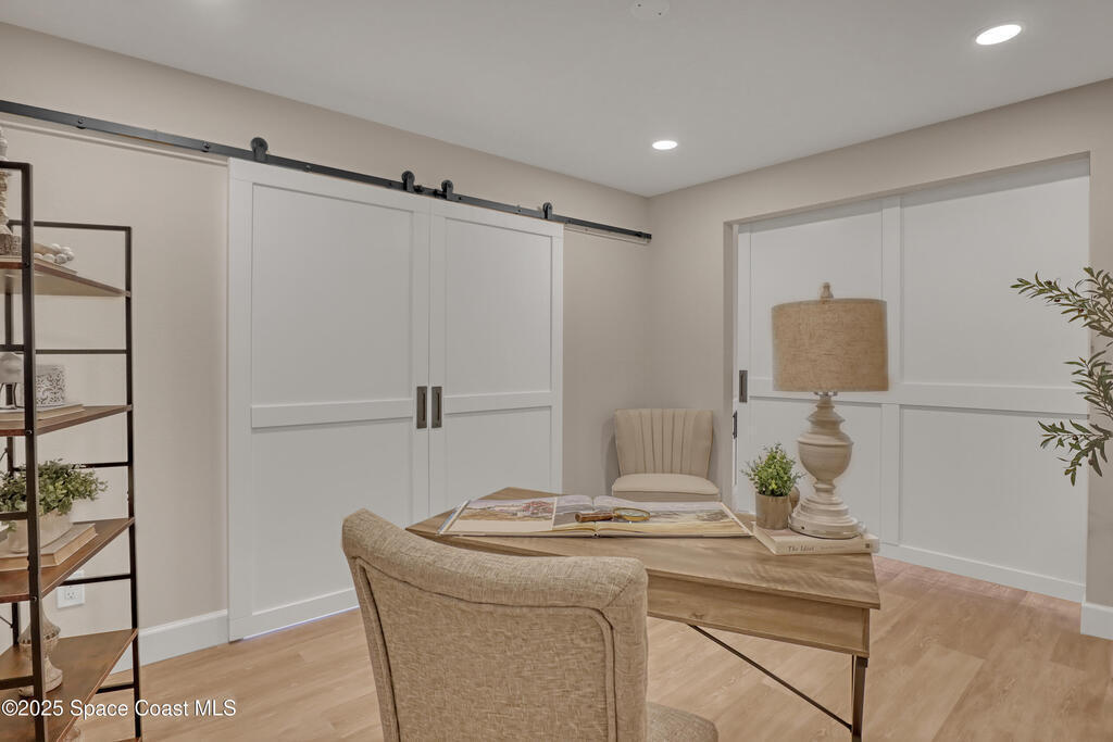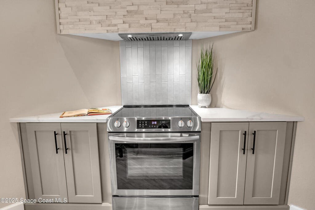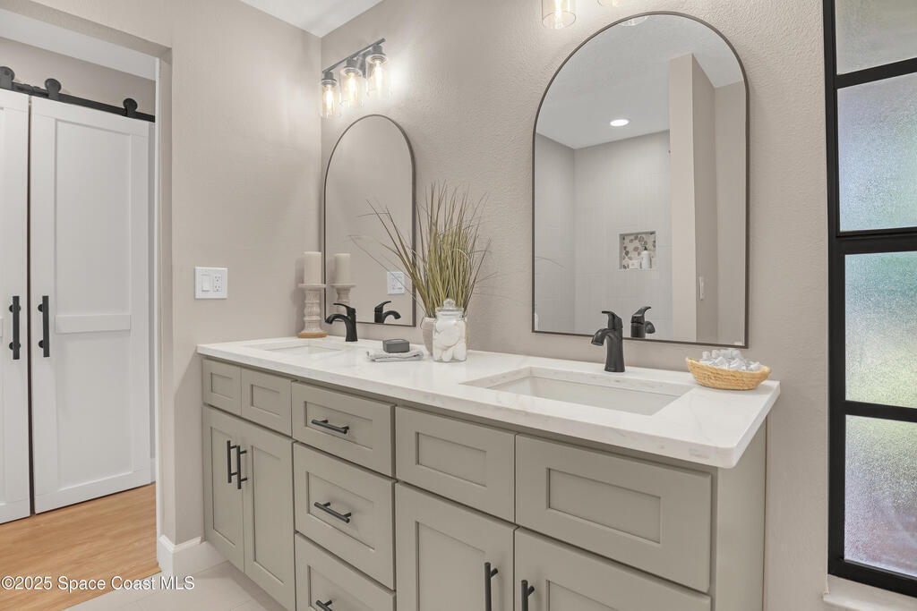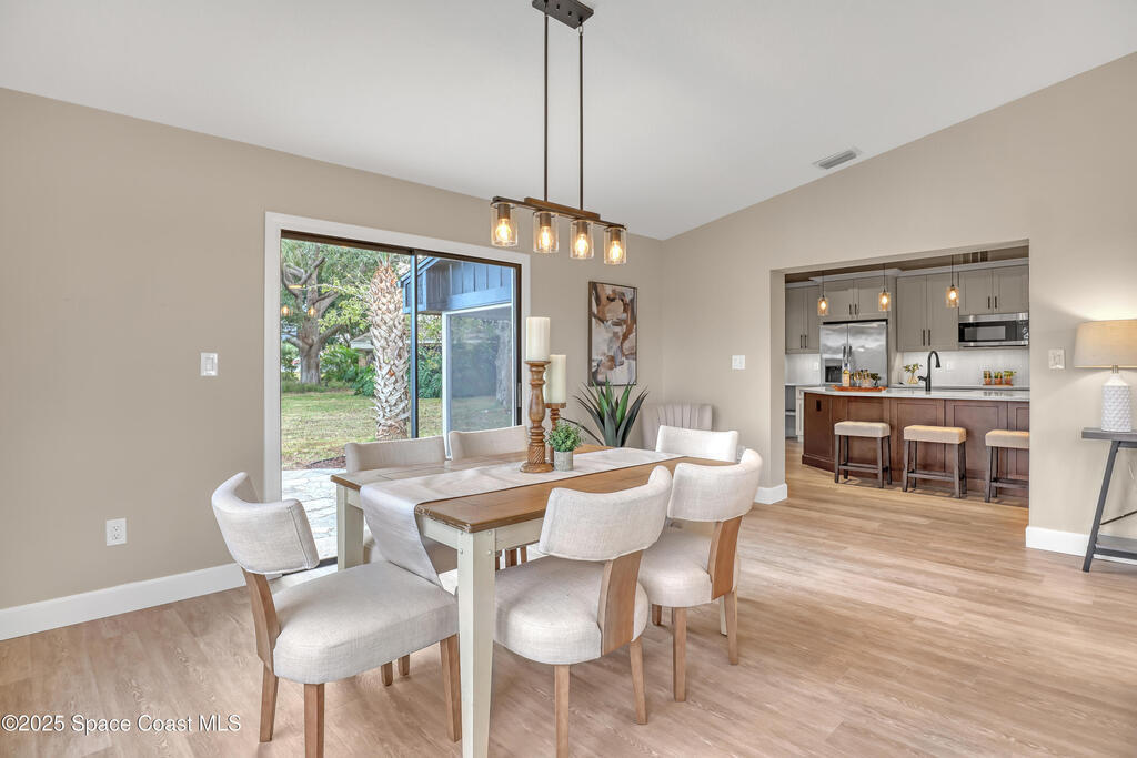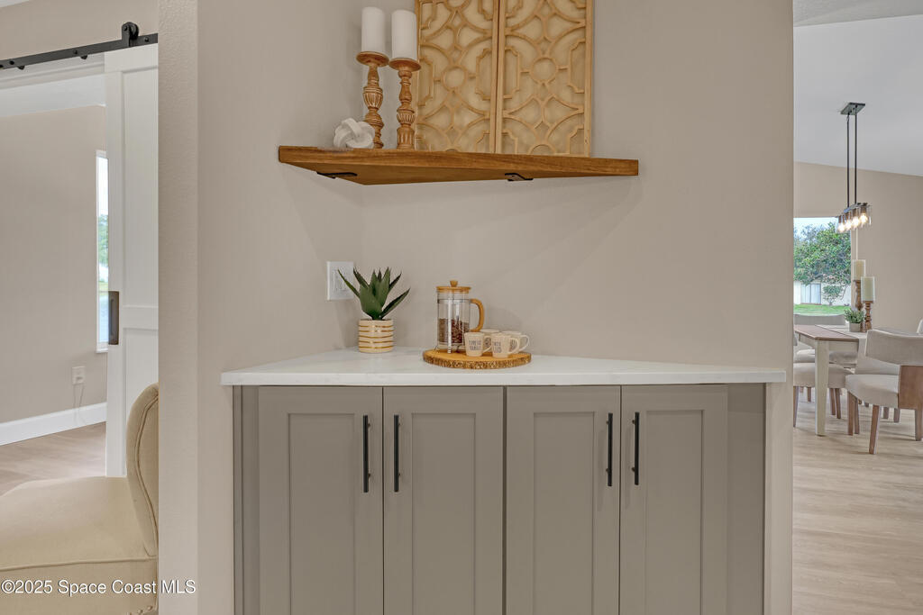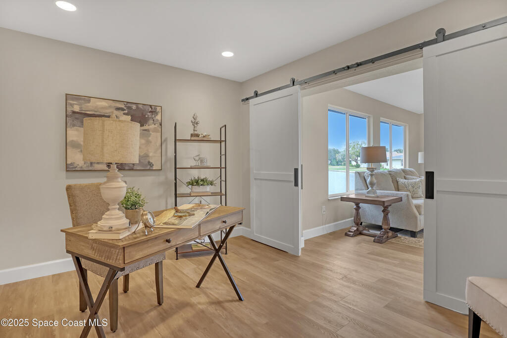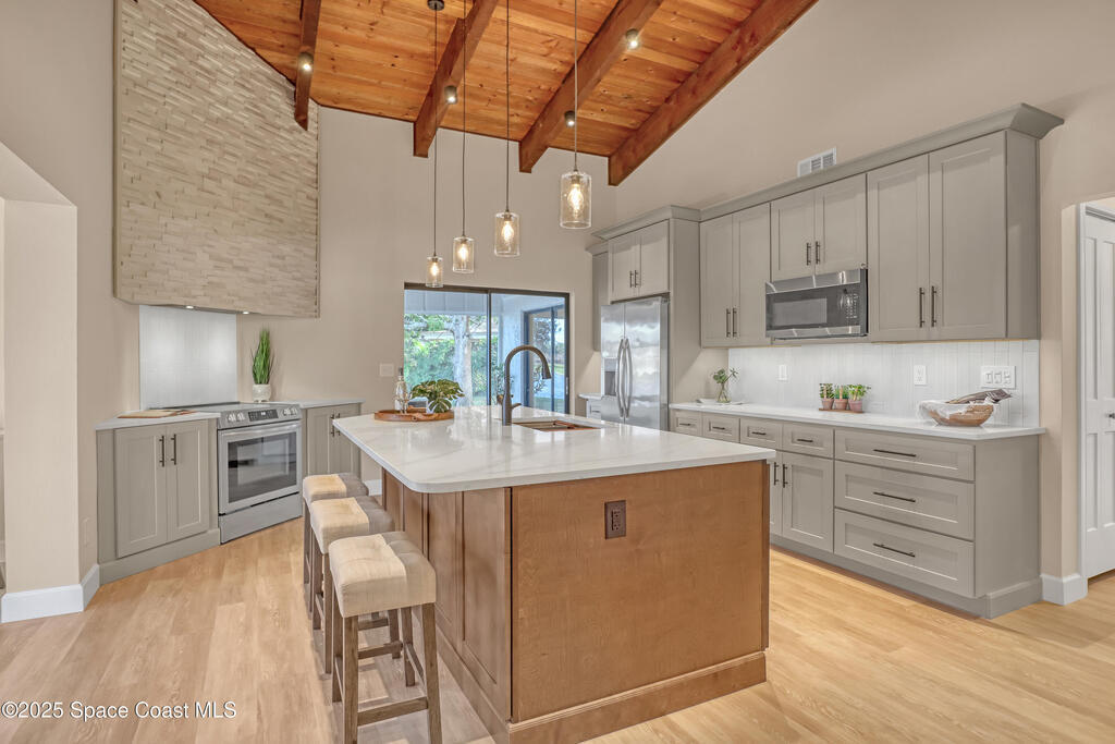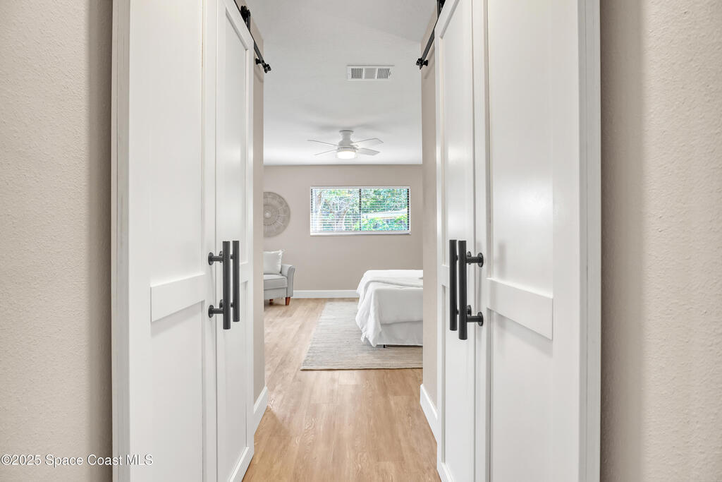 Tired of cookie-cutter Viera/Suntree homes?...then this house is for you! Filled with unique features. Everything is brand new, so it's like a brand-new house in the heart of Suntree. Large cul-de-sac lot with wrap-around waterfront. Features an office/flex room. New luxury vinyl flooring & lighting throughout. Brand new kitchen with soaring 14' tall ceiling with exposed wood beams and T&G planks. Large quartz island with overhang, 42'' soft-close shaker cabinets, under-cabinet lighting, SS appliances, range hood, coffee corner, and tons of storage. Great room with 180 degree water views & new stone fireplace. Each guest room has their own slider door access to the private atrium that features a new concrete patio, sunshade, & overhead lighting. Both baths are all brand new with pebble tile showers, tile floors, & quartz countertop vanities. Indoor laundry room. All new int/ext doors. New systems: roof (2025), HWH (2025), AC (2019), & select AC ducting (2025). A-rated school district