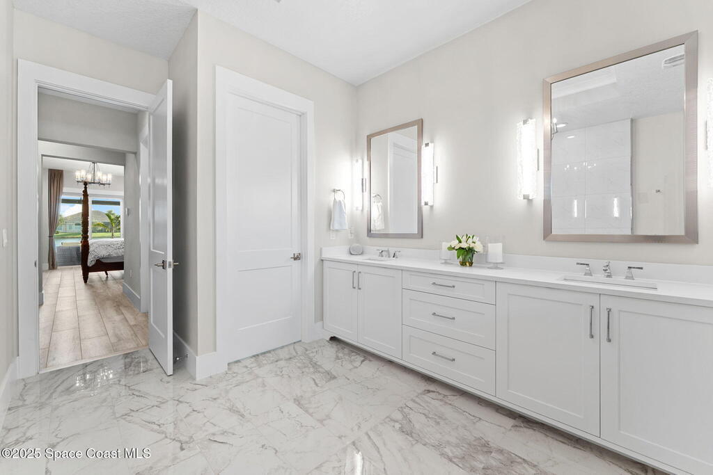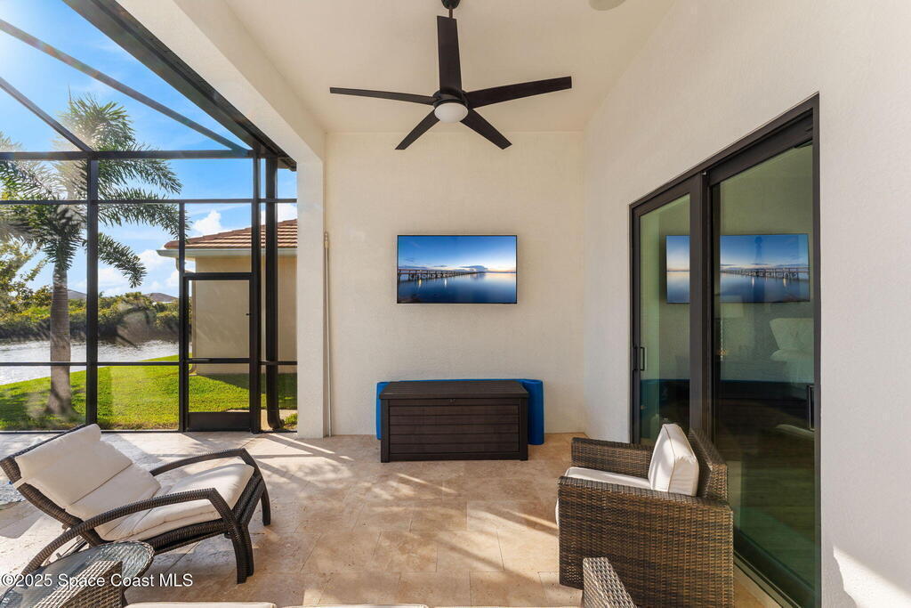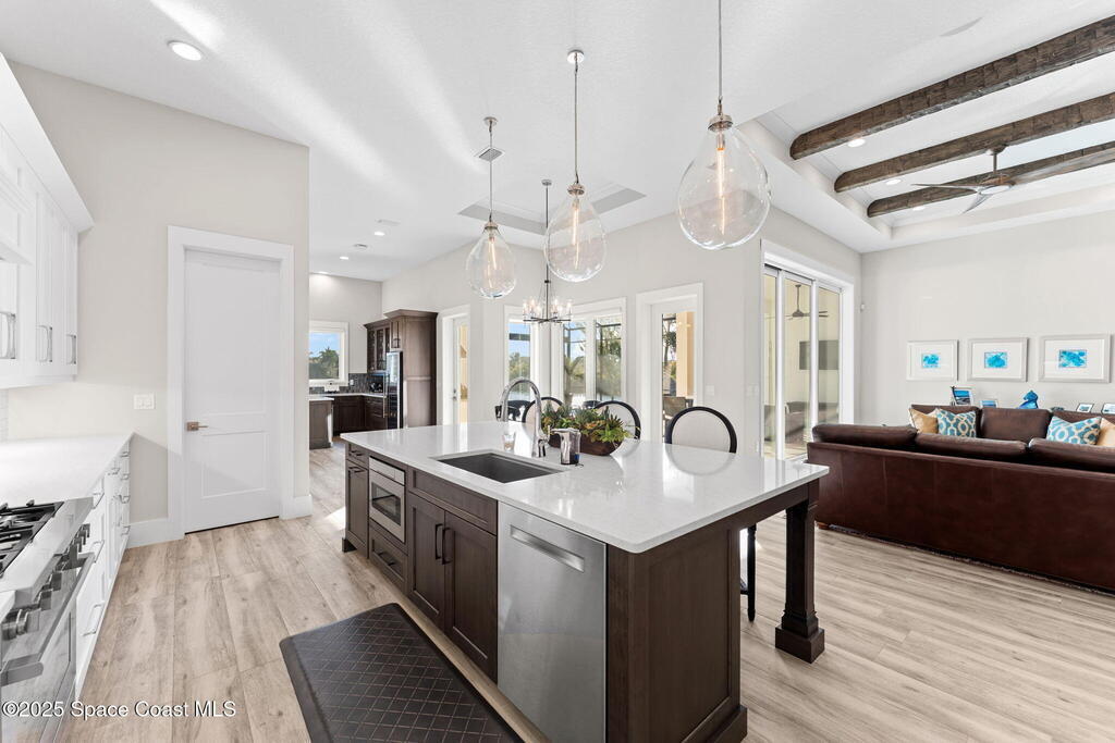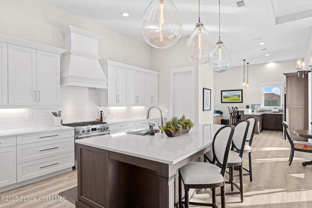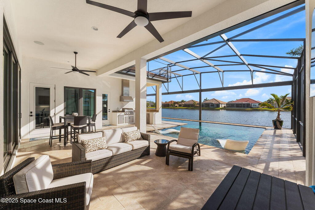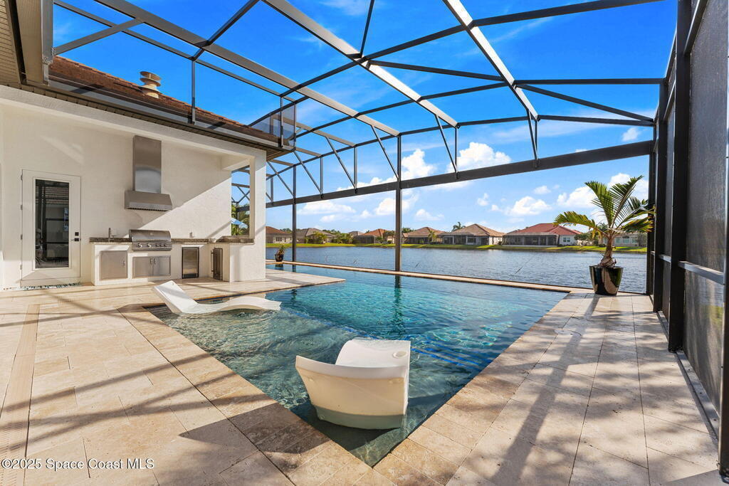 Experience this stunning Santa Rosa floor plan home featuring 3 bedrooms, a study, 3 baths, and a spacious 3-car garage. Built by one of Brevard's most reputable long-standing builders, this residence showcases quality throughout with 8' sliders, an elegant front door, wood-look porcelain tile flooring, a tile roof, soaring 10' ceilings, and tray ceilings. The gourmet kitchen offers 42'' cabinetry, a large island, quartz countertops, tile backsplash, a pantry, and upgraded stainless-steel appliances. The open layout includes two living areas filled with natural light from expansive sliders leading to the impressive screened outdoor oasis. Enjoy a resort-style pool with sun shelf, built-in loungers, tile accents, and a spacious travertine deck perfect for entertaining. The covered lanai features multiple seating areas, ceiling fans, and a full outdoor kitchen with a built-in grill. Gas is pre-piped to the lanai for easy outdoor cooking.