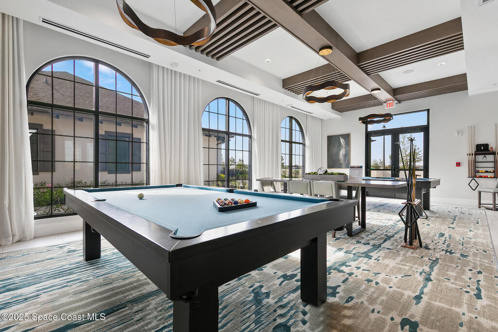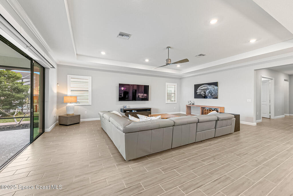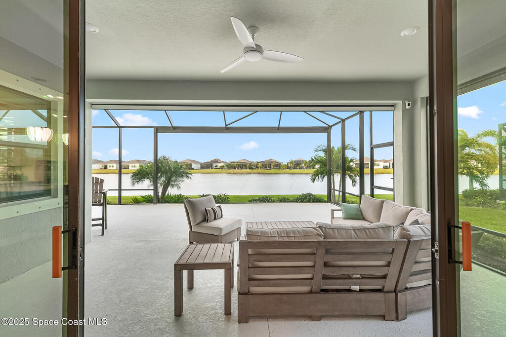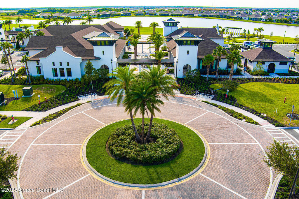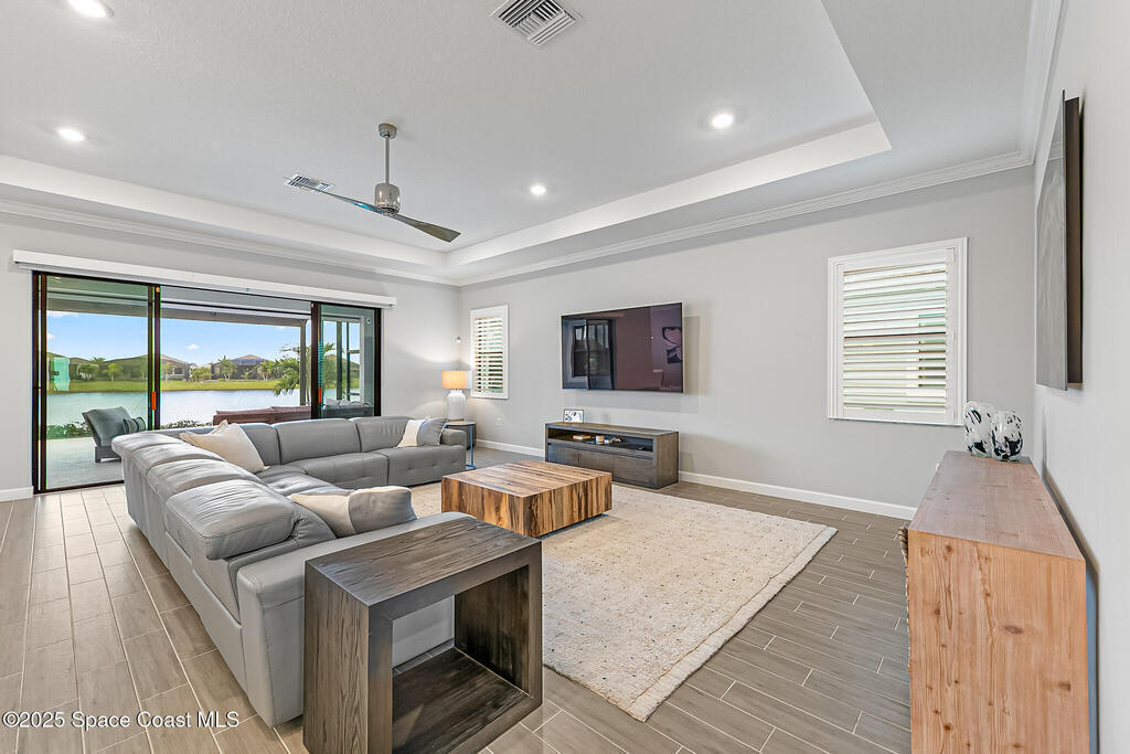 Home crafted with classy sleek lines and a curated comfort that whispers of elegance! The stunning living room, kitchen & 12x12 dining area blend effortlessly together while the 12 X 8 sliding glass opening offers a wide view of the lake & the extended screened lanai. Tray ceiling, crown moldings, plantation shutters, motorized roll-down-shades, earthy neutral tile floors, artsy high-end island pendants & a dining chandelier offer both function & aesthetics. This 2784 sf home consists of 3 bedrooms (all en-suites) / flex/media room / XL laundry / half bath & a ''mudroom'' hall out to the 3 car garage w epoxy floors. Owner's suite w soaking tub, shower, his/hers WI-closets & vanities. The trussed lanai has roll down storm shutters & all windows have accordion shutters. Located in Viera in a gated 55+ resort living community with top-of-the-line amenities (even a movie theater) & miles of scenic sidewalks. Close to shopping, fresh produce & 15 min to the beach.