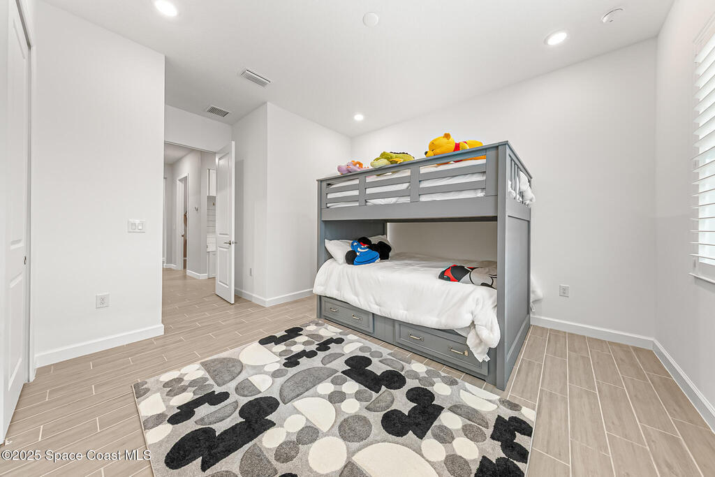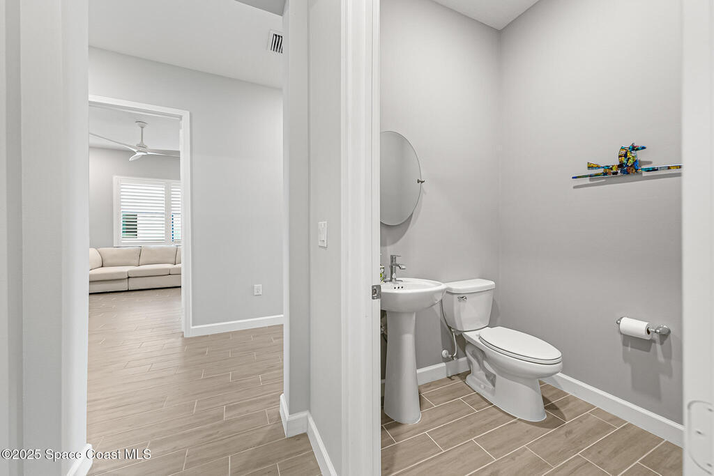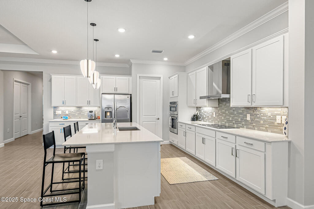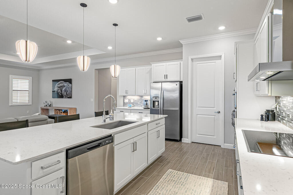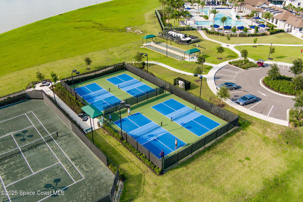 Home crafted with classy sleek lines and a curated comfort that whispers of elegance! The stunning living room, kitchen & 12x12 dining area blend effortlessly together while the 12 X 8 sliding glass opening offers a wide view of the lake & the extended screened lanai. Tray ceiling, crown moldings, plantation shutters, motorized roll-down-shades, earthy neutral tile floors, artsy high-end island pendants & a dining chandelier offer both function & aesthetics. This 2784 sf home consists of 3 bedrooms (all en-suites) / flex/media room / XL laundry / half bath & a ''mudroom'' hall out to the 3 car garage w epoxy floors. Owner's suite w soaking tub, shower, his/hers WI-closets & vanities. The trussed lanai has roll down storm shutters & all windows have accordion shutters. Located in Viera in a gated 55+ resort living community with top-of-the-line amenities (even a movie theater) & miles of scenic sidewalks. Close to shopping, fresh produce & 15 min to the beach.
