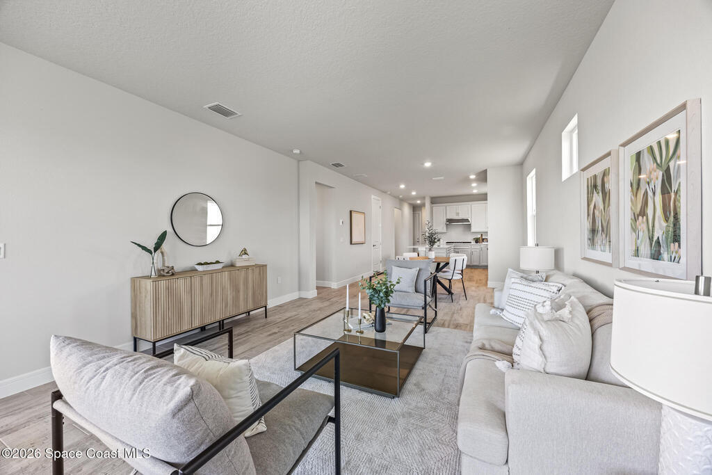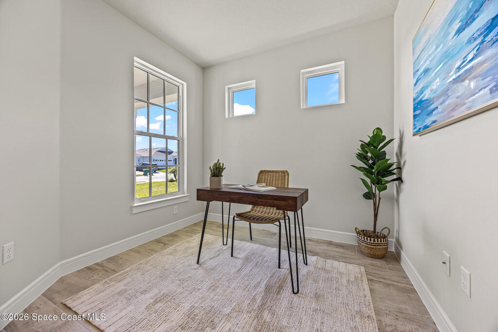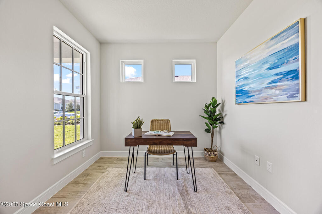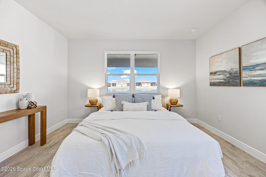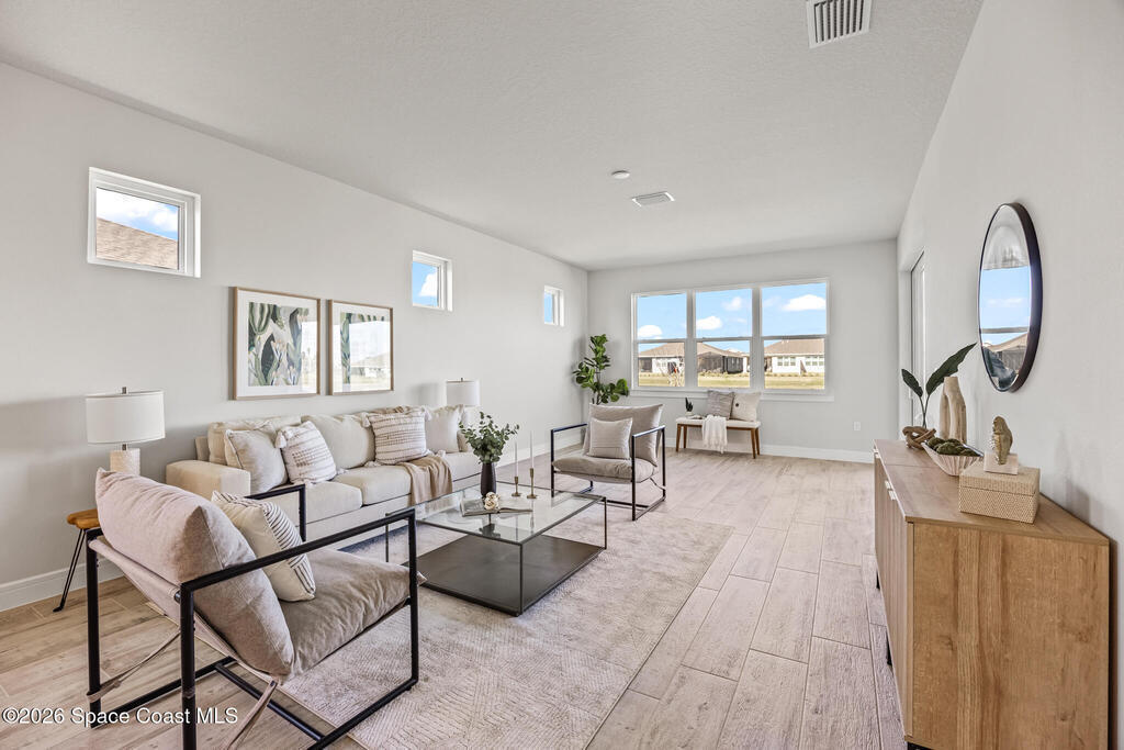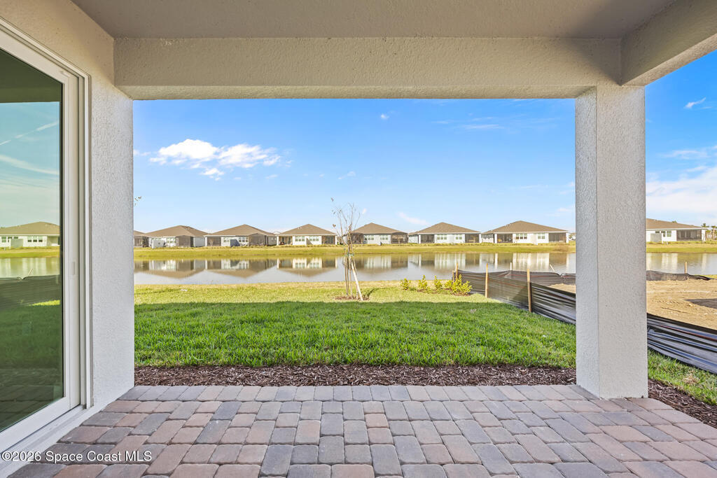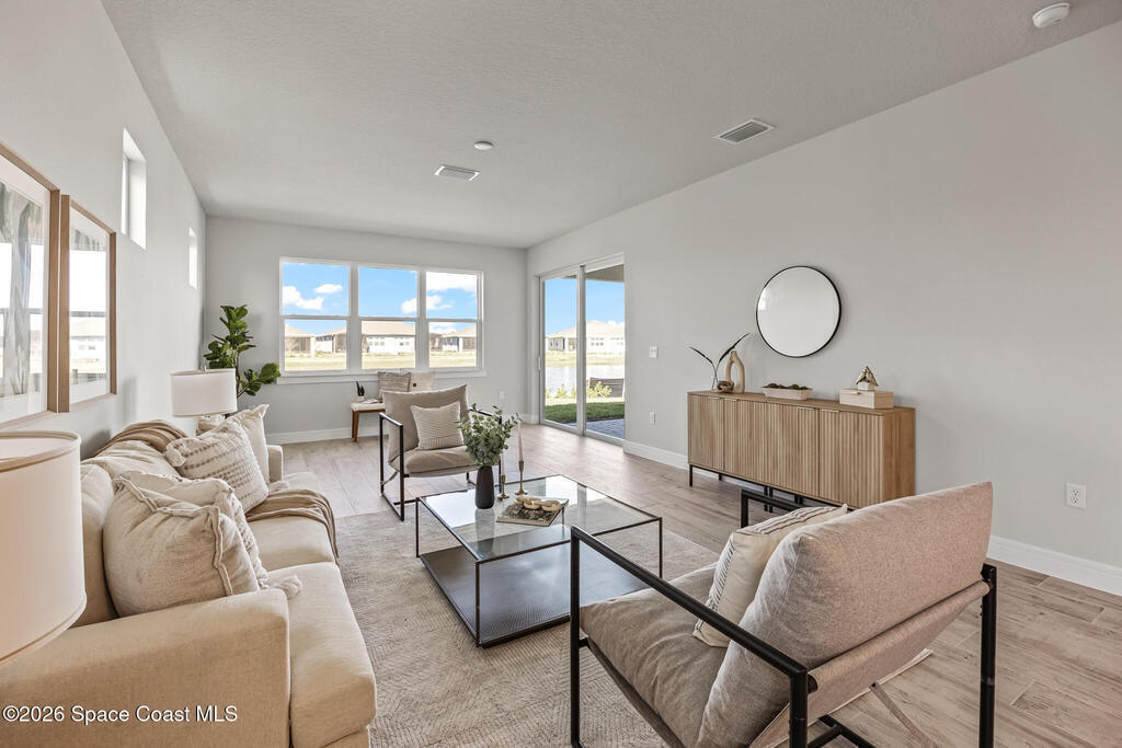 Brand New home never lived in!! Amazing upgrades, hurricane rated impact windows/doors, located on a pond with back porch facing North for beautiful Launch views! Built and finished December 2025, this is a 2 bedroom 2 bathroom home with a front office that could be turned into a 3rd bedroom that would fit a twin bed or Murphy bed. Porcelain (wood look) tile throughout the home. There are 2 showers and no baths in home. This Contour model has the extended living area giving more room for the dining room area and larger couch sectional or larger living room set! All landscaping and lawn care is covered in your HOA fees. You pay $840 a year towards your restaurant bill in the clubhouse. This encourages residents to socialize and make friends and what makes this community more unique and stand apart from other local 55+ communities. You have Publix and Viera Hospital within 2 miles of your home!
