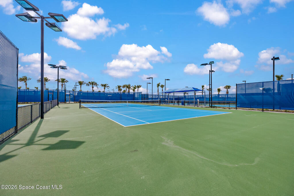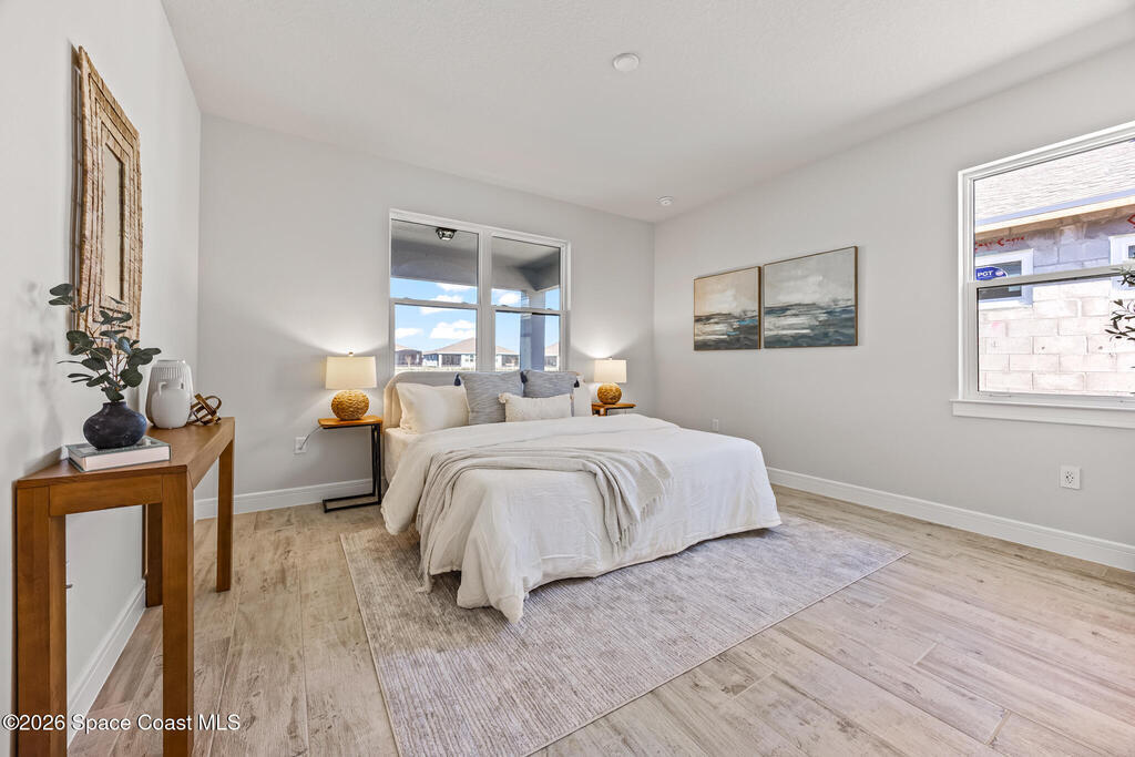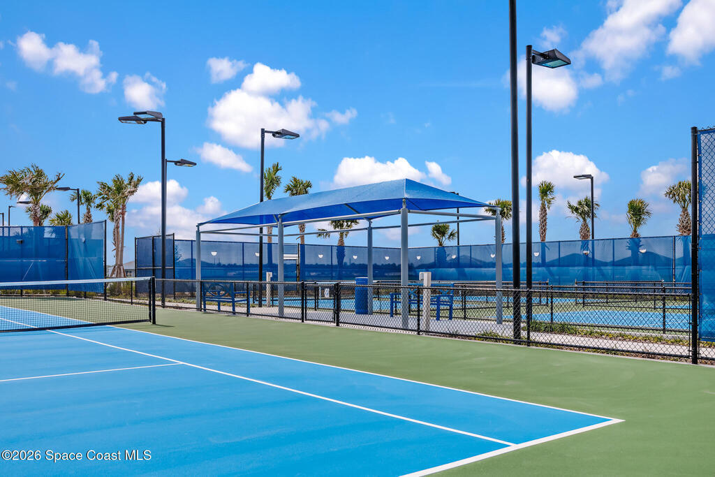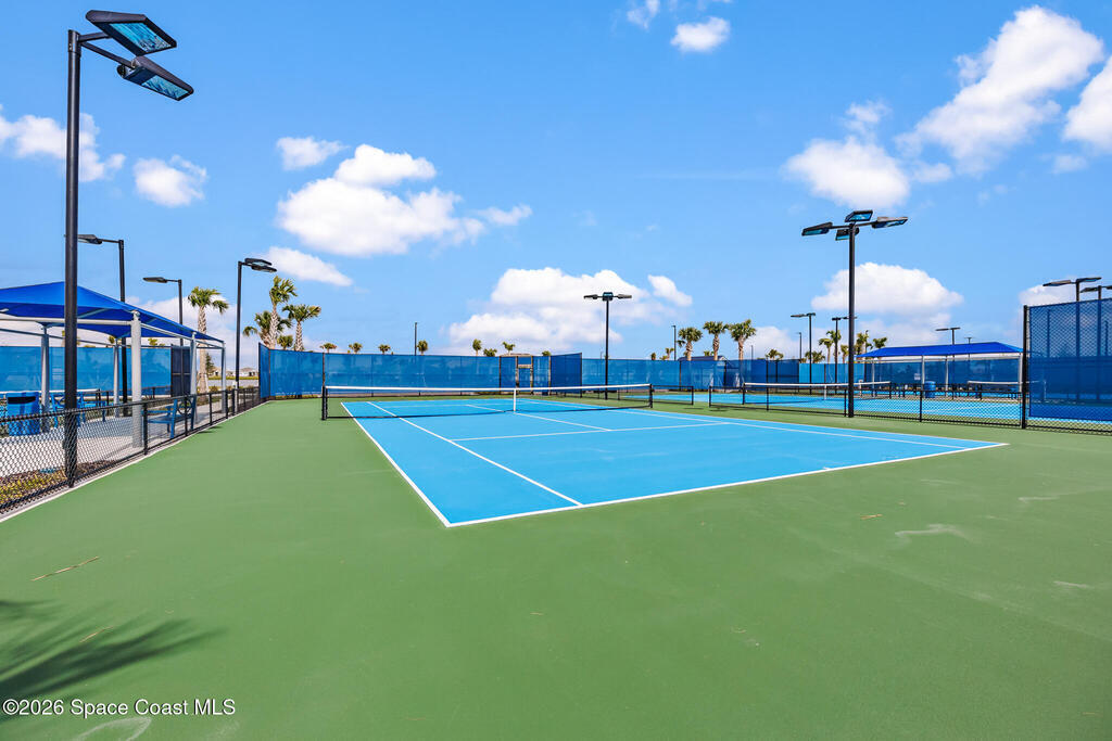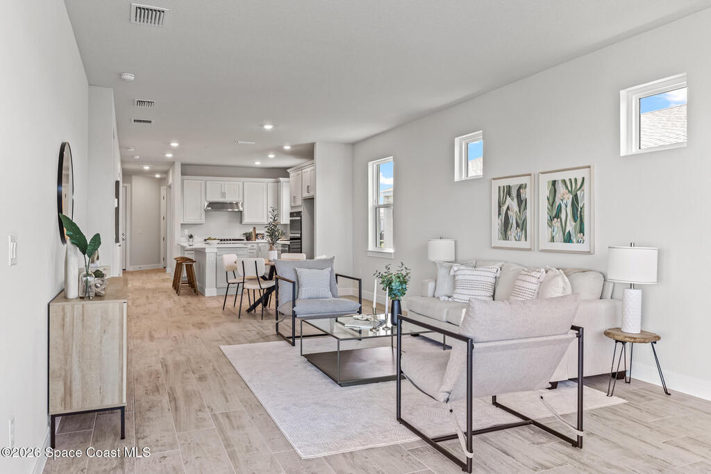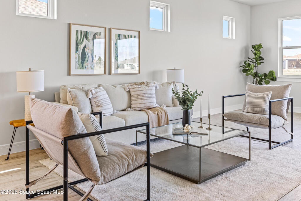 Brand New home never lived in!! Amazing upgrades, hurricane rated impact windows/doors, located on a pond with back porch facing North for beautiful Launch views! Built and finished December 2025, this is a 2 bedroom 2 bathroom home with a front office that could be turned into a 3rd bedroom that would fit a twin bed or Murphy bed. Porcelain (wood look) tile throughout the home. There are 2 showers and no baths in home. This Contour model has the extended living area giving more room for the dining room area and larger couch sectional or larger living room set! All landscaping and lawn care is covered in your HOA fees. You pay $840 a year towards your restaurant bill in the clubhouse. This encourages residents to socialize and make friends and what makes this community more unique and stand apart from other local 55+ communities. You have Publix and Viera Hospital within 2 miles of your home!