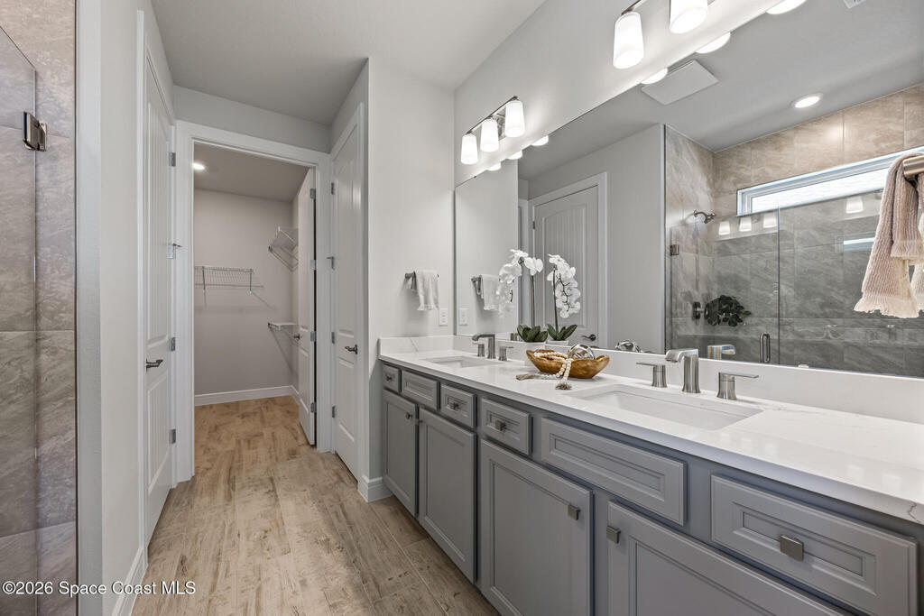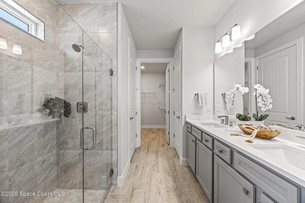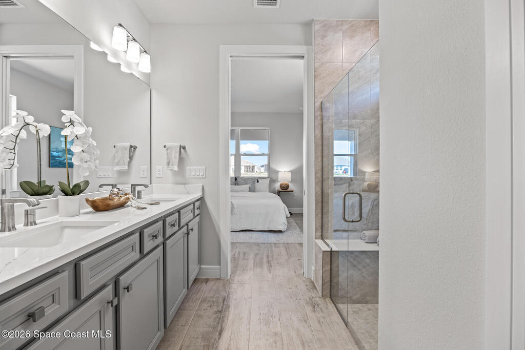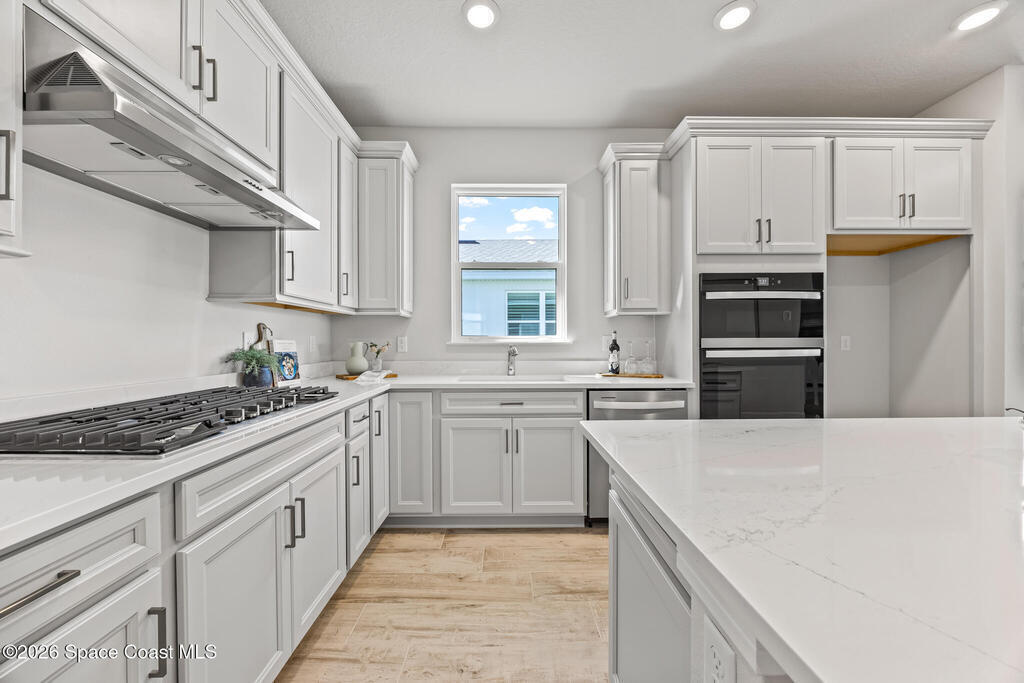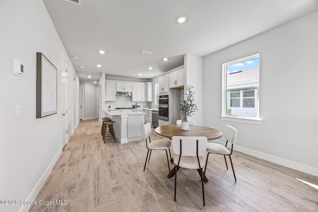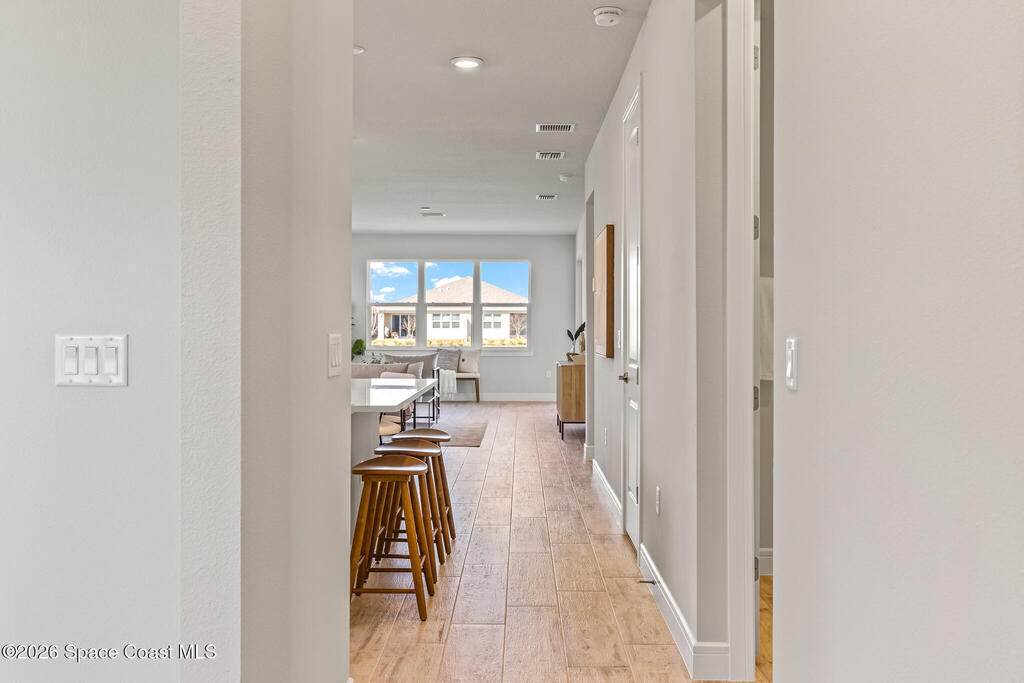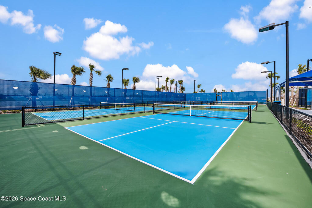 Brand New home never lived in!! Amazing upgrades, hurricane rated impact windows/doors, located on a pond with back porch facing North for beautiful Launch views! Built and finished December 2025, this is a 2 bedroom 2 bathroom home with a front office that could be turned into a 3rd bedroom that would fit a twin bed or Murphy bed. Porcelain (wood look) tile throughout the home. There are 2 showers and no baths in home. This Contour model has the extended living area giving more room for the dining room area and larger couch sectional or larger living room set! All landscaping and lawn care is covered in your HOA fees. You pay $840 a year towards your restaurant bill in the clubhouse. This encourages residents to socialize and make friends and what makes this community more unique and stand apart from other local 55+ communities. You have Publix and Viera Hospital within 2 miles of your home!