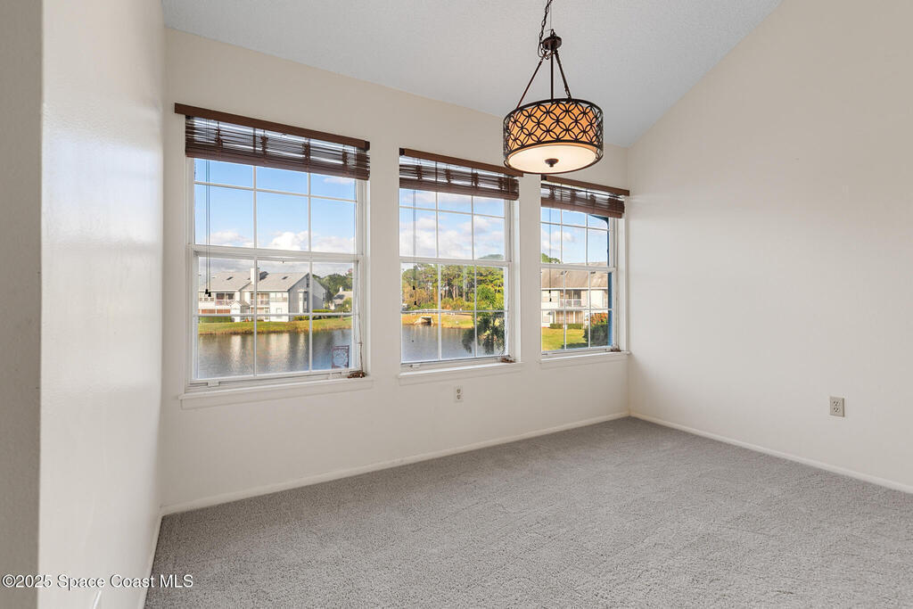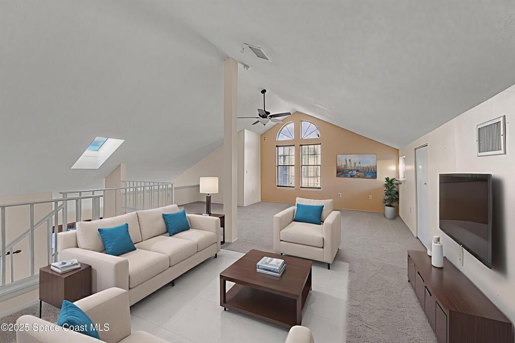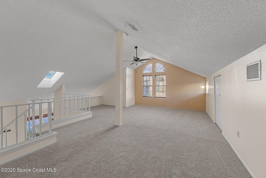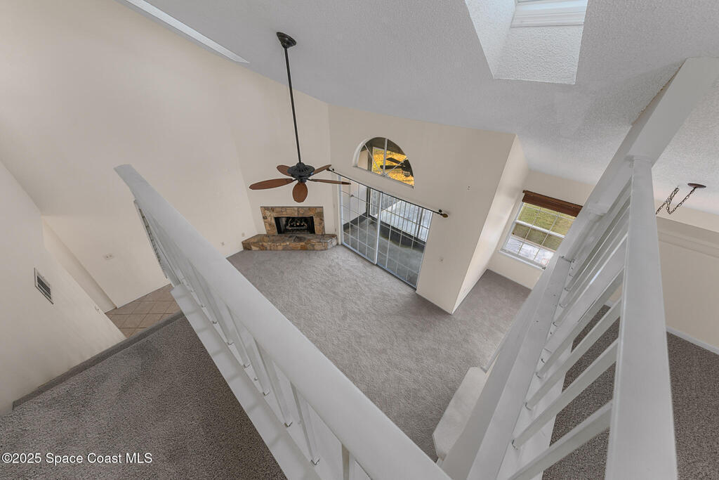 Unique two-story penthouse offering 3 bedrooms and 3 full bathrooms in a convenient central location. Upon entry, the main living area opens to a screened balcony overlooking peaceful water and a fountain, with abundant natural light from skylights and the open loft many feet above. The living room features a fireplace and flows to the balcony, which includes a dedicated laundry area. The kitchen is to the right with a breakfast nook for casual dining. All three bedrooms are located on the first floor, including the primary bedroom, offering comfortable main-level living. Upstairs, a spacious loft overlooks the living area below and provides exceptional flexibility. With two closets and its own full bathroom with shower, this space can easily function as a fourth bedroom, family room, game room, or media room. Assigned parking is located directly in front of the unit stairs for convenience. Ideally situated near shopping, including Florida Institute of Technology & minutes to beaches.