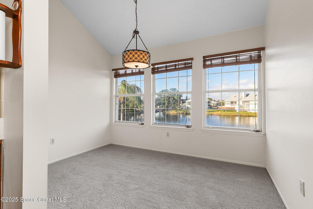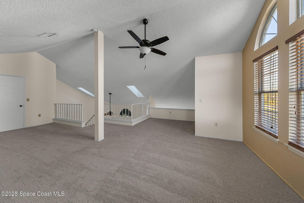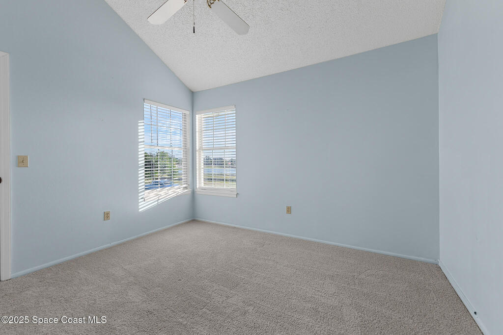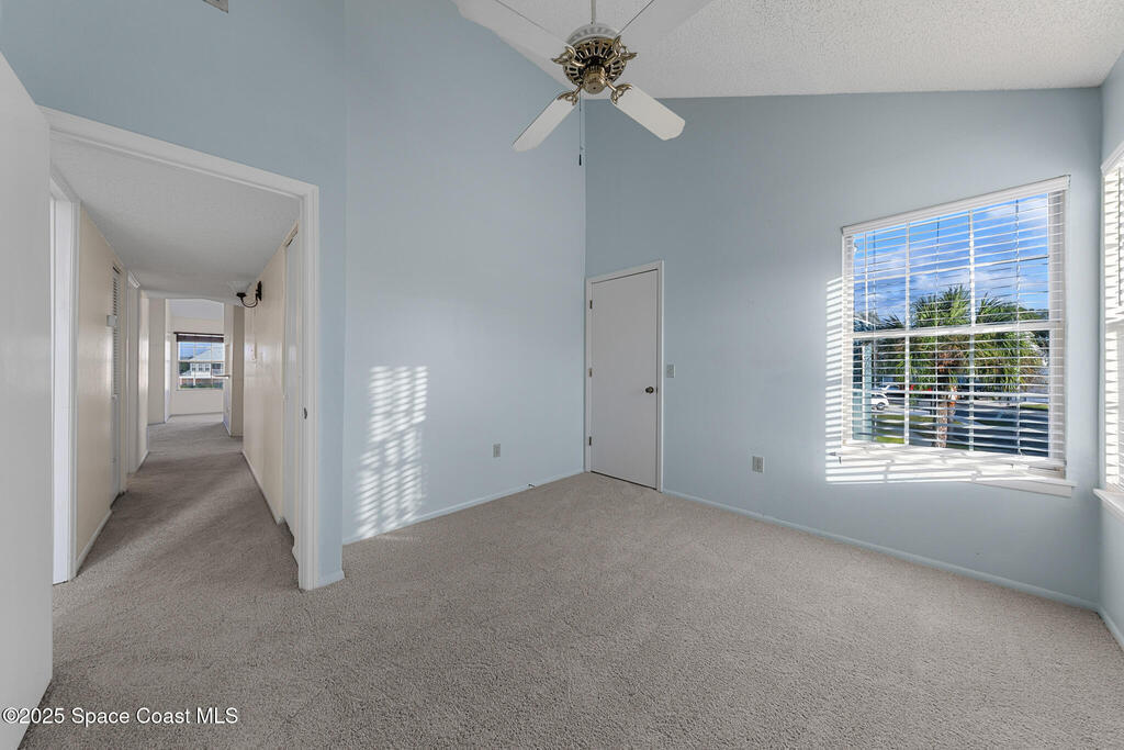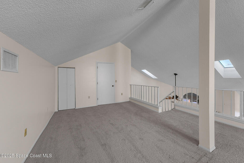 Unique two-story penthouse offering 3 bedrooms and 3 full bathrooms in a convenient central location. Upon entry, the main living area opens to a screened balcony overlooking peaceful water and a fountain, with abundant natural light from skylights and the open loft many feet above. The living room features a fireplace and flows to the balcony, which includes a dedicated laundry area. The kitchen is to the right with a breakfast nook for casual dining. All three bedrooms are located on the first floor, including the primary bedroom, offering comfortable main-level living. Upstairs, a spacious loft overlooks the living area below and provides exceptional flexibility. With two closets and its own full bathroom with shower, this space can easily function as a fourth bedroom, family room, game room, or media room. Assigned parking is located directly in front of the unit stairs for convenience. Ideally situated near shopping, including Florida Institute of Technology & minutes to beaches.