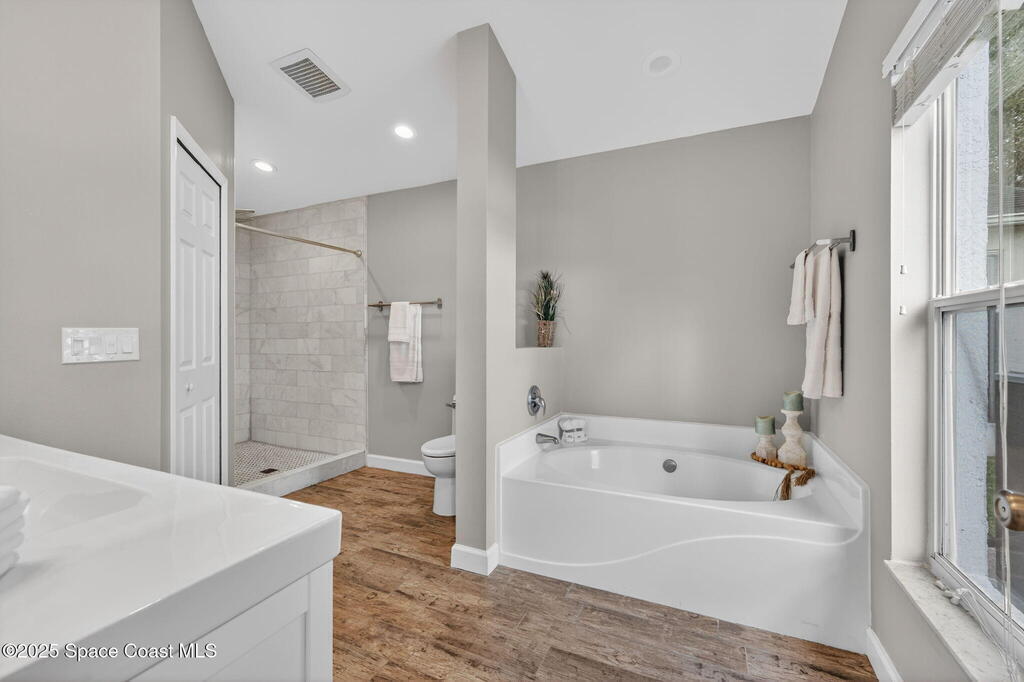 - Interior FeaturesBreakfast Bar, Built-in Features, Ceiling Fan(s), Primary Bathroom -Tub with Separate Shower, Primary Downstairs, Split Bedrooms and Walk-In Closet(s)
