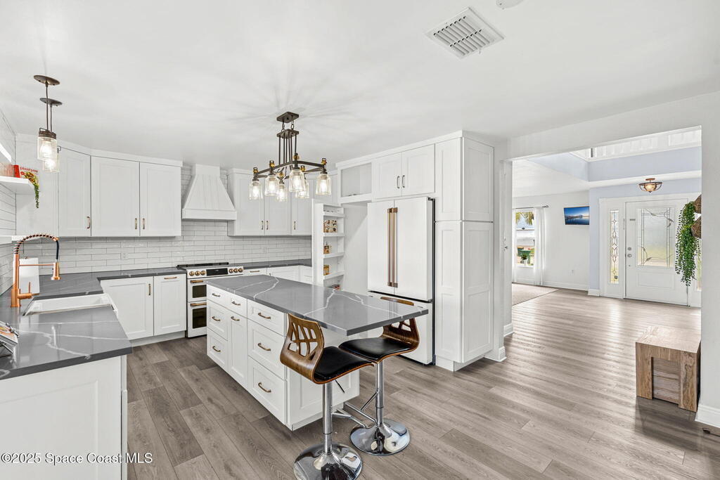 Easy to show! Behind the gates of a low-HOA community, a 5BD/2.5BA standout delivers instant wow w/ fresh interior & exterior paint, new roof, new exterior light fixtures, stone-infused LVP, & custom tile accent walls that feel straight from a designer's mood board. The modern island kitchen steals the show w/ Cambria marbled quartz, counter-to-ceiling subway tile, soft-close artisan white cabinetry, Cafe appliances w/ bronze hardware, an apron-front sink, & a hidden walk-in pantry complete w/ a built-in microwave + butcher-block buffet made for hosting. A 1st-floor BD w/ closet flexes as guest space, office, or bonus room, while the family room brings character w/ shiplap-style walls + floating shelves before opening to a spacious loft. The primary suite reads like a true retreat, styled w/ bedside chandeliers & a spa-like ensuite featuring frosted glass sliders, oblong white tile, a jetted shower, & double rectangular vessel sinks w/ warm wood accents.