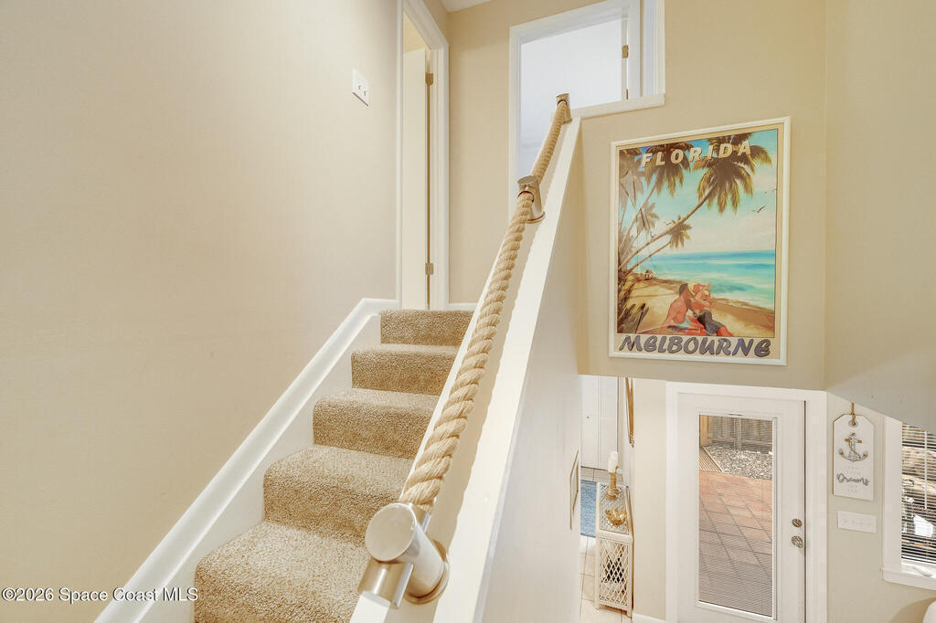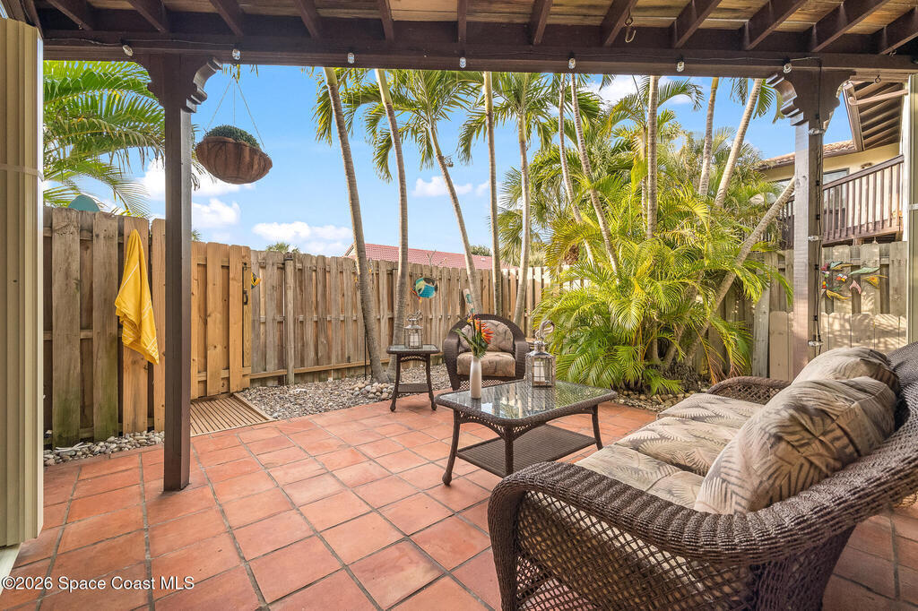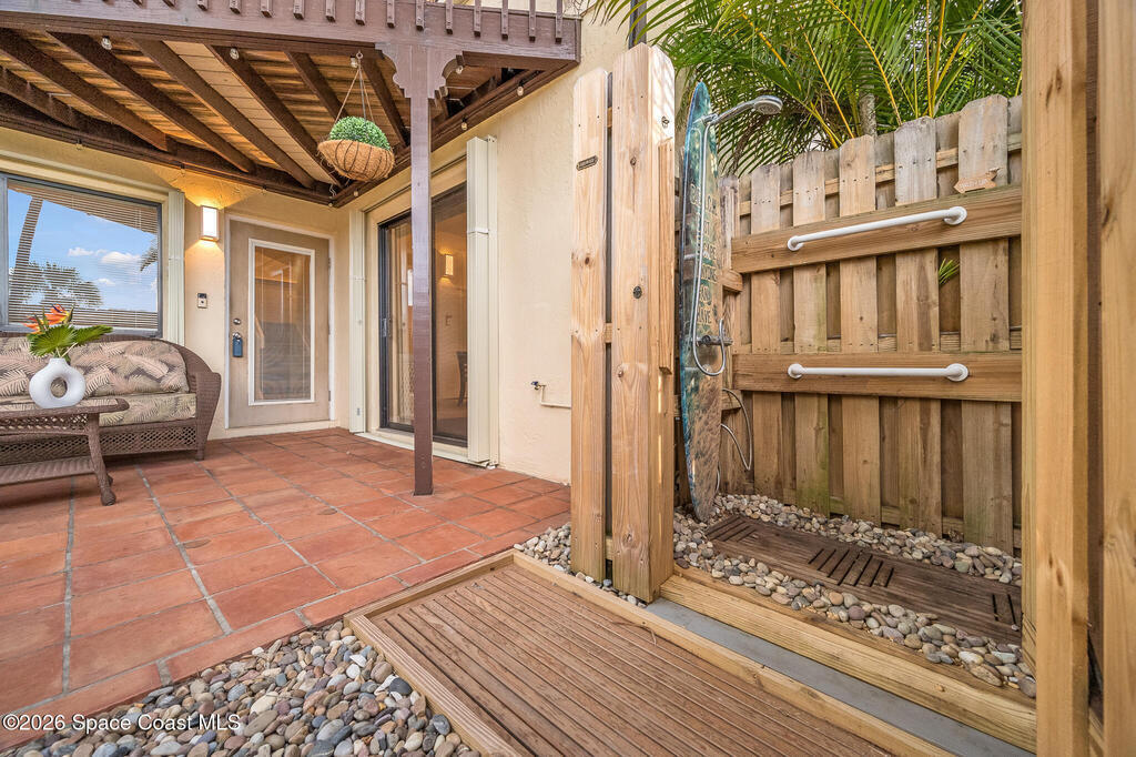 Where else can you live just 412 feet from the Atlantic Ocean at this price? Secure your own slice of coastal living in this updated townhome, perfectly positioned between the Intracoastal Waterway and the ocean. Start your mornings with an easy walk to the shoreline for sunrise and sea-turtle season, and spend evenings enjoying sunsets from your private lanai or with neighbors at the pier.This 2-bedroom, 1.5-bath townhome has been thoughtfully updated, offering abundant natural light and sleek new fixtures that enhance the clean, modern feel. The lanai features an outdoor shower, accent lighting, and Christmas Palms, creating a tranquil retreat after beach time. The upstairs balcony also features lighting, ideal for unwinding and taking in coastal breezes.Residents enjoy low HOA fees and a well-maintained, activity-rich community offering two pools, a fitness center, tennis, pickle-ball, shuffleboard, a clubhouse, and more--all within a short walk of beach access