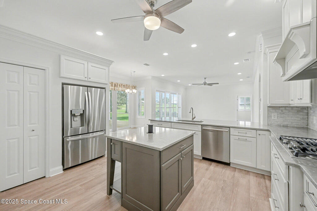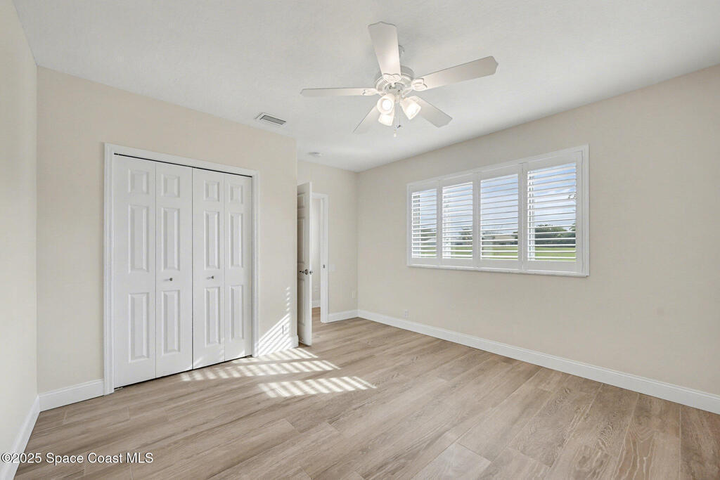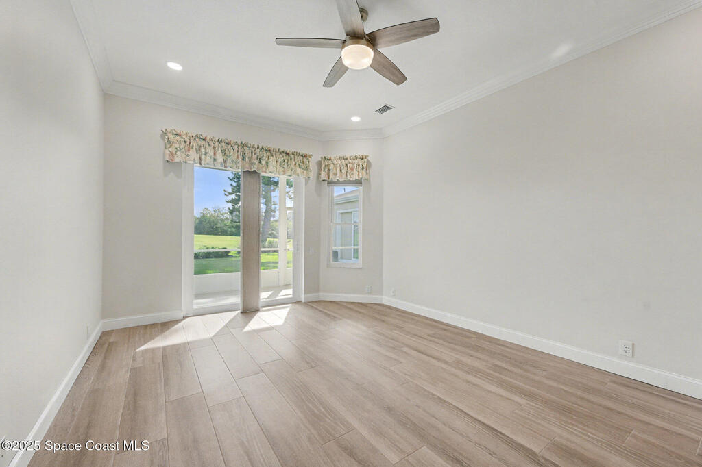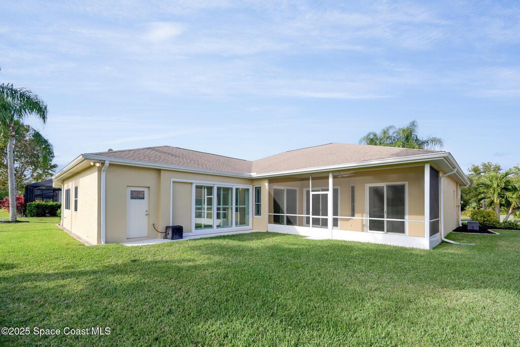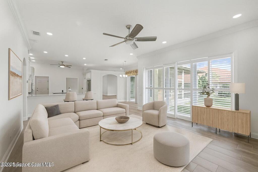 Welcome to an exceptional residence where refined luxury, comfort, and an active lifestyle come together in one of Suntree's most prestigious gated communities. Nestled within Baytree and overlooking the 4th hole of one of Florida's Top 75 golf courses, this stunning four-bedroom, three-bathroom home with a three-car garage offers an elevated living experience designed for those who appreciate quality craftsmanship, thoughtful upgrades, and timeless elegance.Built by one of Brevard County's most respected high-end builders, this home immediately impresses with its commanding presence and meticulous attention to detail. From the moment you step inside, you are greeted by an expansive open floor plan enhanced by soaring high ceilings that create a sense of grandeur and effortless flow. Natural light pours through impact-rated windows and sliding doors, illuminating the beautifully updated ceramic plank flooring that runs seamlessly throughout the entire home.