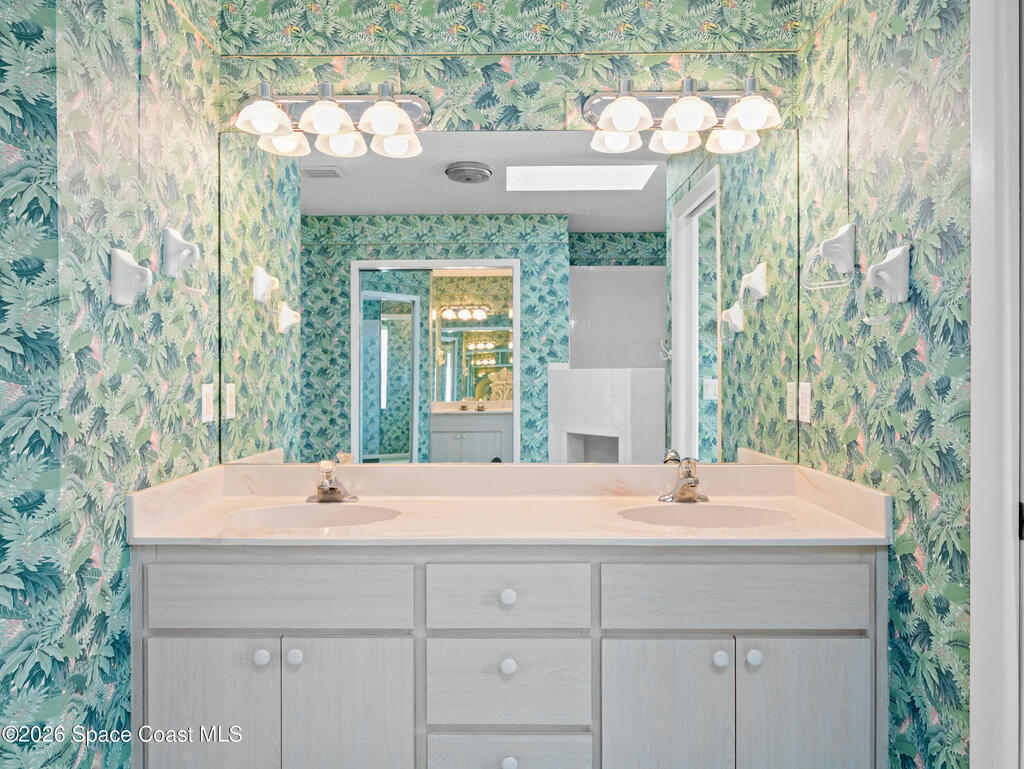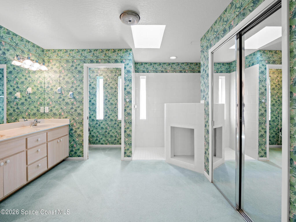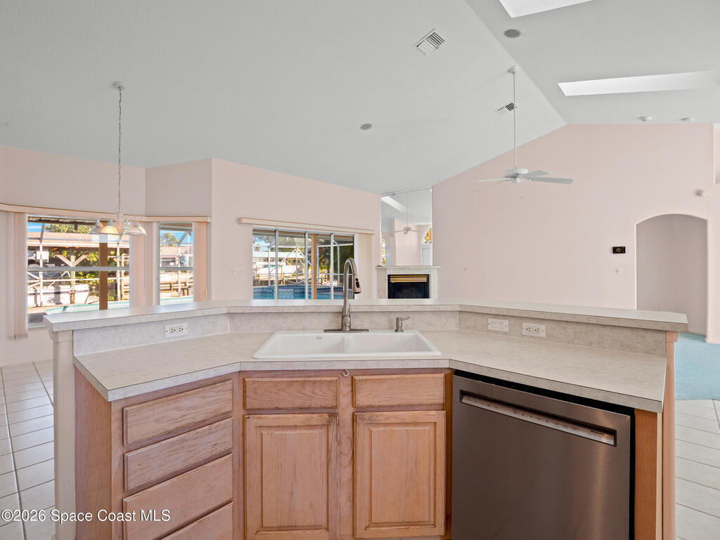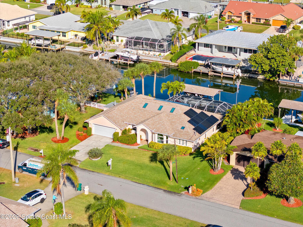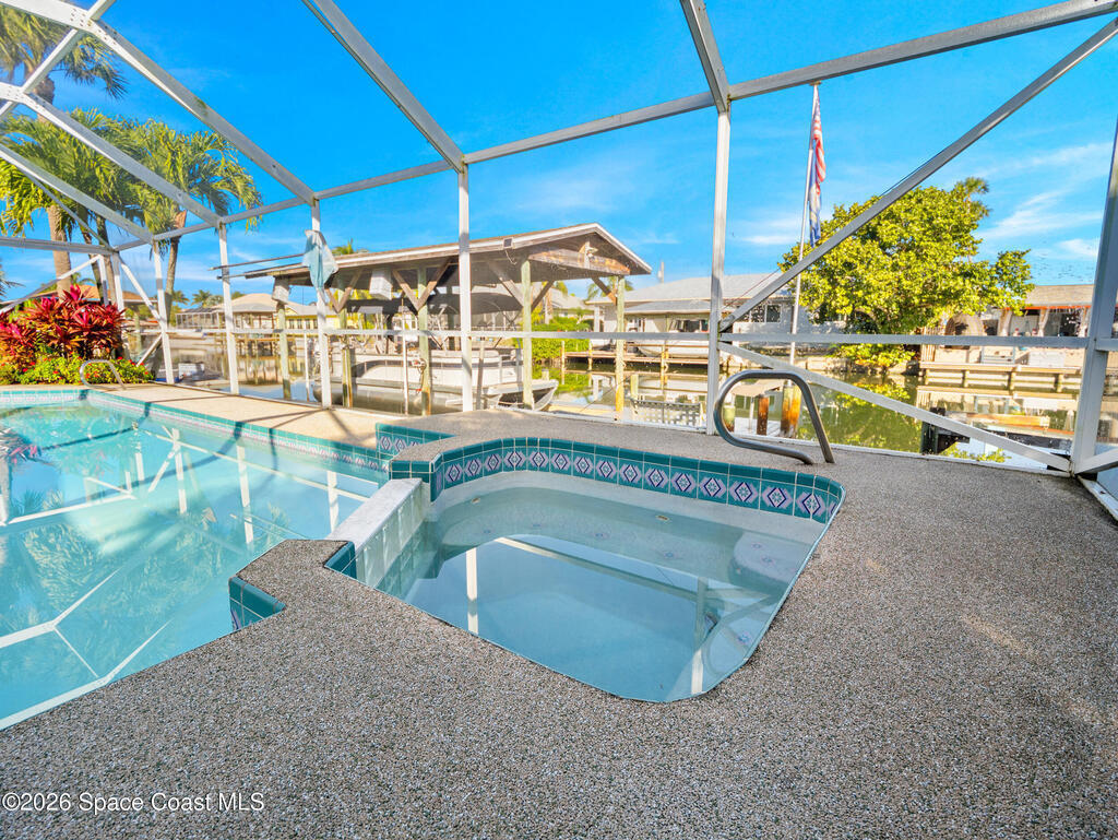 Stunning Sunnyland Beach waterfront home is located in much sought after Melbourne Beach. As you enter the home you will appreciate the high vaulted ceilings and views of sparkling screened in pool and waterway. Skylights in Primary Bedroom and Living Room. Open concept floorplan has kitchen with breakfast bar all opening up to spacious family room with fireplace and dining area. Big sliders and windows let all of the light pour in. Bring your boat to the covered dock and lift with area to fish and store kayaks. Spacious 2 car garage. Beach access has shower to rinse off and stairs to the sand.