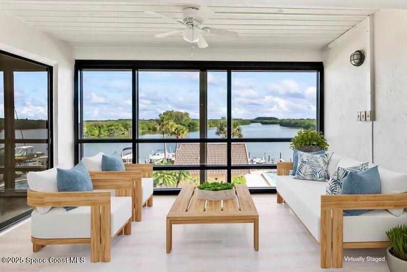 Truly mesmerizing direct riverfront views from this top floor 2 bedroom, 2 bathroom condo overlooking the Banana River in the heart of Cocoa Beach. Enjoy kayaking, boating and fishing from your backyard and playing golf at the 27 hole Cocoa Beach Country Club across the road from your front door. Watch manatee and dolphin play, the sun as it rises and the annual Christmas Boat Parade from the comfort of your private glass enclosed balcony. This updated condo features: New Air Conditioning unit, plantation shutters, storm shutters, all tile flooring, updated kitchen and bathrooms and is freshly painted. The community offers an elevator, large riverfront pool, gazebo, boat dock, kayak storage area, carport parking and much more. Just across the street is a public golf course, olympic sized swimming pool and tennis courts. The location couldn't be better... its quiet and yet close to the beach, shopping and restaurants. Come see the view and you will fall in love with this condo.