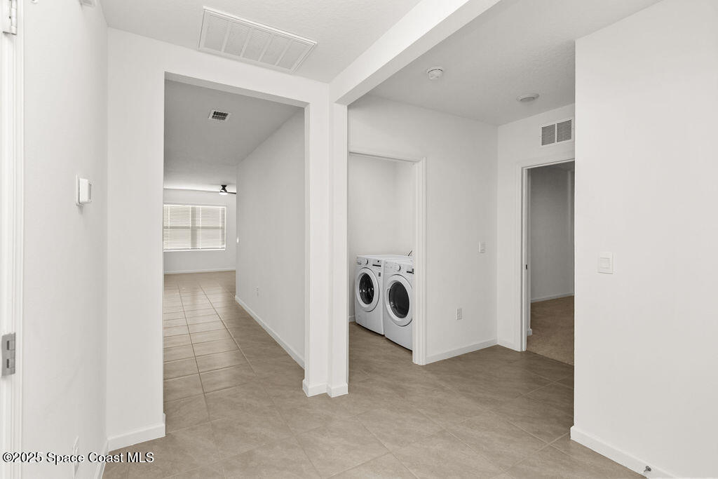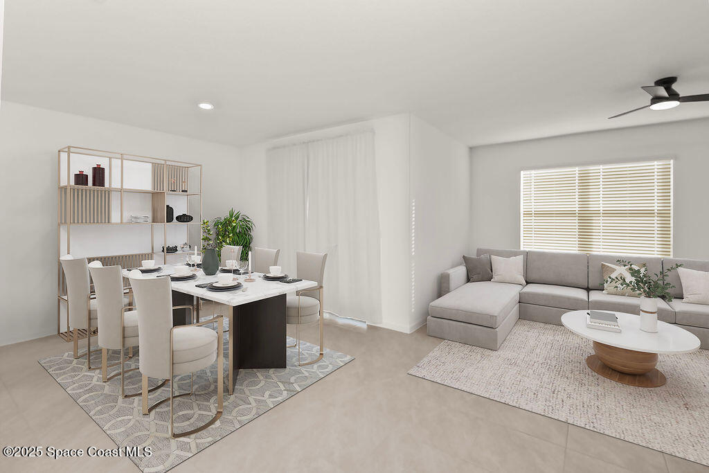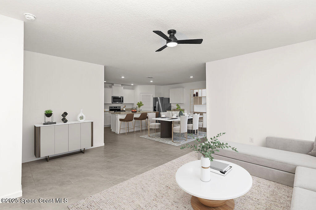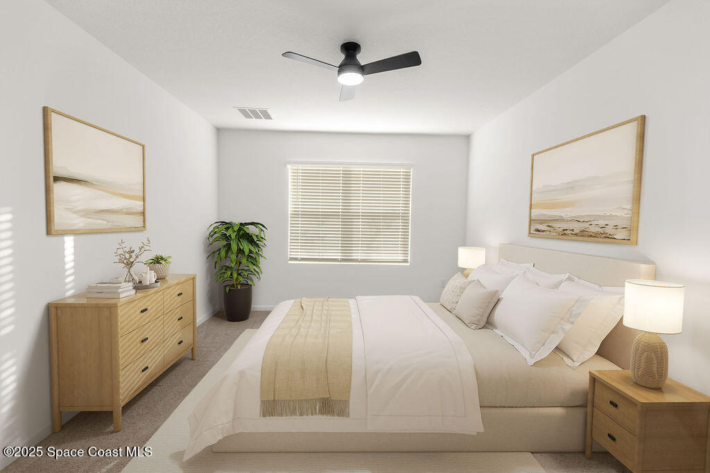 Florida living is encapsulated in this 4 bed, 2 bath single story home that boasts an open concept floor plan, convenience in location, & community. Upon entering the home off of the primary hallway you'll find two sizable bedrooms w/ample storage sharing the use of a full bath. An additional bedroom and laundry room can be found before entering the heart of the home which is a sprawling space that contains the kitchen, complete w/ white shaker style cabinetry, granite countertops, stainless steel appliances, anchored by a large center island. The prep space blends w/ ease into the dining room & off onto the living room making this grand area ideal for entertaining & gathering. The owner's suite is located off the living area w/split floor plan & privacy from the remainder of the home. A walk-in closet, dual sink vanity, & a spacious shower make this a perfect retreat. The home is situated on a level lot w/a charming covered patio overlooking the yard. Close to major routes & beaches
