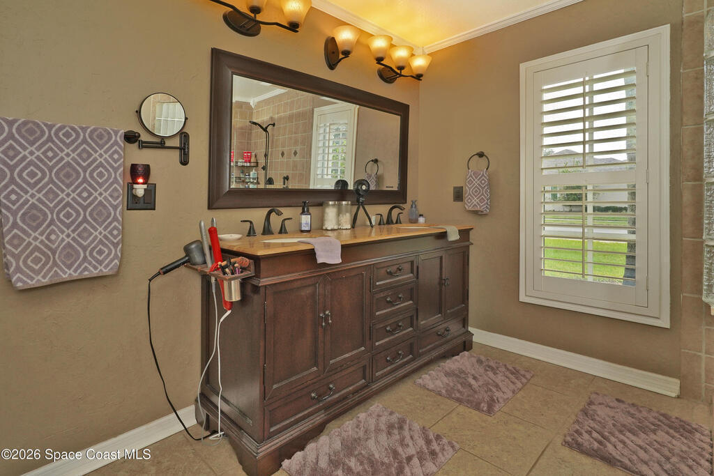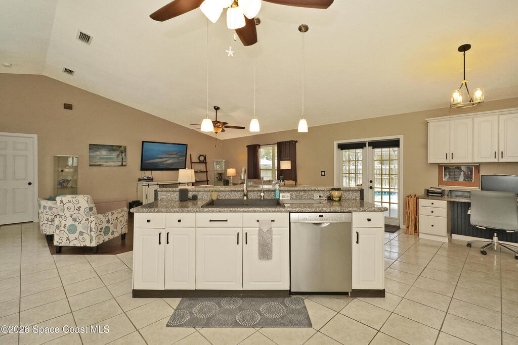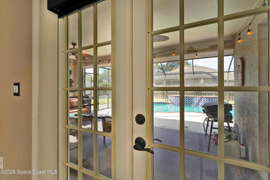This beautiful corner lot, 2,236 sq. ft. open plan home has 4 or 5 bedrooms , 2 baths, and a bright office (5th bedroom) area next to the kitchen, dining room, large family room with views of the enclosed pool deck and patio. There are ceiling fans in every room and the kitchen has stainless appliances including refrigerator, gas stove, lots of cabinet space, a roomy pantry, an island with sink and dishwasher overlooking the family room and has French doors leading to the patio and pool area. The large master bedroom with a large walk-in closet, and a grand bathroom with a double sink vanity, a step-up tub, and a separate glass brick shower. The 2-car garage has storm shutters for the whole house and water treatment equipment. Brand new AC This friendly Windsor Estates neighborhood has a recreation area with a tennis court, basketball court and kids playground gym, is near shopping, churches, schools, parks and restaurants, and is 50 miles from Orlando and 5 miles to the ocean beaches