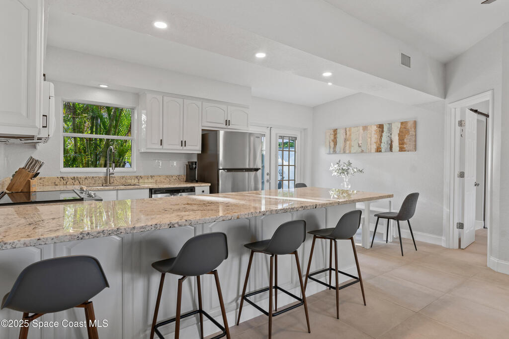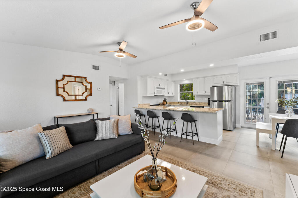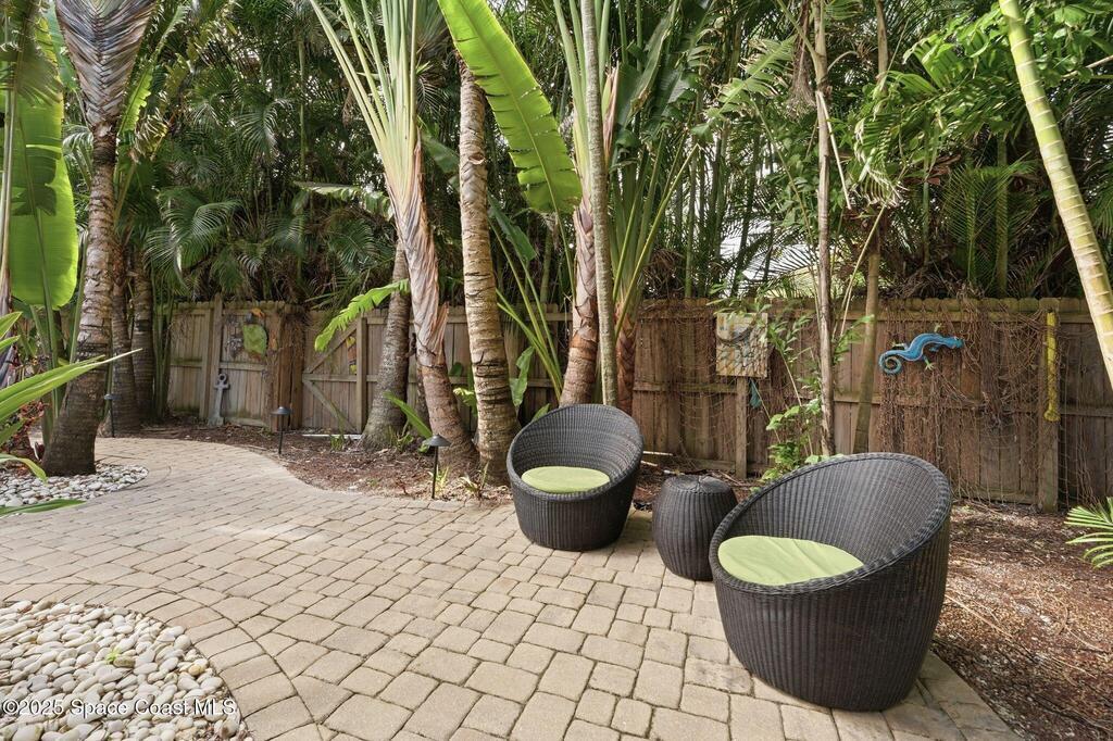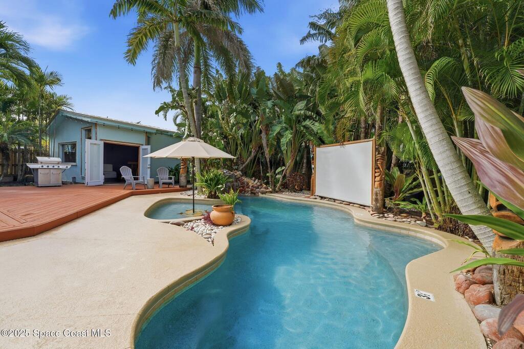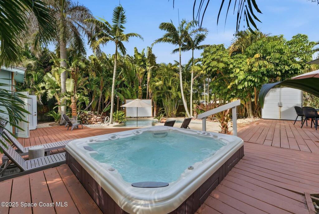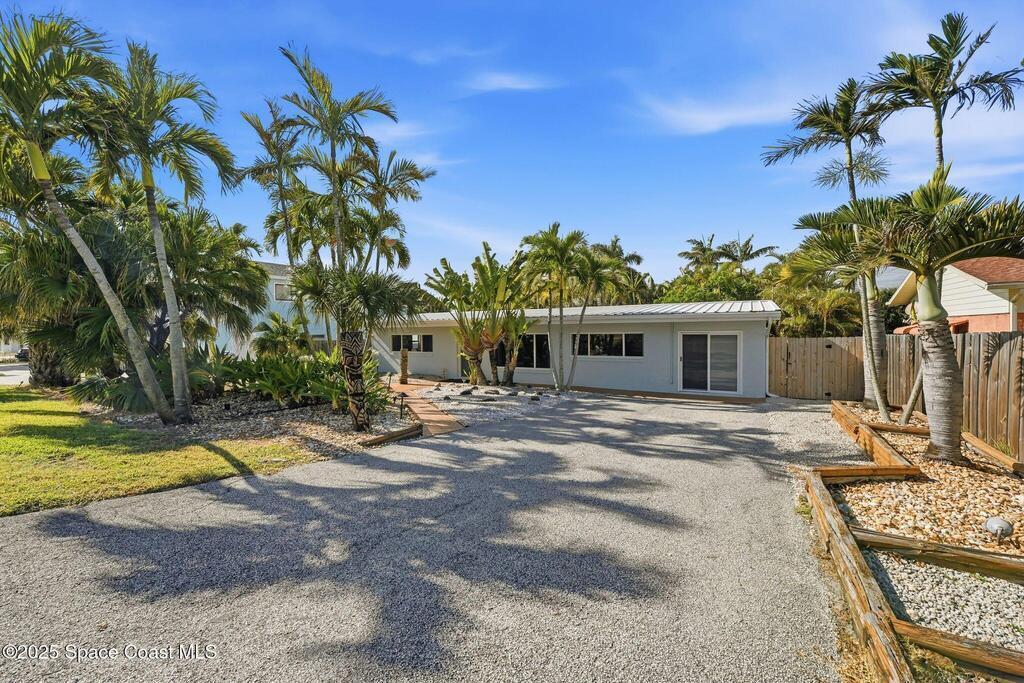 Welcome to Exclusive Tropical Paradise, where mid century character meets modern ease, just steps from the beach and tucked into a lush, Florida poolside escape. Imagine being on your own private island with a fully remodeled concrete block home featuring a split bedroom floor plan, central living spaces, impact windows, upgraded kitchen and baths, and a tropical backyard retreat with a built in tiki bar on a spacious quarter acre lot. With neighbors on only two sides and a private alley behind, privacy is a standout feature. This oasis works just as beautifully as a personal residence as it does as an investment. It has been a top performing Cocoa Beach vacation rental for the past six years, and offered fully turnkey. The location seals the deal. Access to a more remote section of the beach and minutes to Cocoa Beach, you are close to dining, shopping, and local favorites while still enjoying a quiet, one of a kind setting.