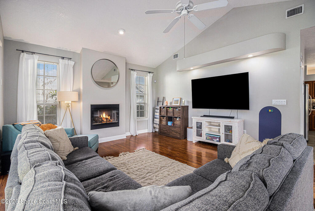 Elegantly set along the 17th hole of The Savannahs Golf Course, this 4-bedroom, 2.5-bath residence offers serene golf course and nature sanctuary views within one of Merritt Island's most desirable communities. A thoughtfully designed floor plan welcomes you with formal living and dining rooms accented by vaulted ceilings, creating a bright and sophisticated atmosphere.The expansive kitchen serves as the heart of the home, featuring Corian countertops, stainless steel appliances, abundant cabinetry, and an open flow ideal for entertaining. The adjacent family room showcases a wood-burning fireplace and panoramic views of the fairway and backyard, blending comfort with timeless elegance. The primary suite is a private retreat with double sinks, a walk-in shower, Jacuzzi tub, and spacious walk-in closet. Outdoors, enjoy peaceful mornings and sunsets surrounded by mature landscaping, and local wildlife. This home offers refined Florida living in a premier golf course setting.