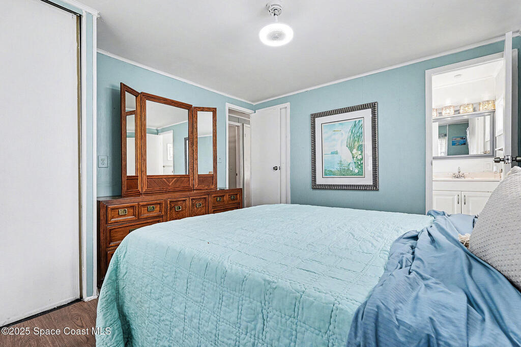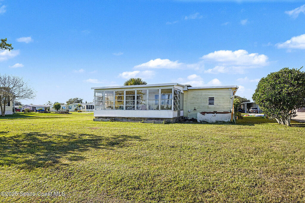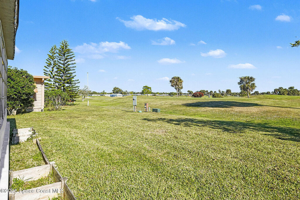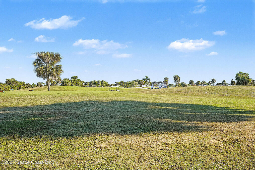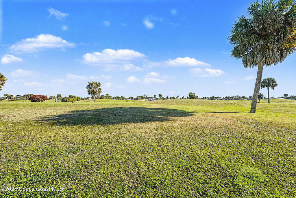 One of the most sought after locations in Barefoot Bay. This home sits facing the 7th Green of the Public Golf Course and has a vacant lot next door giving space between your neighbors. The bedrooms are spacious with loads of natural light. The carport is large, the home has newer cabinets, flooring and the washer and dryer was moved inside the unit from the outside shed. The metal roof was put on in 2004. HOA dues paid annually are in taxes.